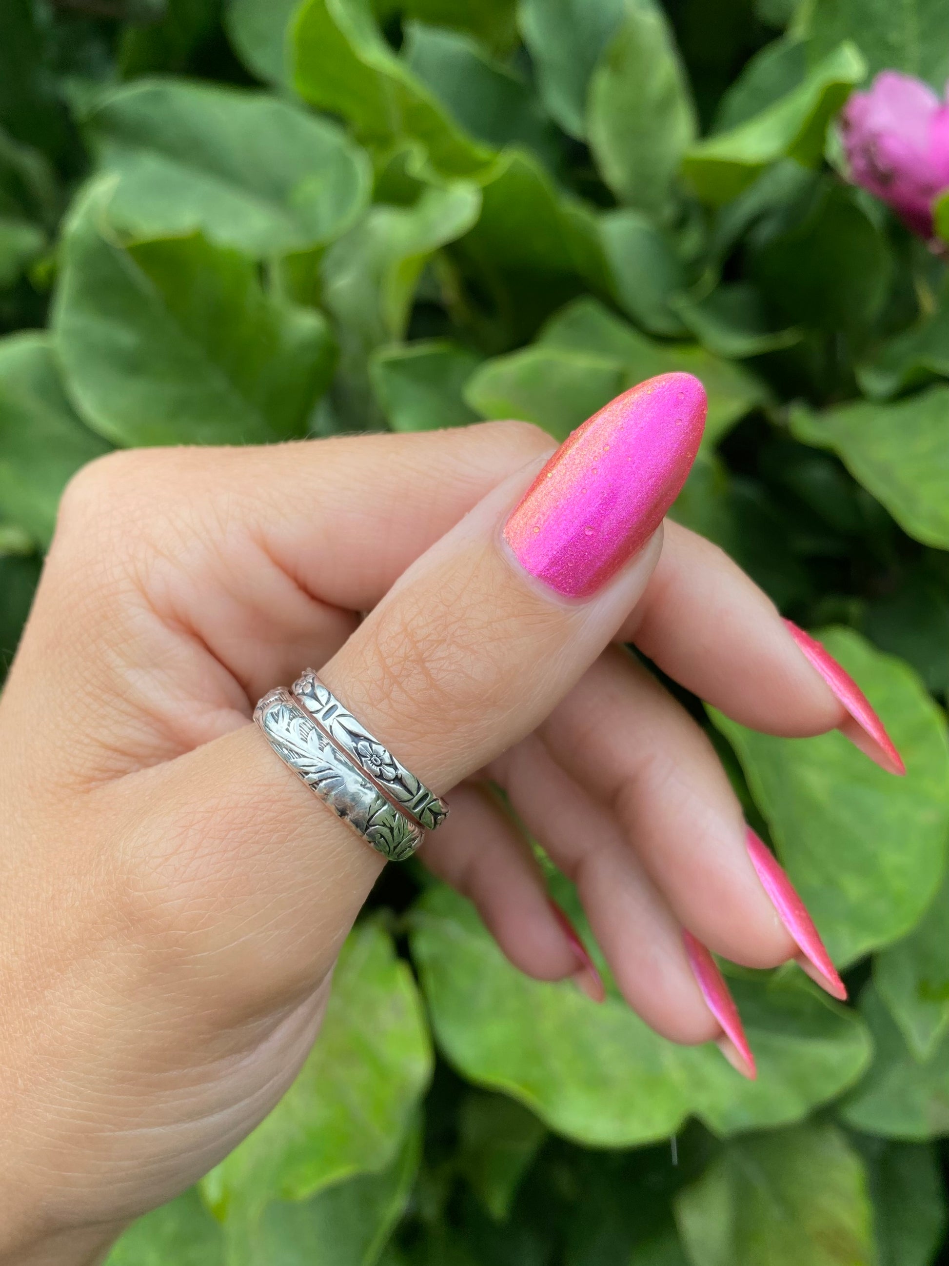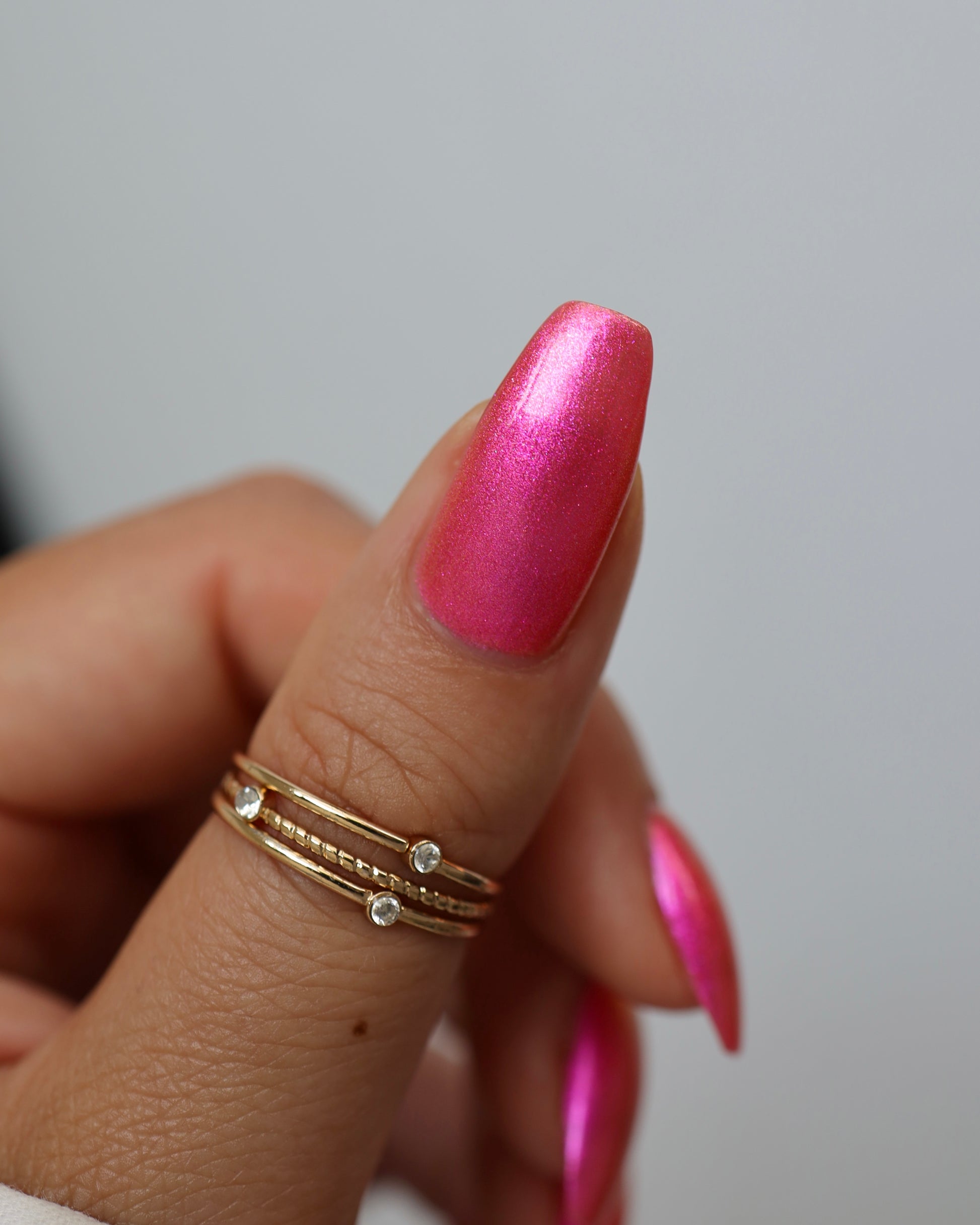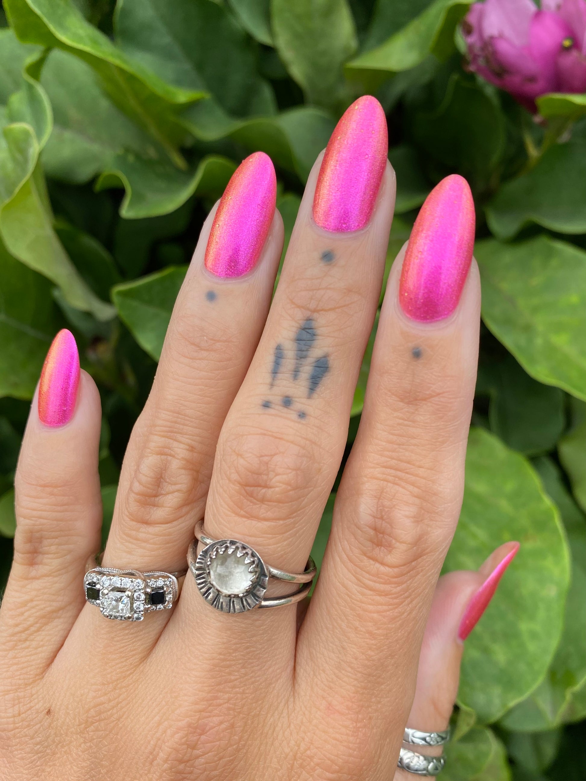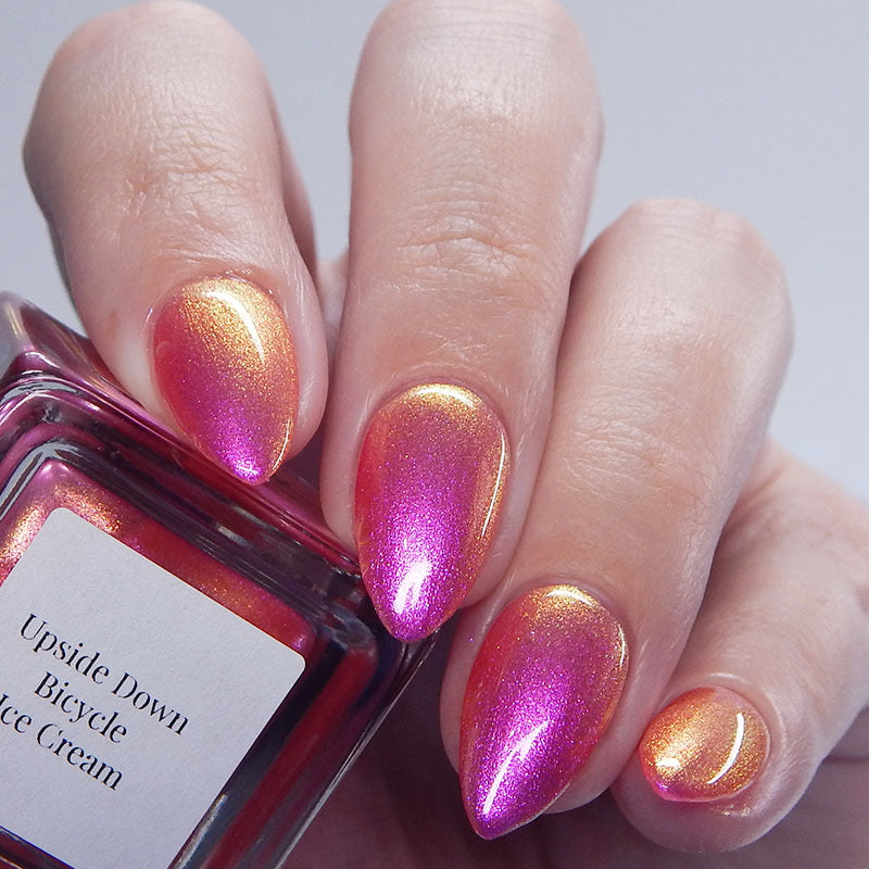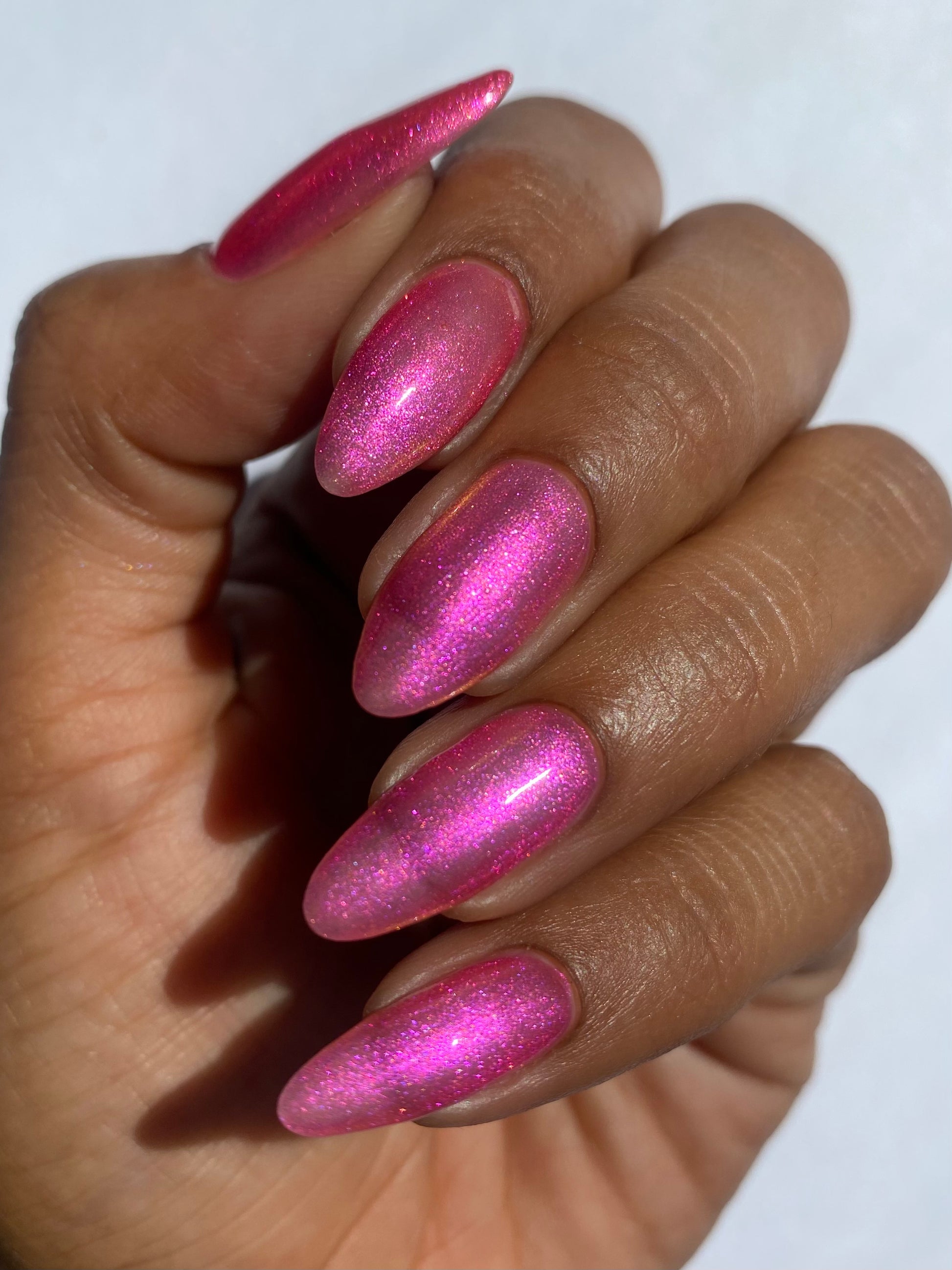 A coral jelly base with aurora shimmer that shifts from magenta to orange to gold to green