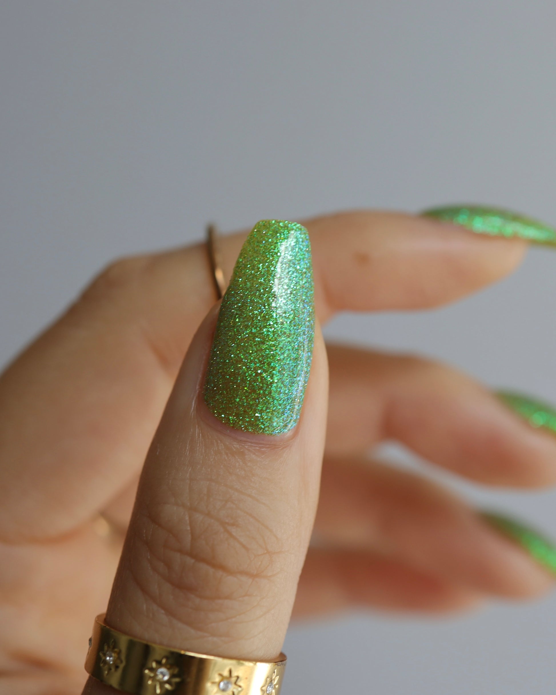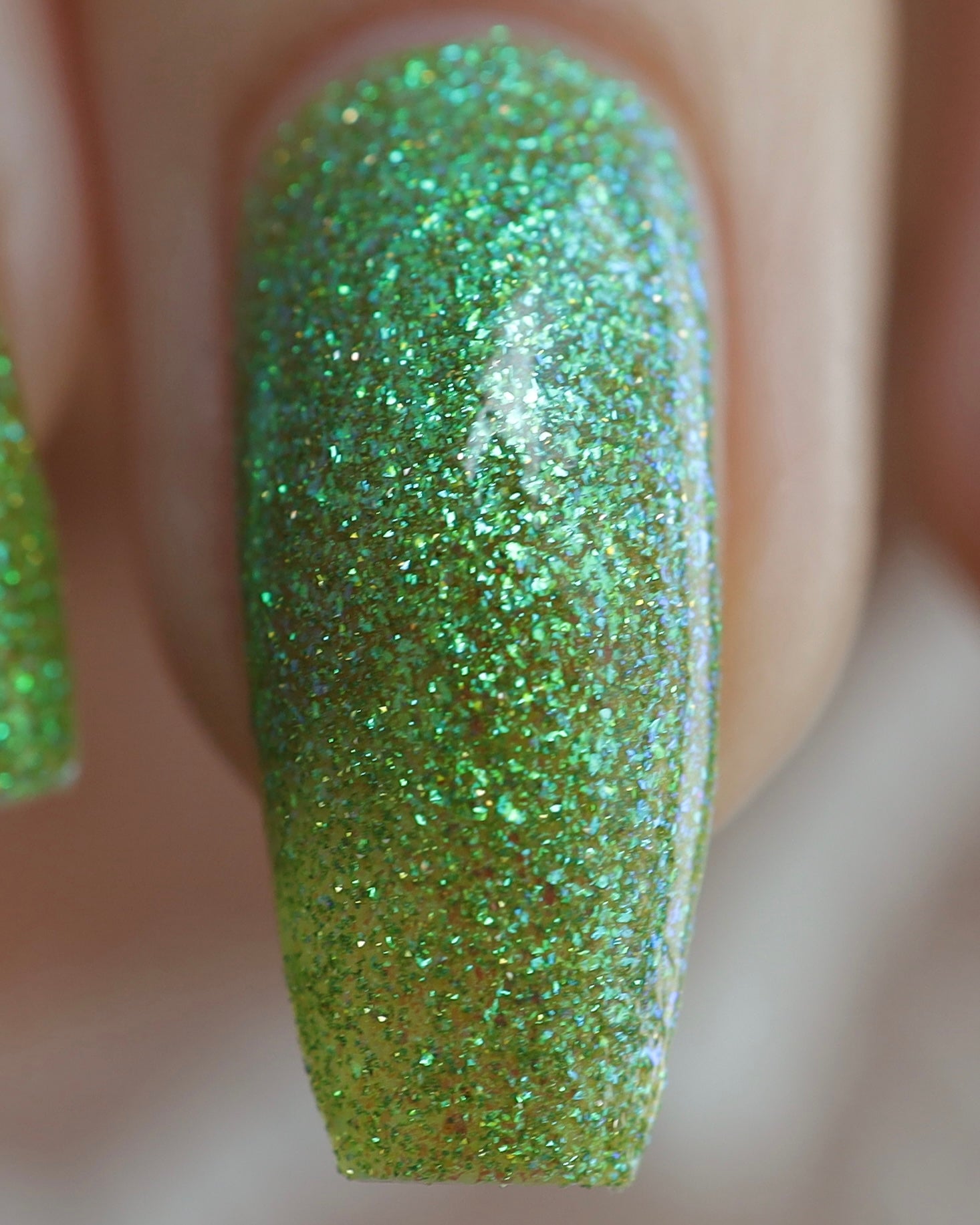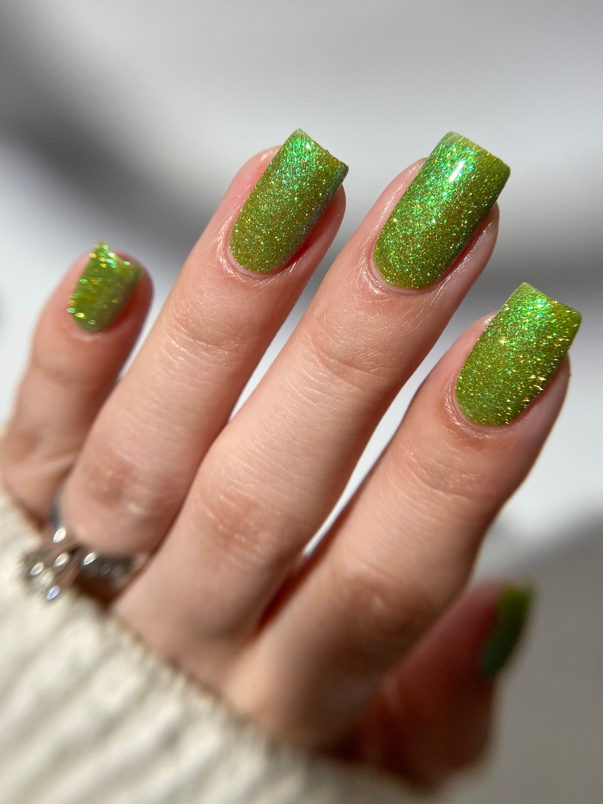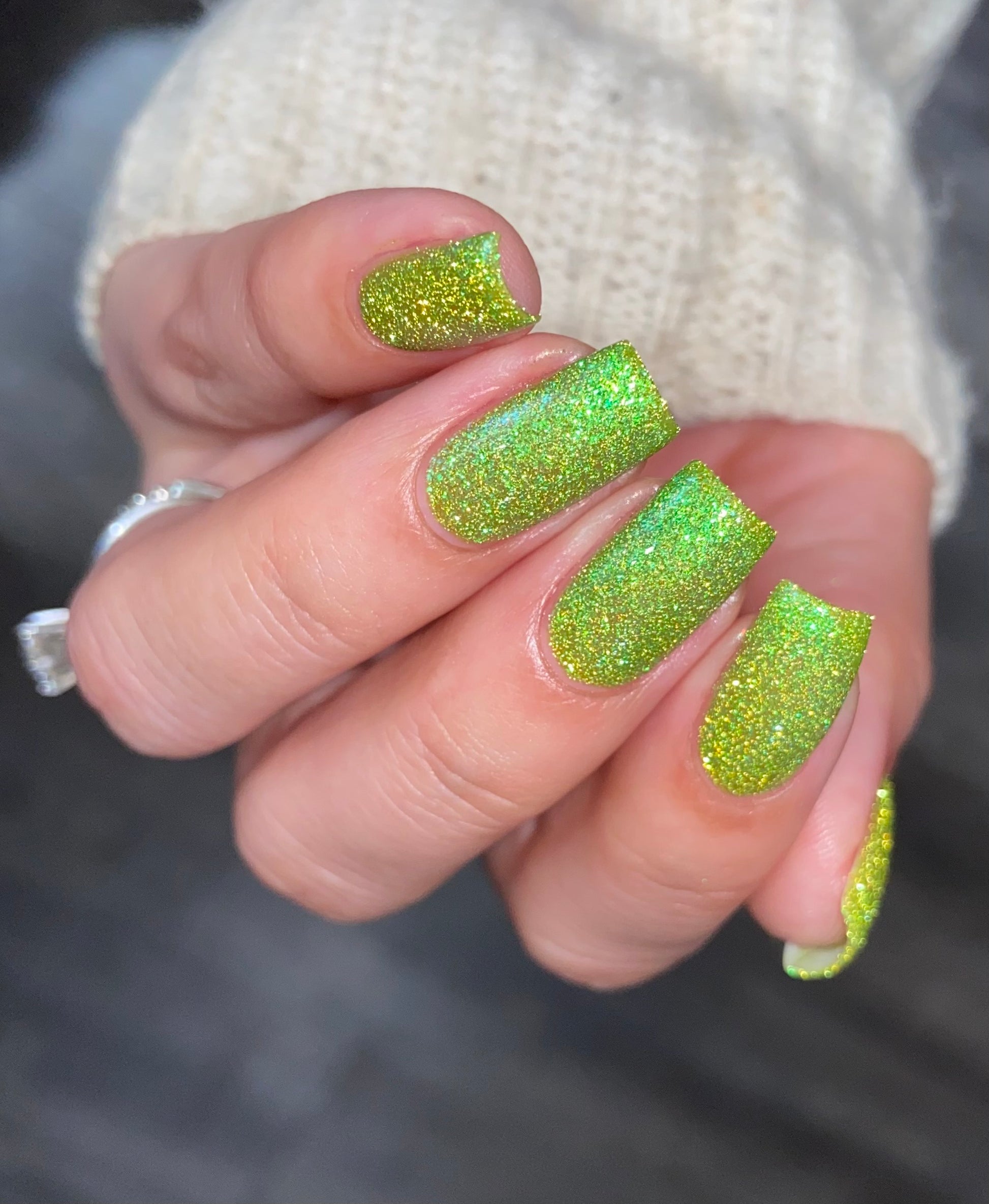 Please note: Reflective glitter polishes are textured and dry down with a gritty, sandpaper feeling. To make them look smooth and glossy, I recommend applying 2-3 coats of the polish, then applying one coat of a glitter smoother, followed by one coat of top coat.