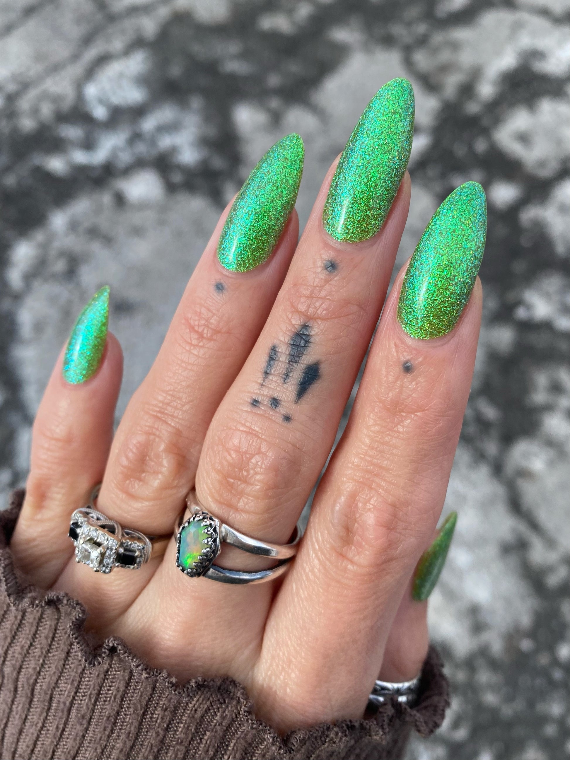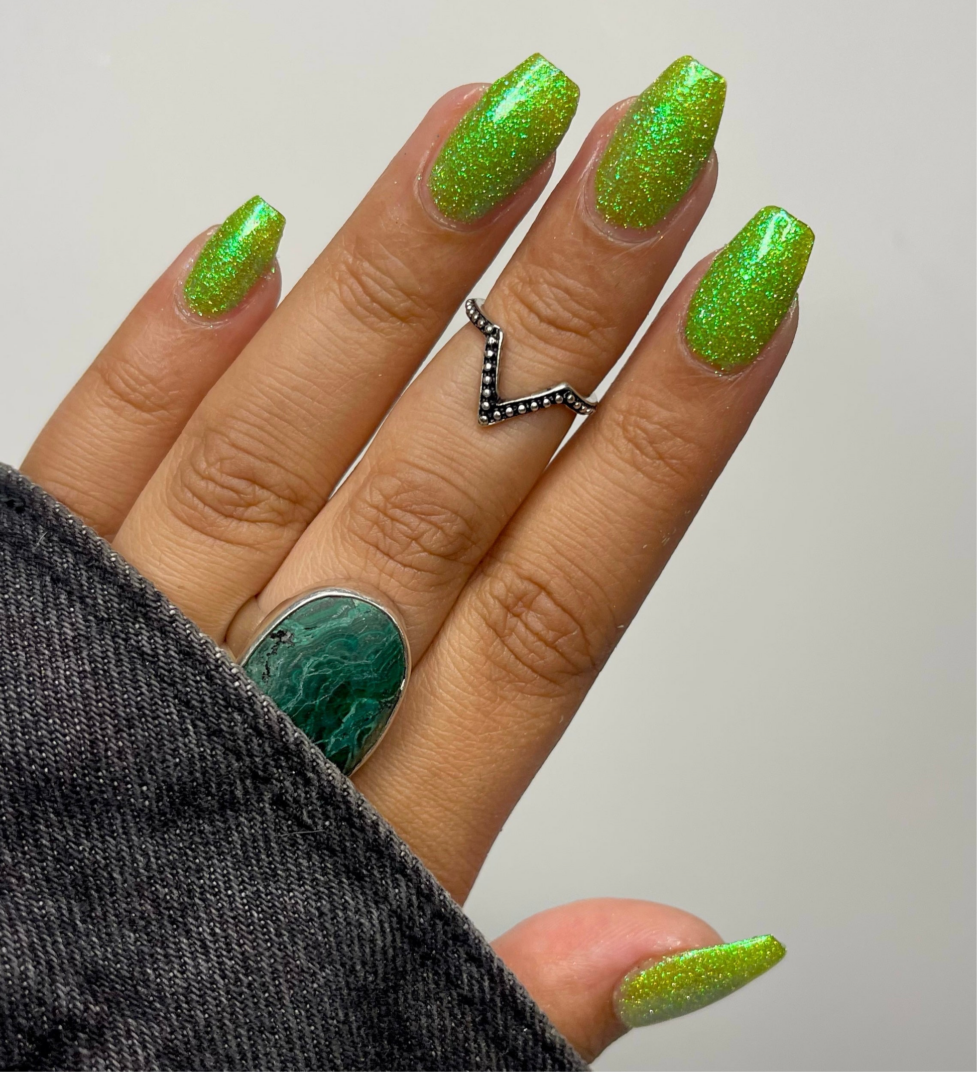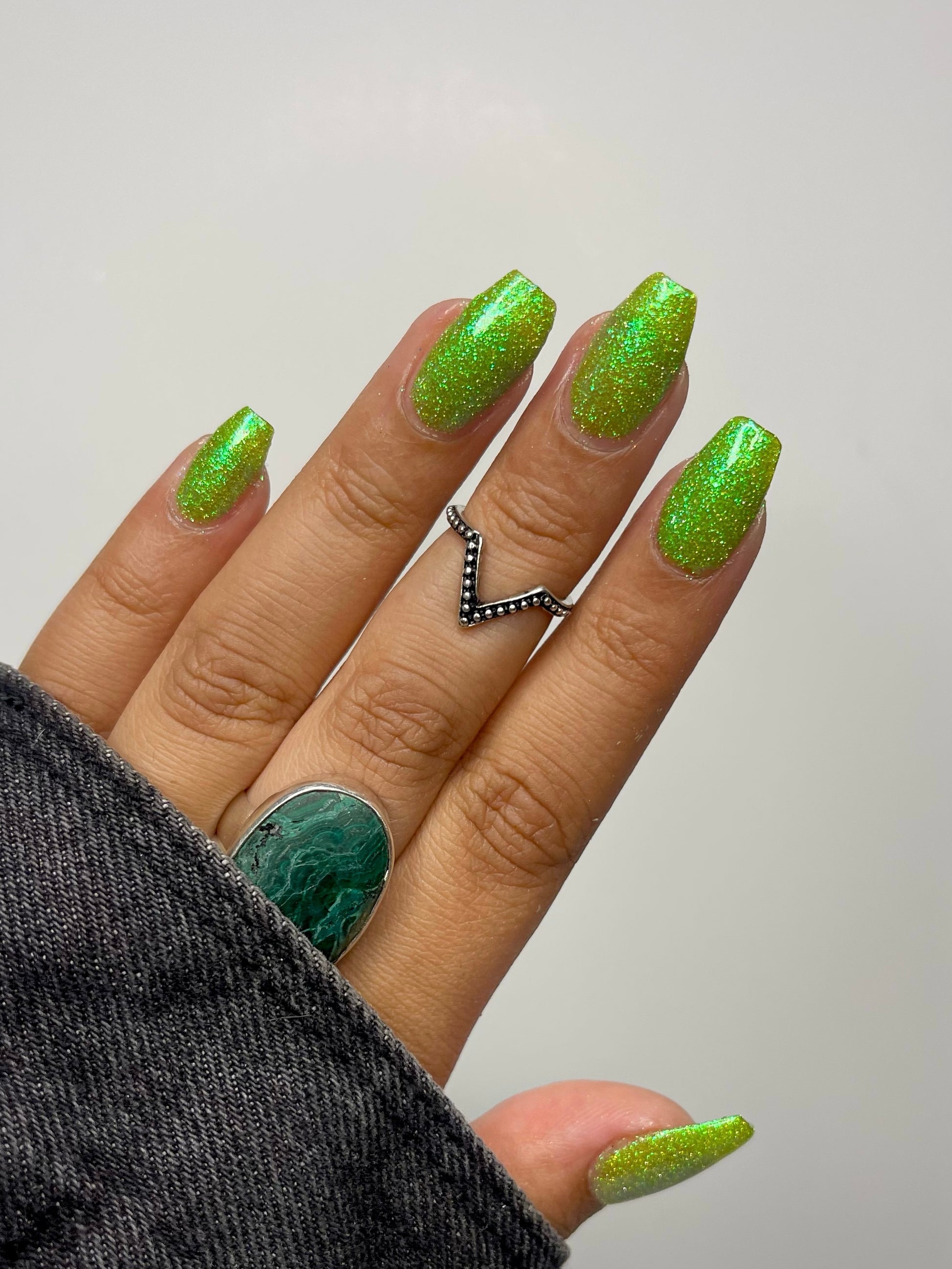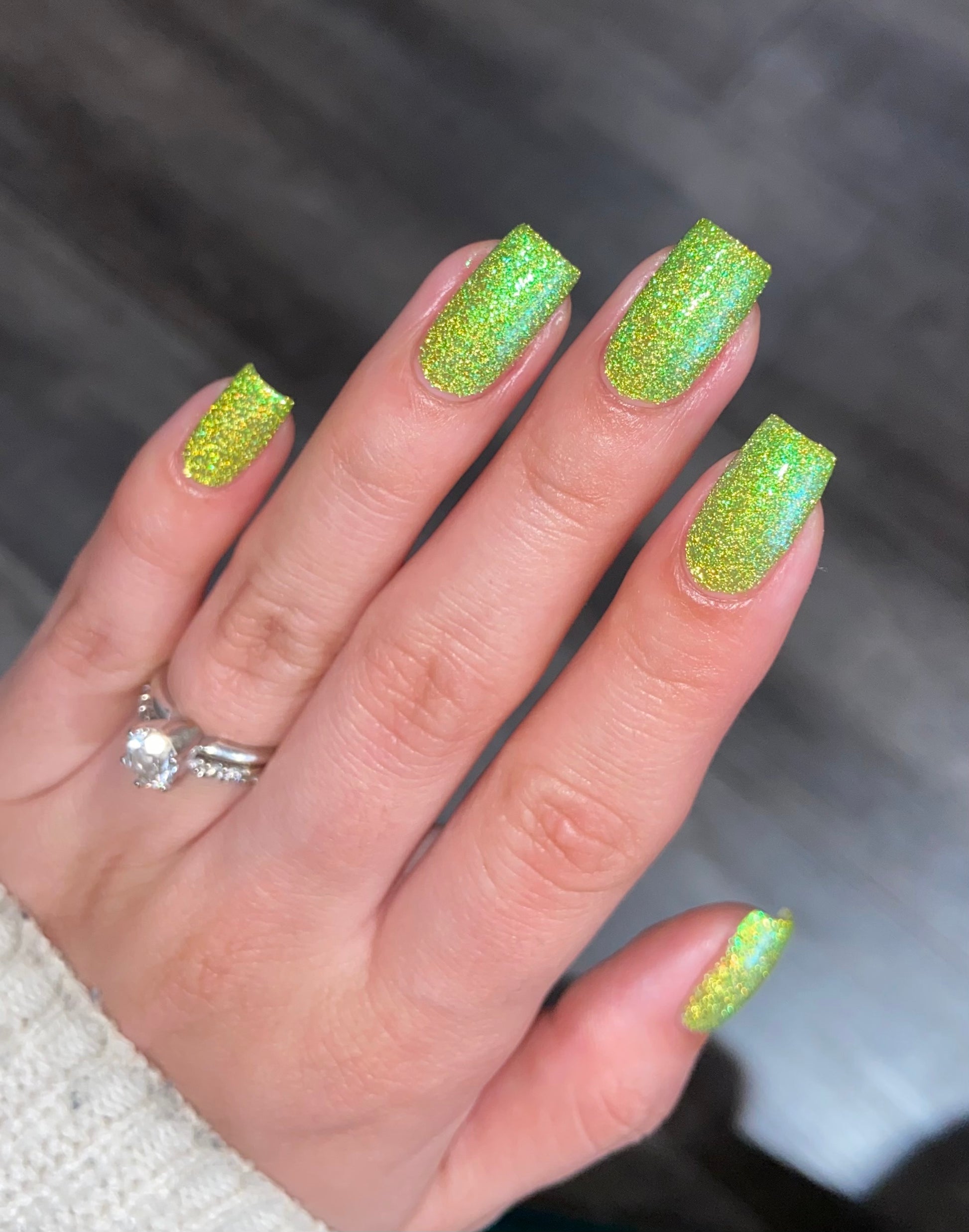 Please note: Reflective glitter polishes are textured and dry down with a gritty, sandpaper feeling. To make them look smooth and glossy, I recommend applying 2-3 coats of the polish, then applying one coat of a glitter smoother, followed by one coat of top coat.