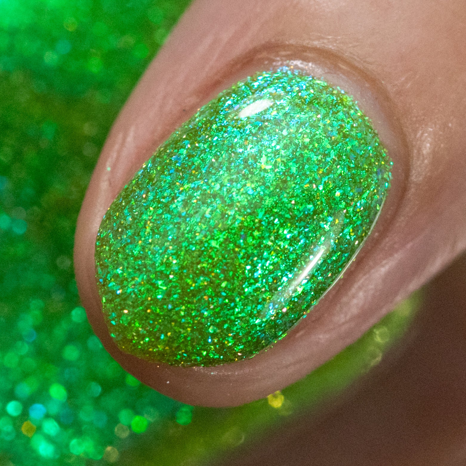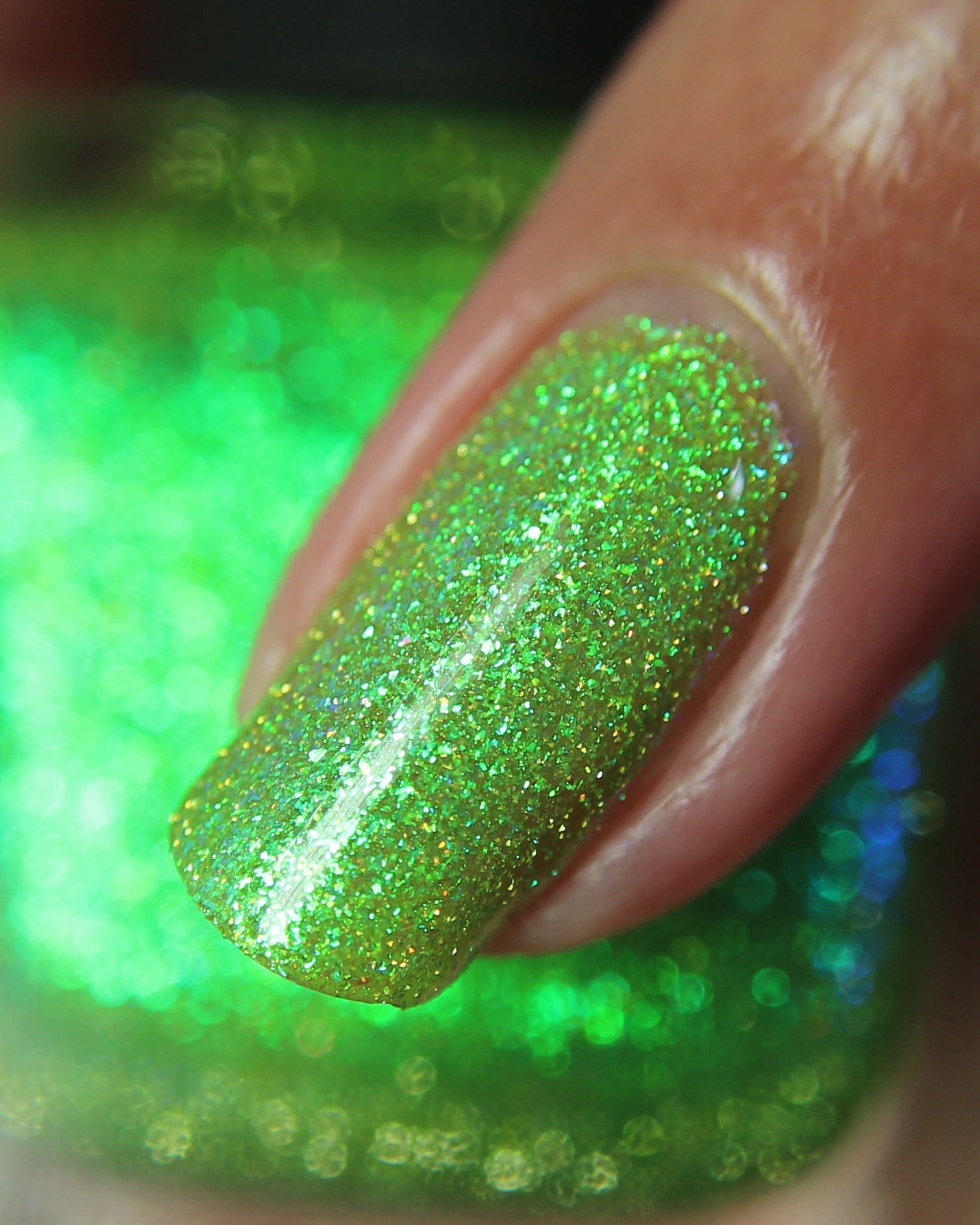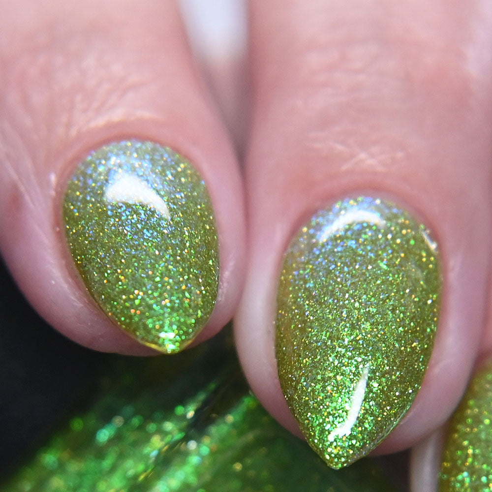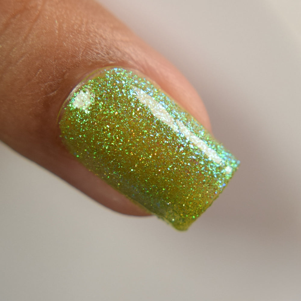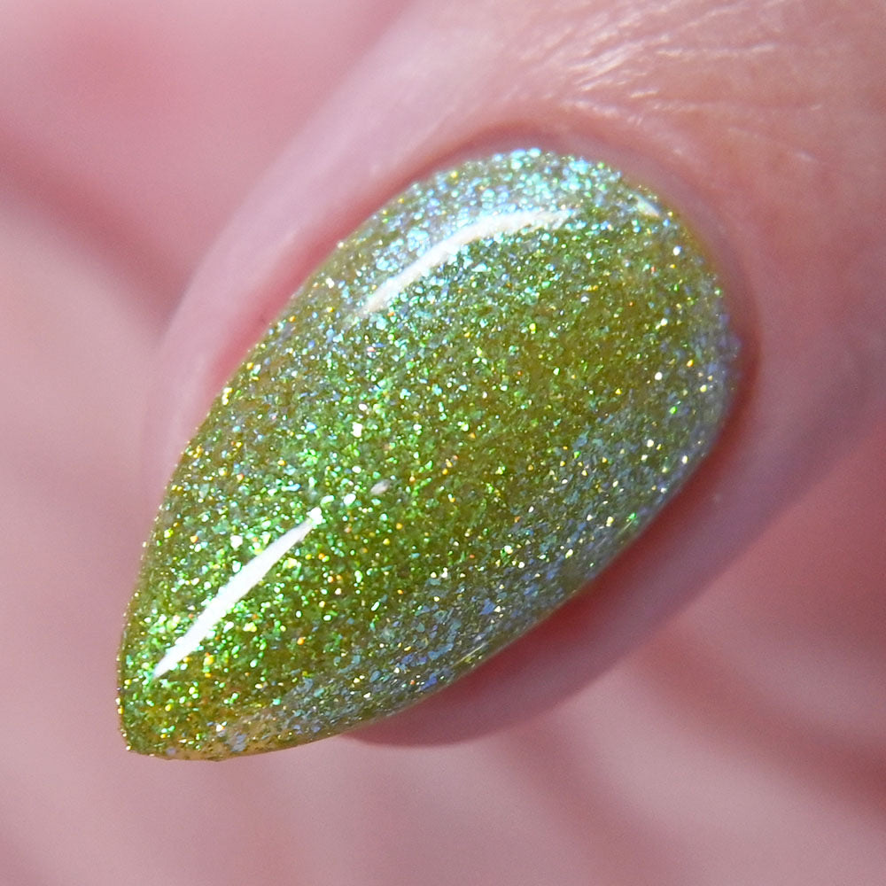 A yellow-green base with green to blue aurora microflake and yellow light reflective glitter