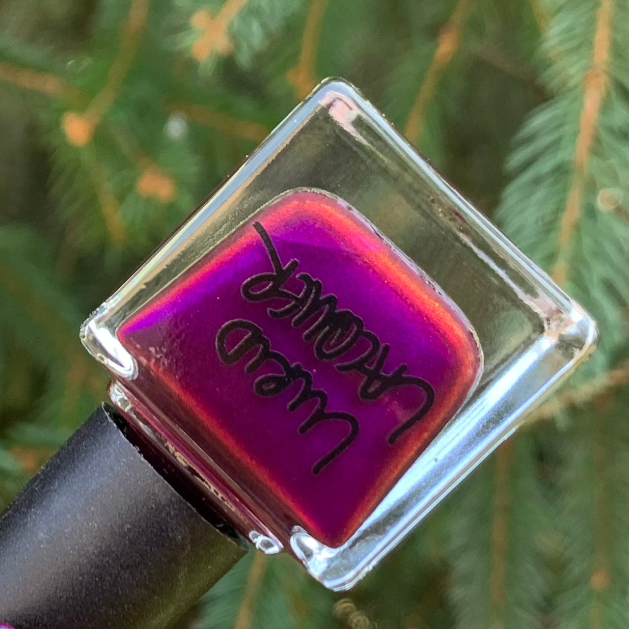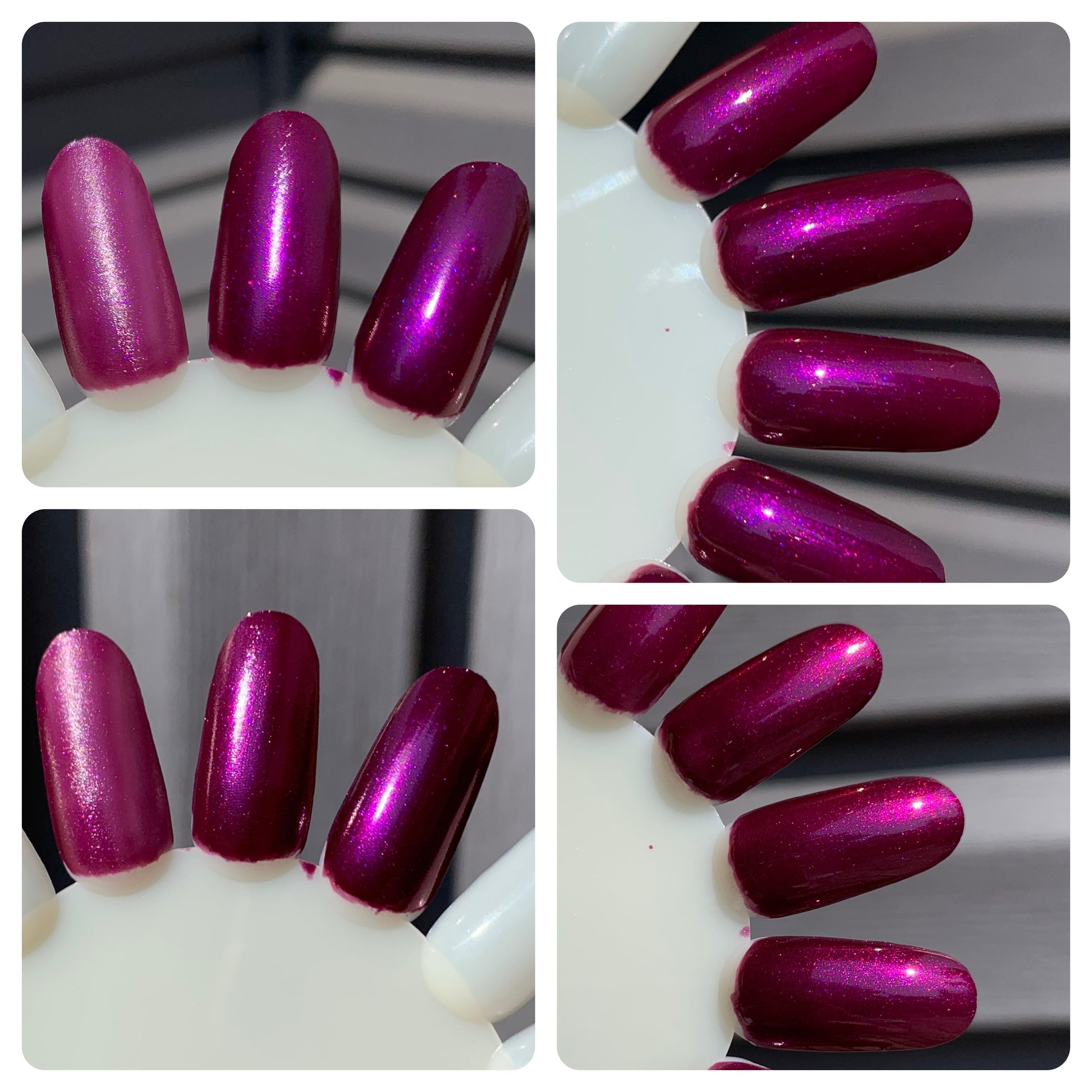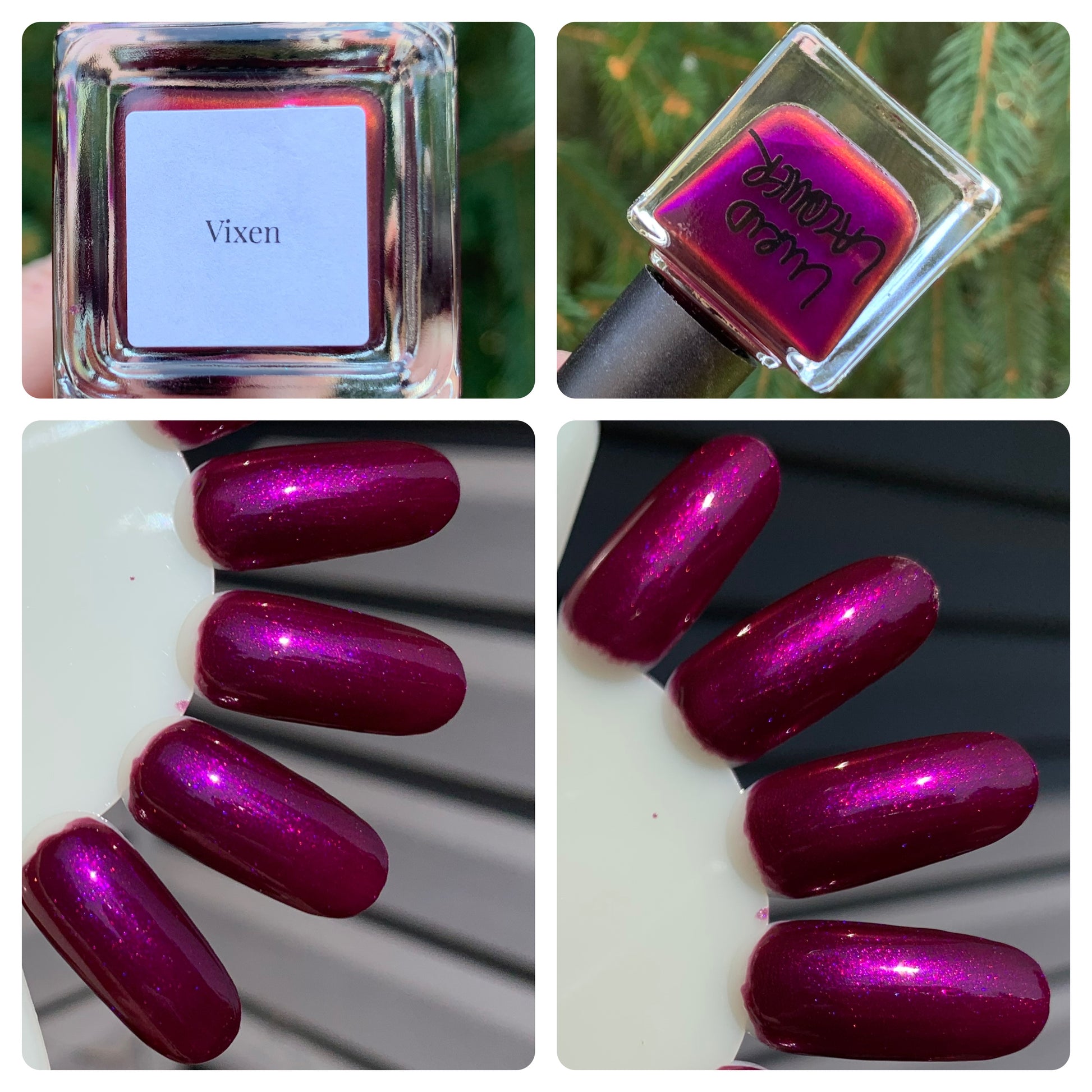 Vixen features a blackened maroon base with fine particle aurora shimmer that shifts from purple to pink to red. (This is the same beautiful shimmer that is in Indomitable and A Rose Amongst the Weeds.)