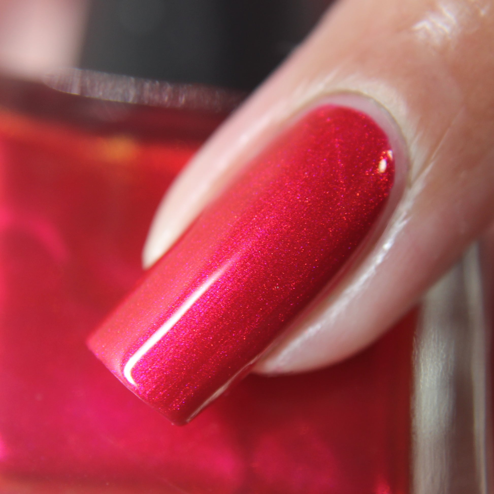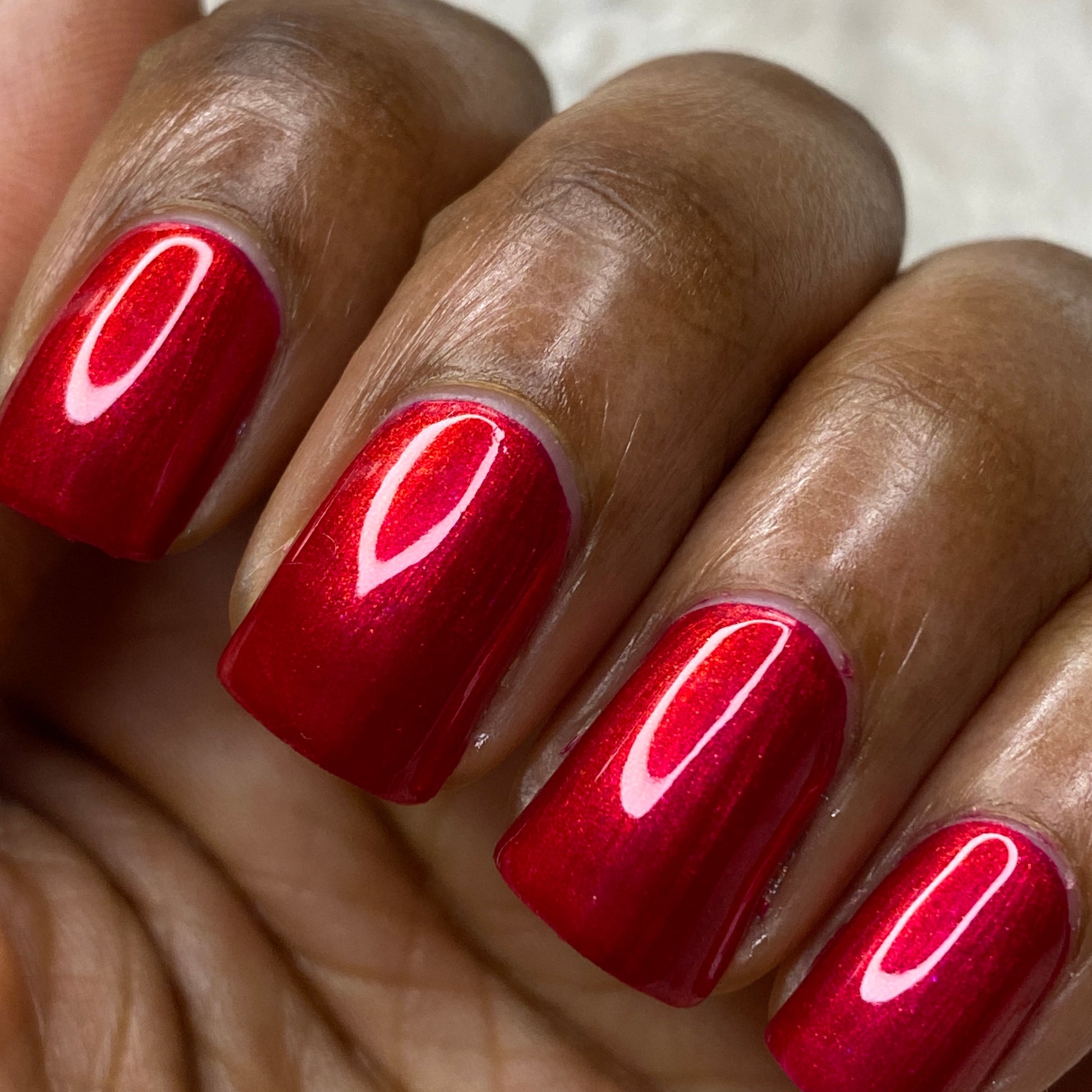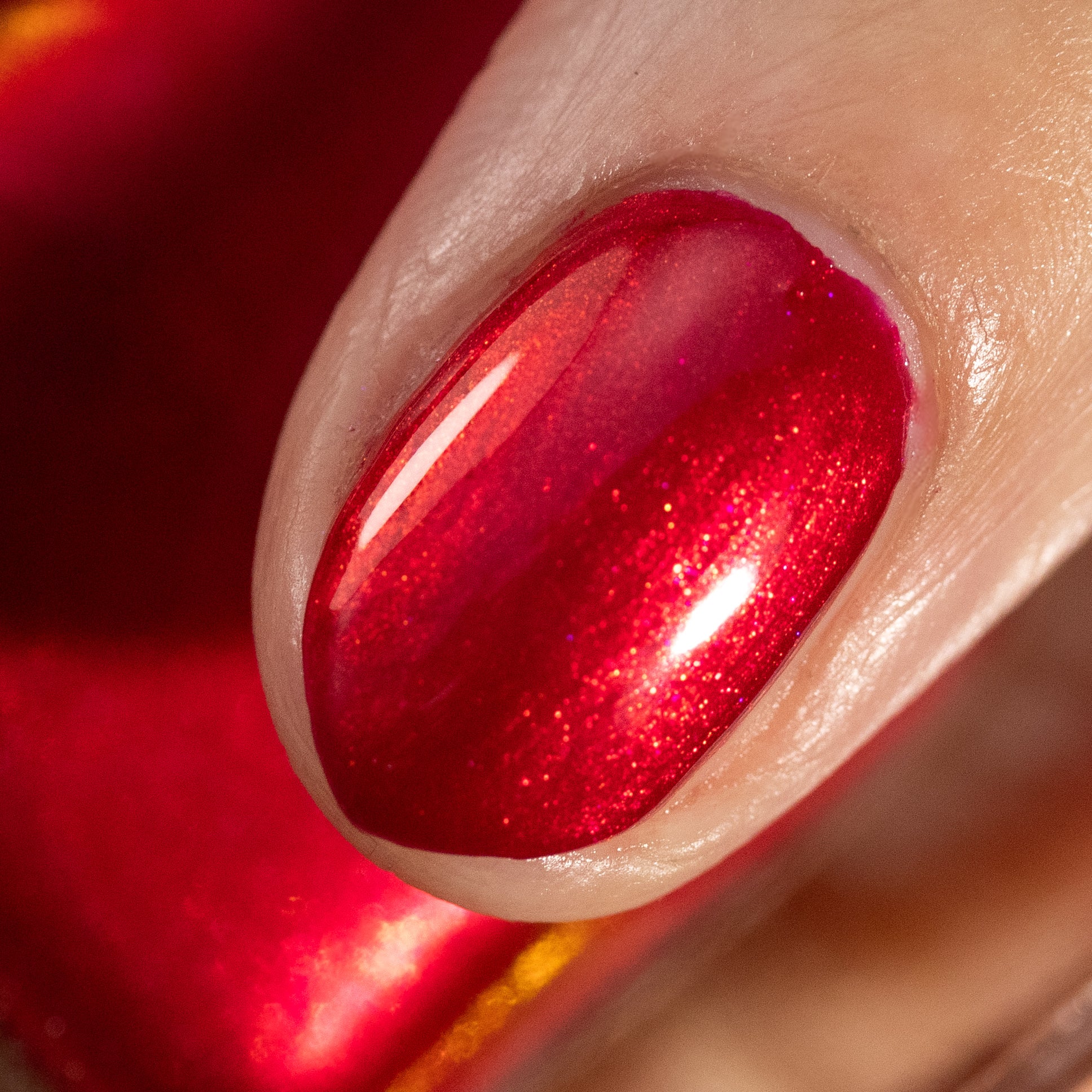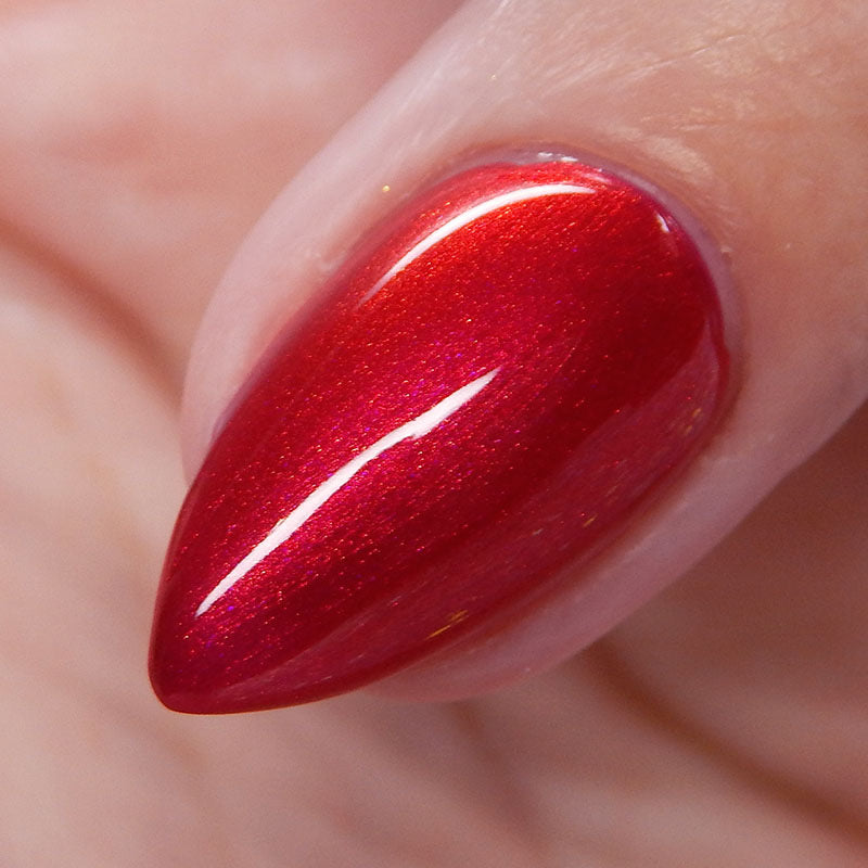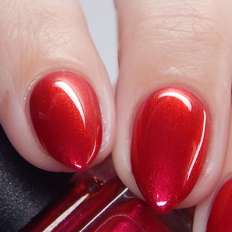 A cherry pinkish-red jelly base with vibrant red to orange shimmer (in some lighting, the base color appears a vibrant deep pink and in other lighting, it appears red)
