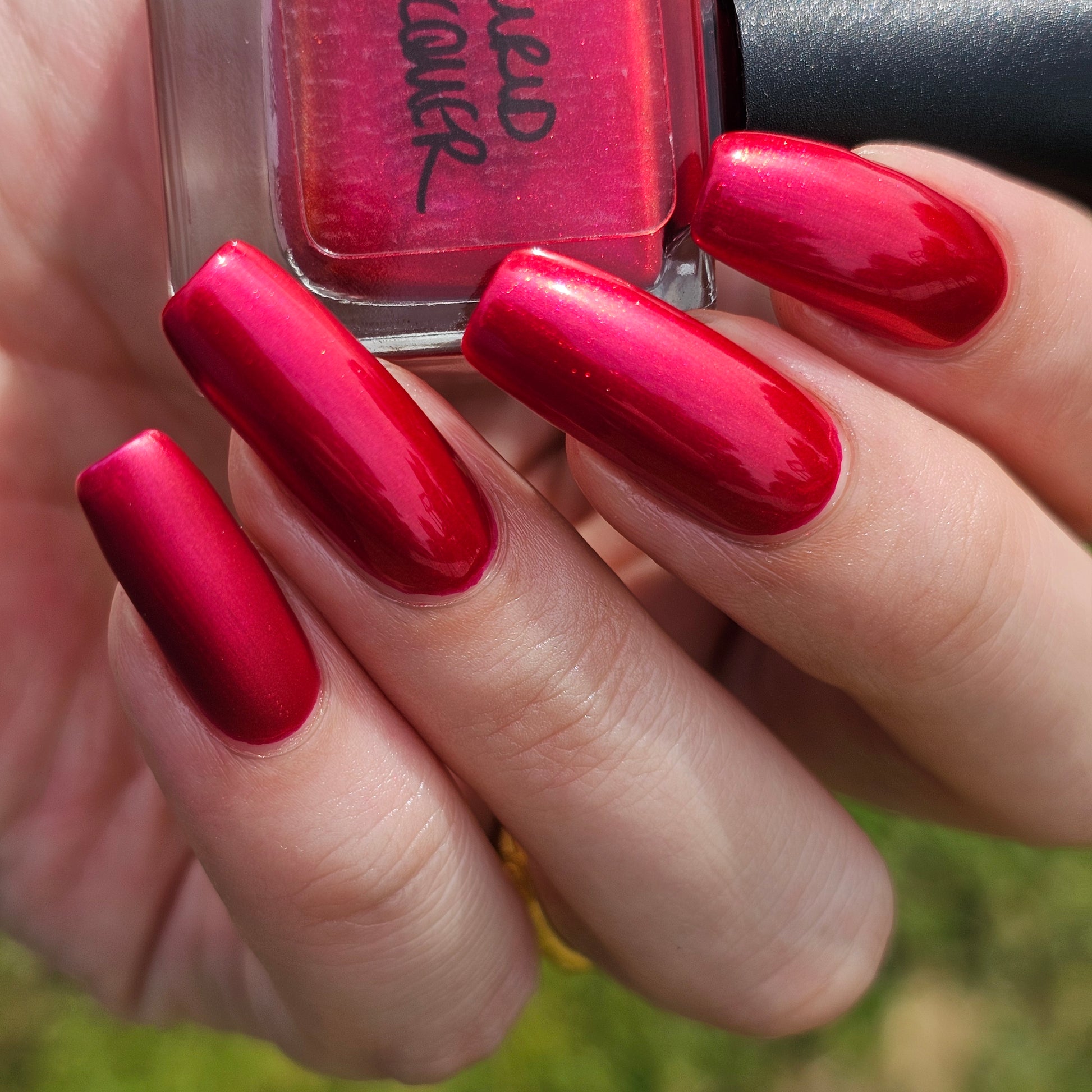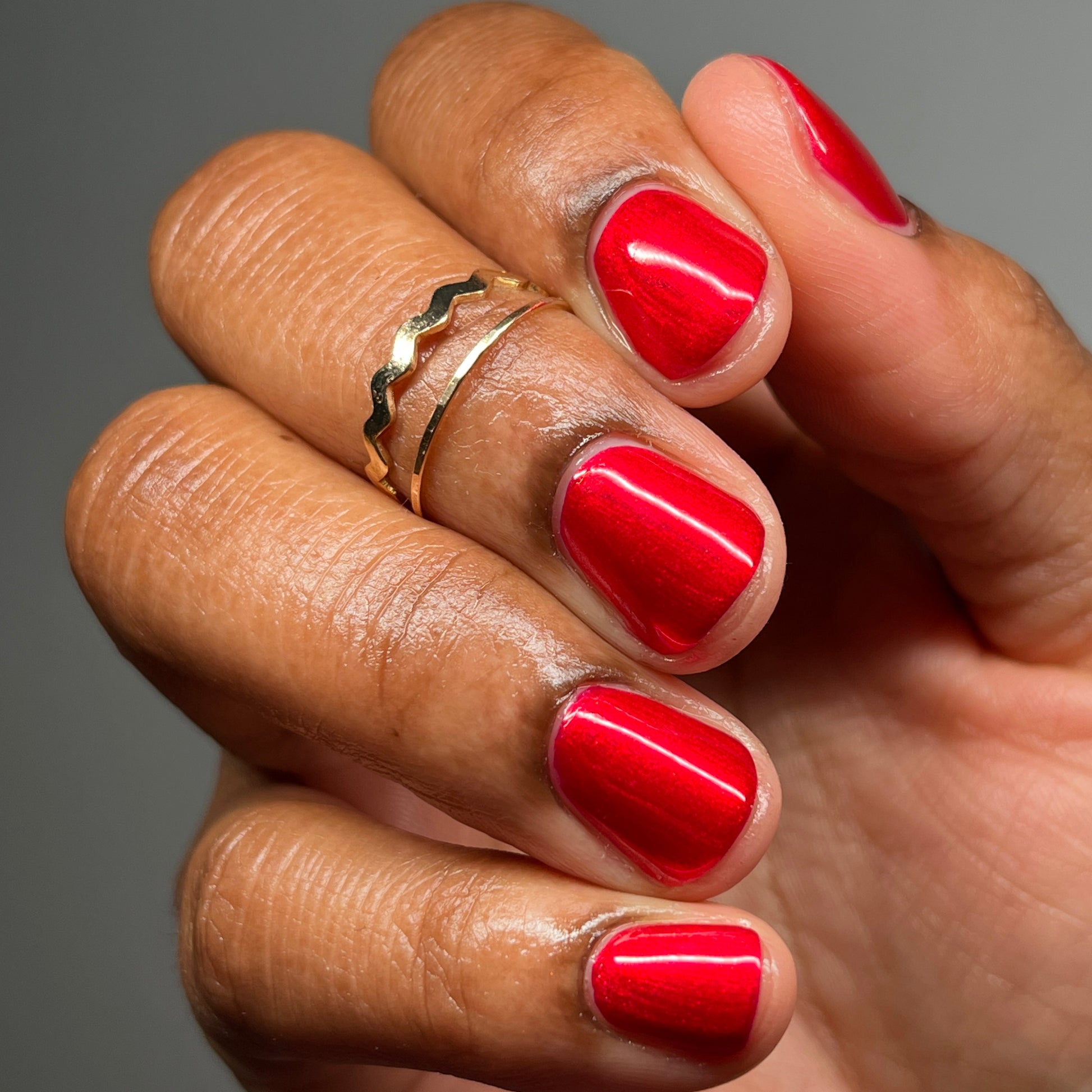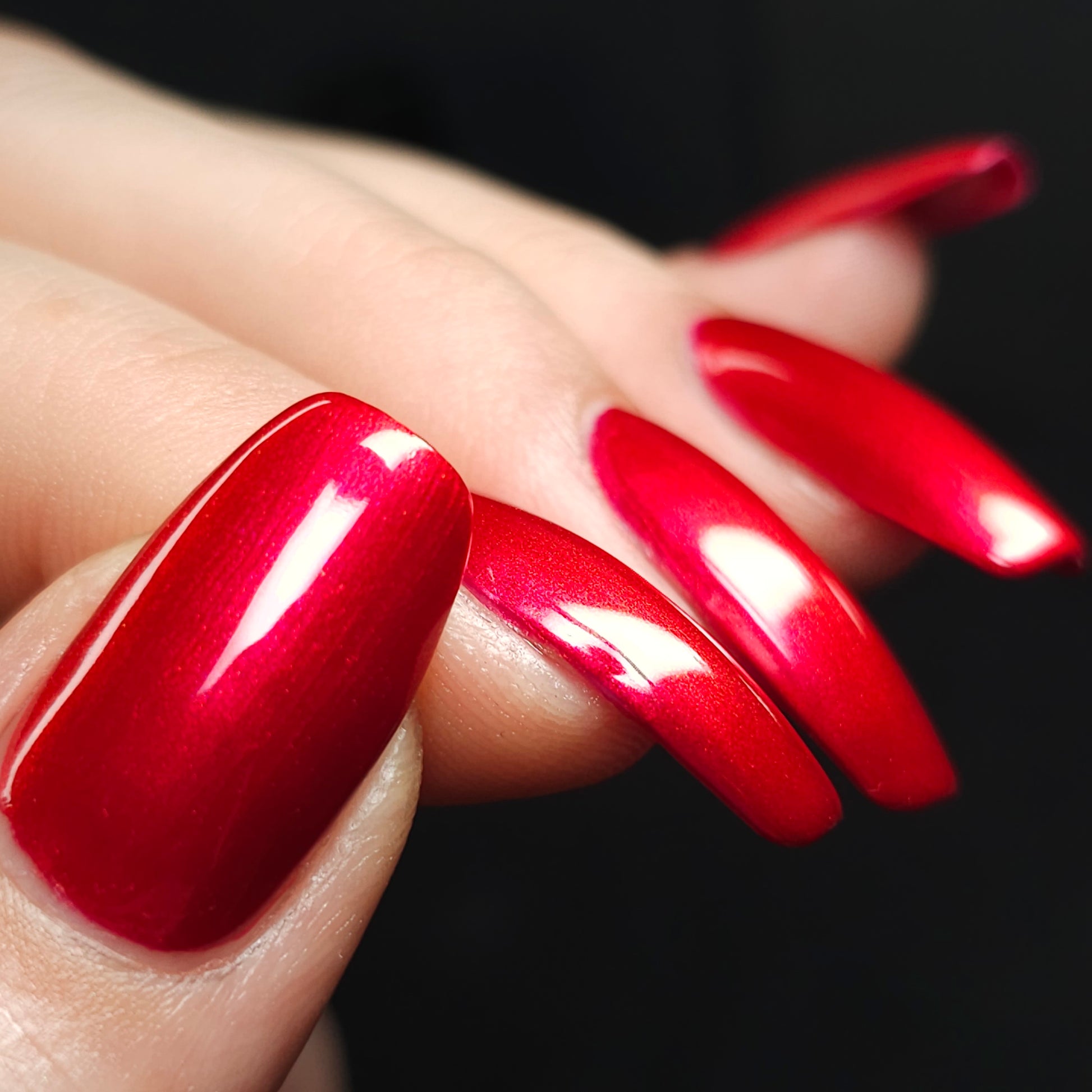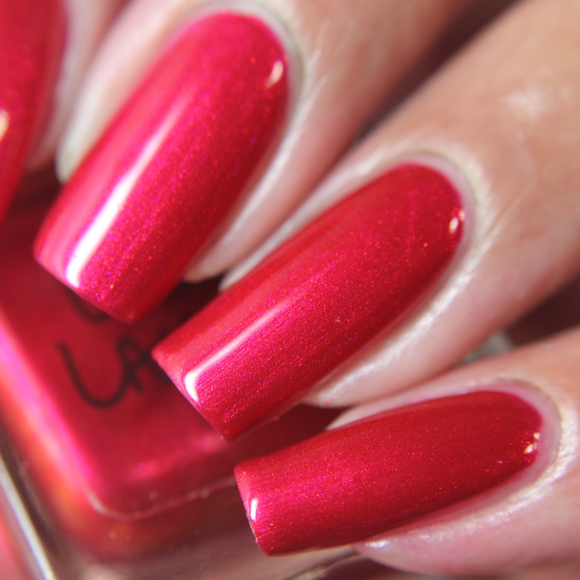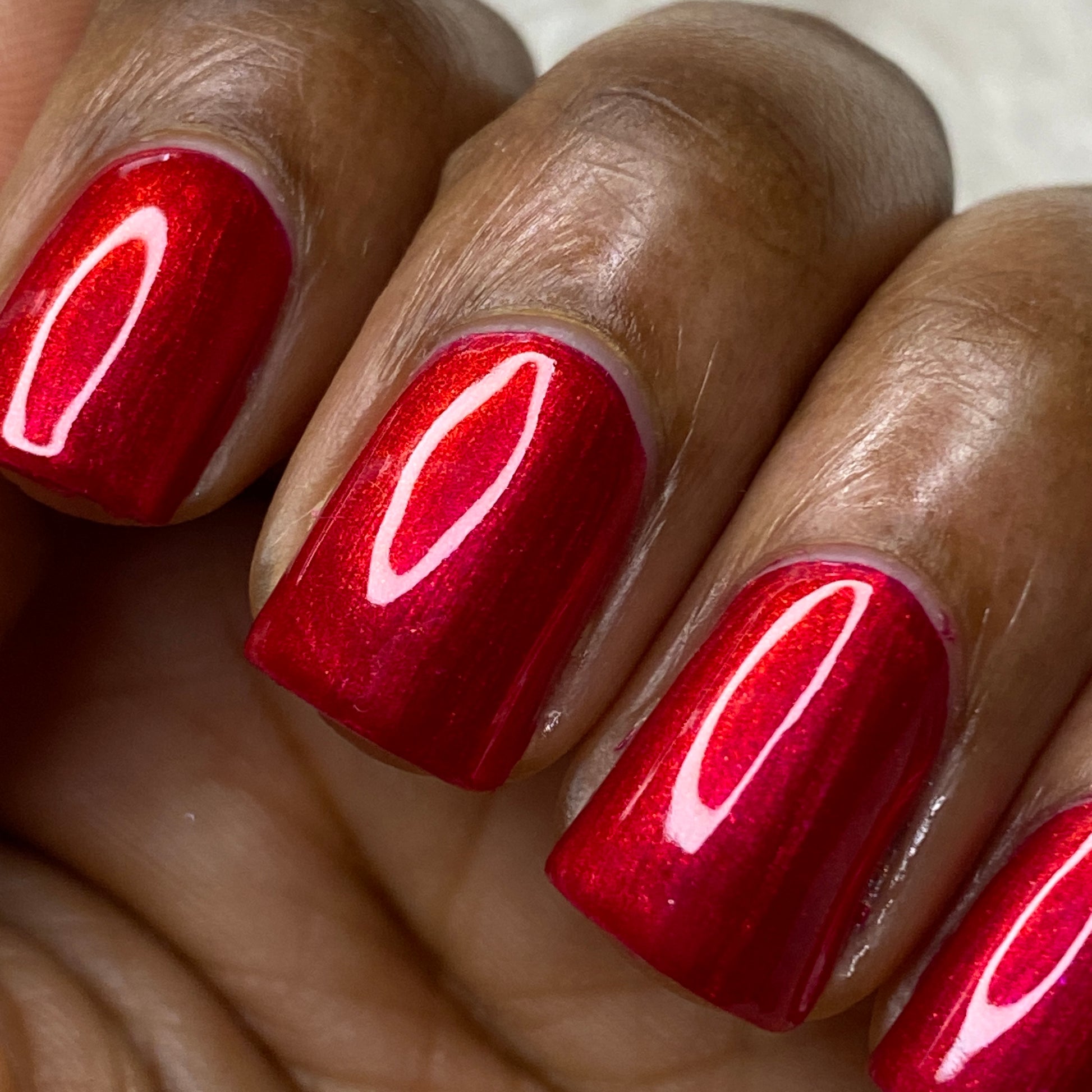 A cherry pinkish-red jelly base with vibrant red to orange shimmer (in some lighting, the base color appears a vibrant deep pink and in other lighting, it appears red)