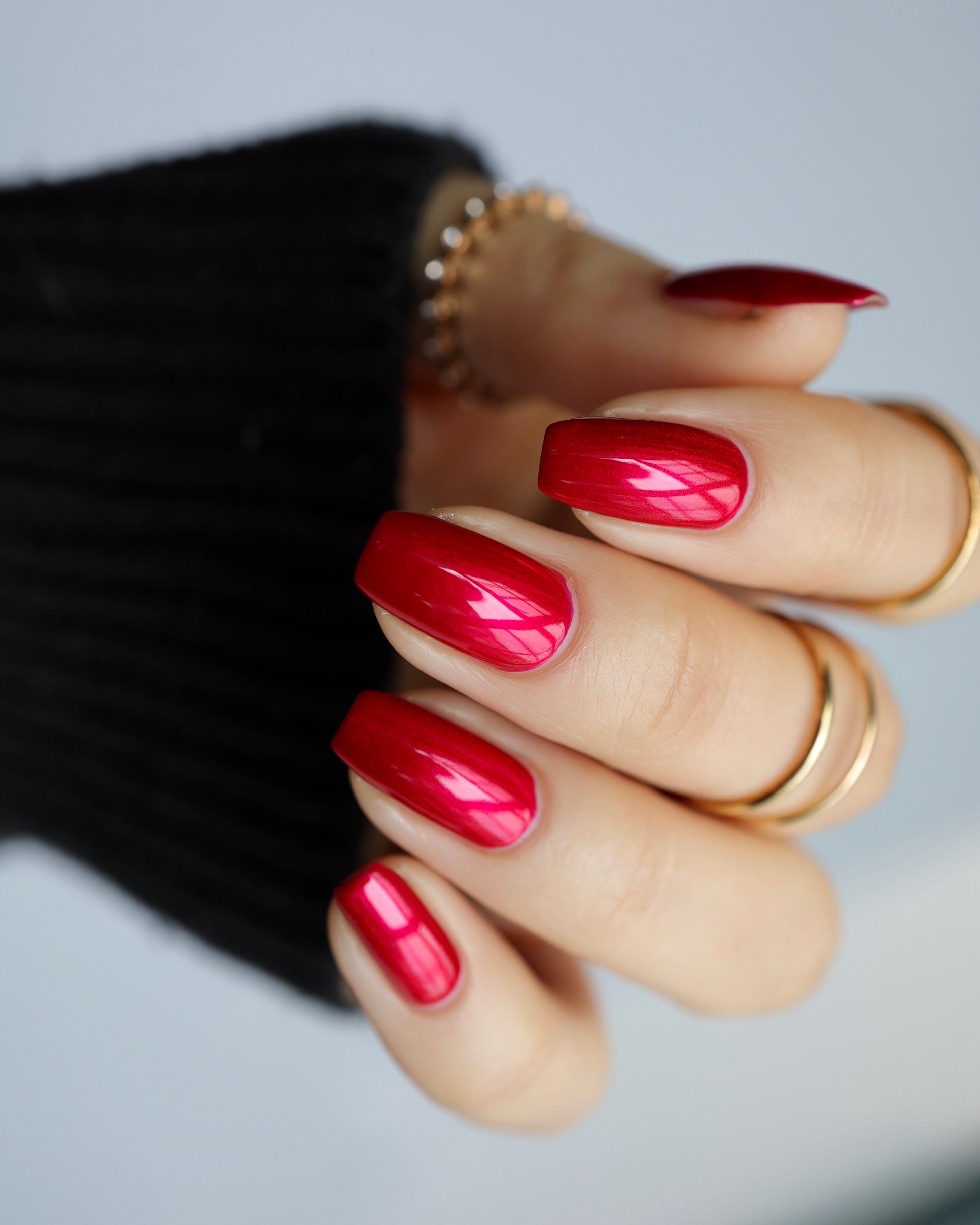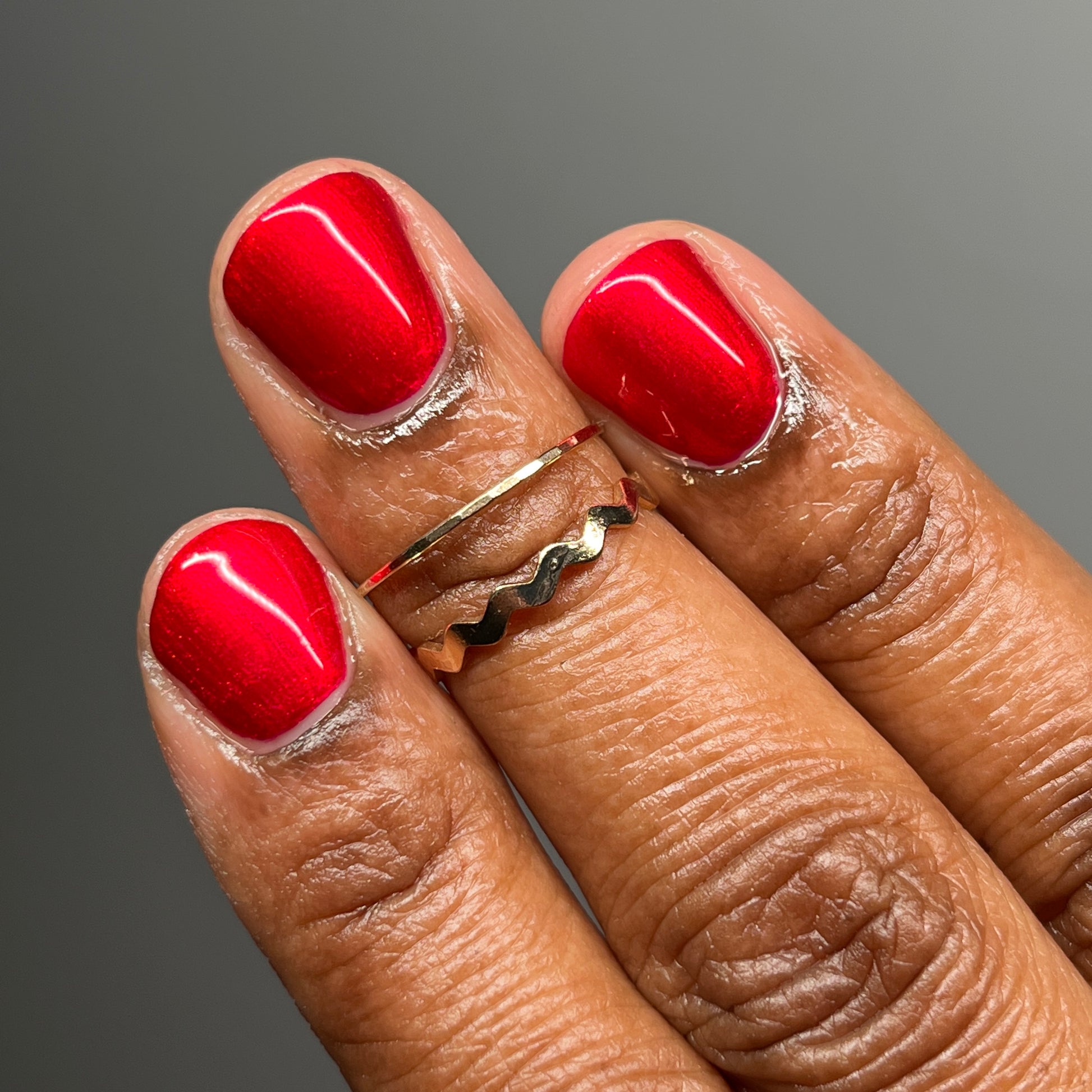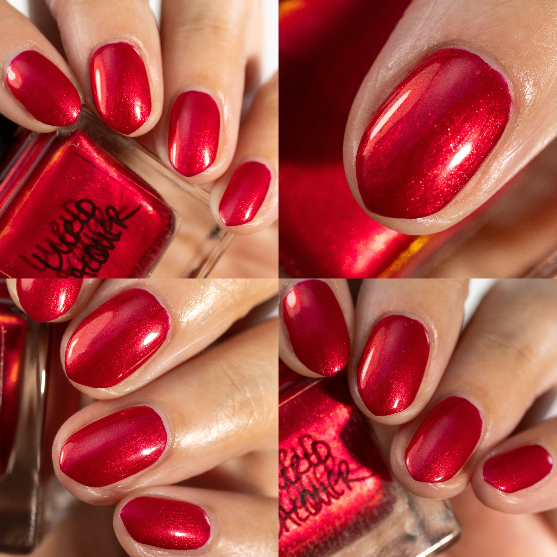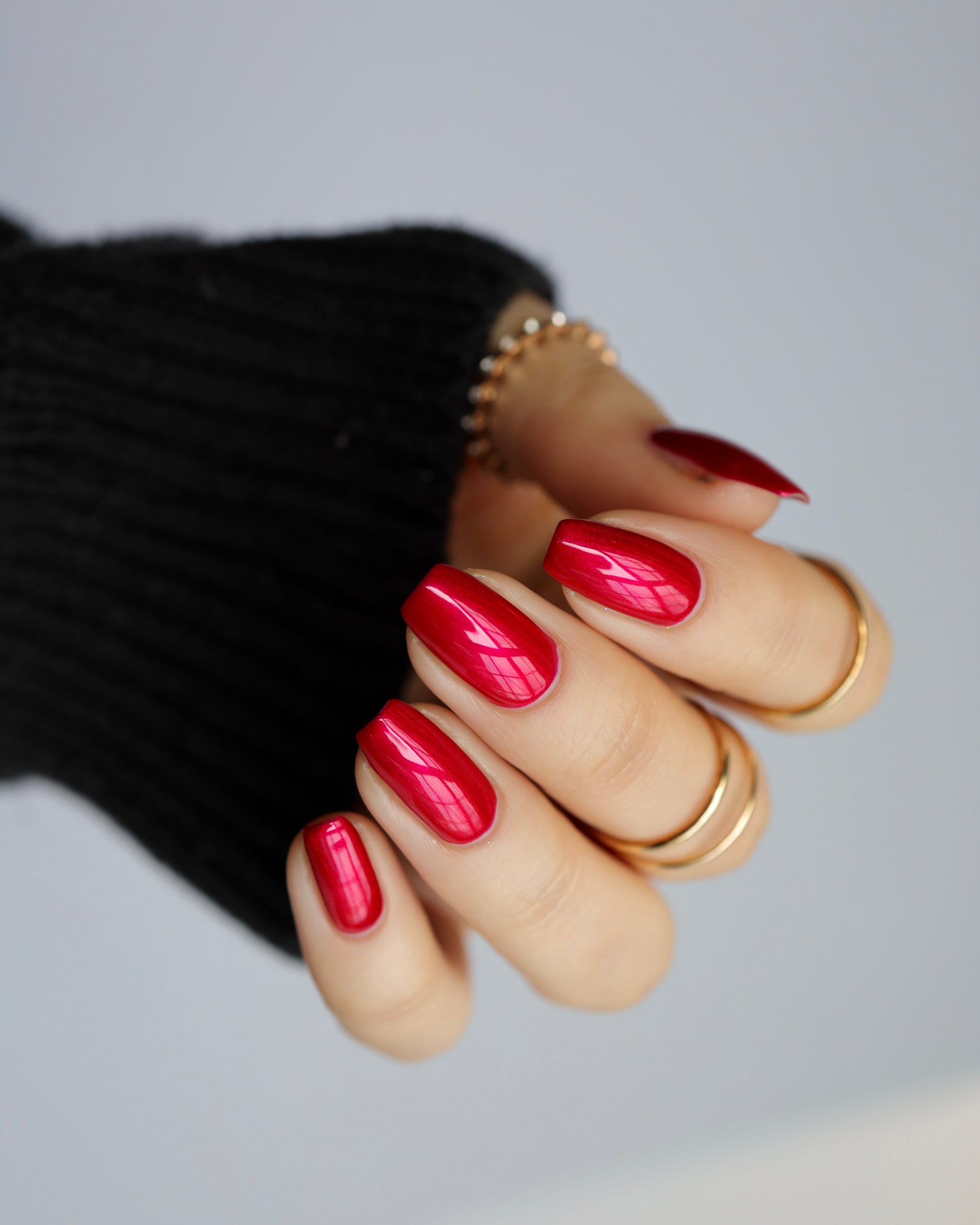A cherry pinkish-red jelly base with vibrant red to orange shimmer (in some lighting, the base color appears a vibrant deep pink and in other lighting, it appears red)