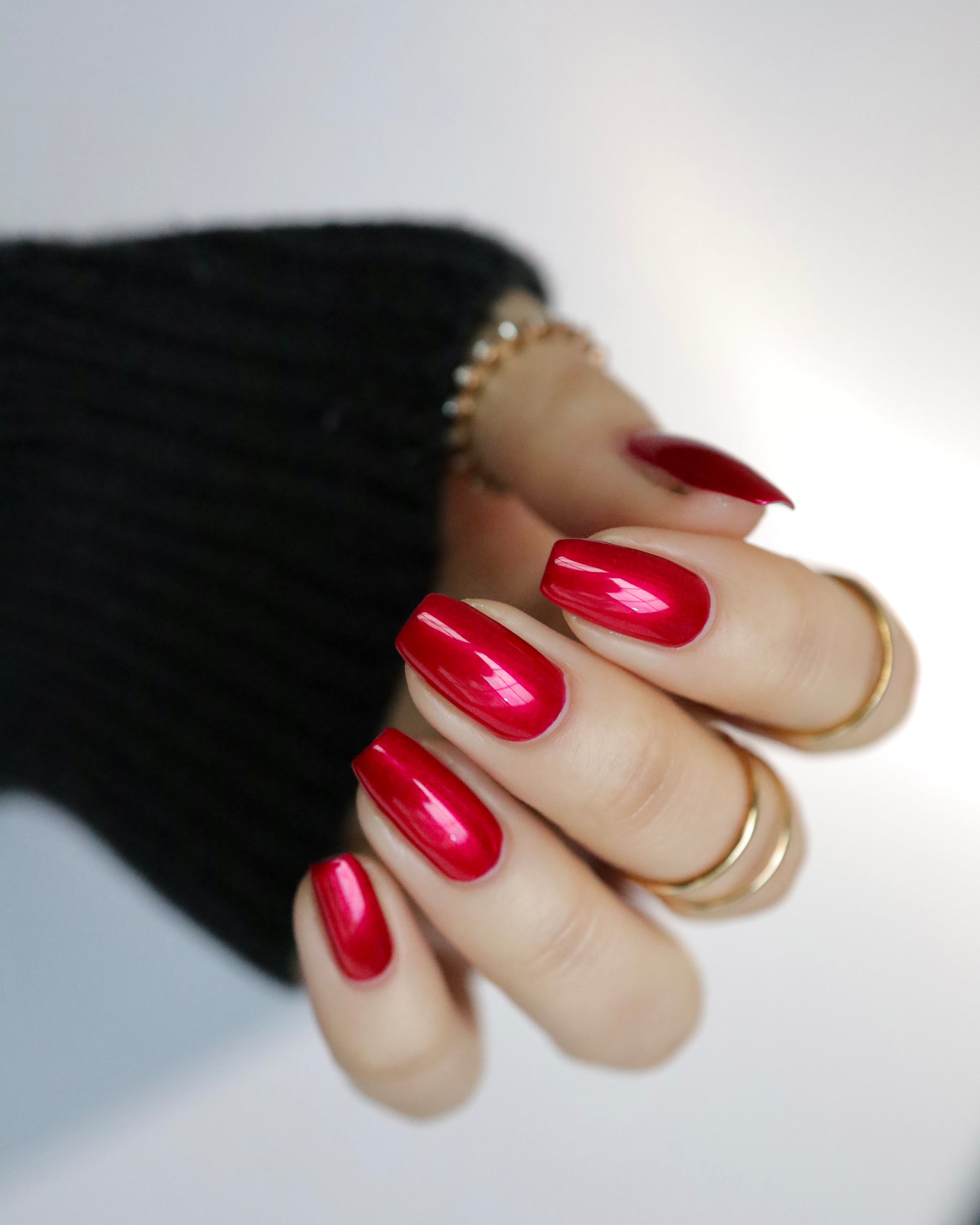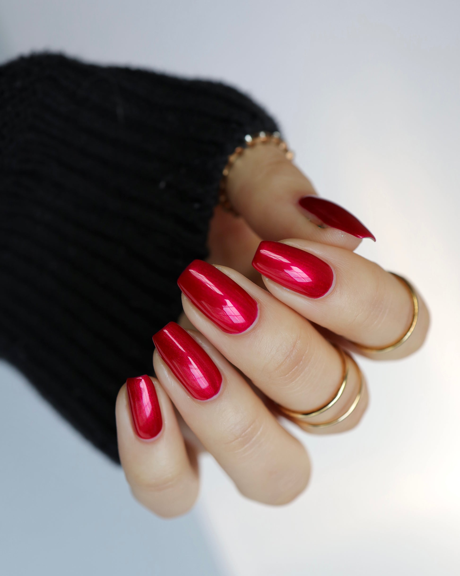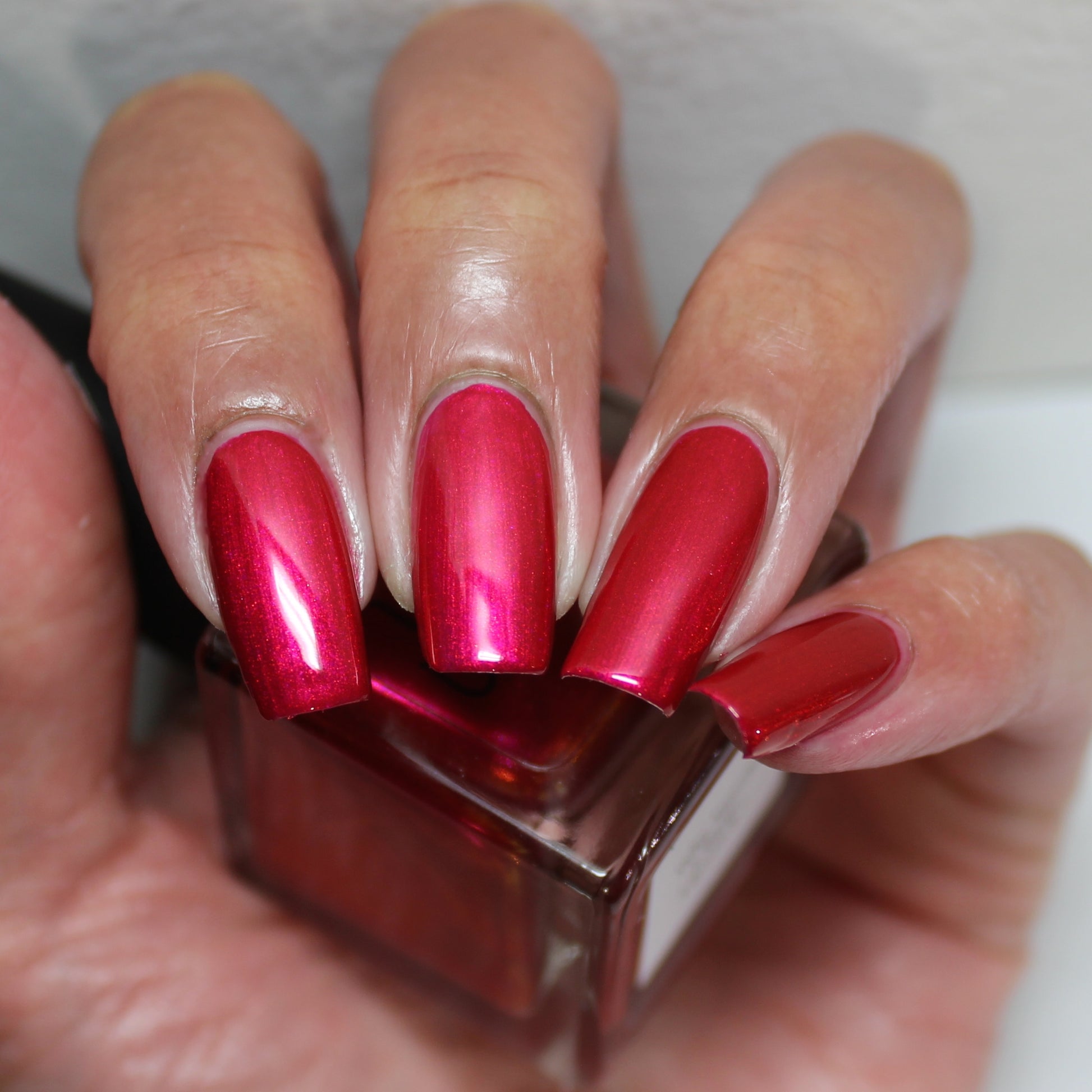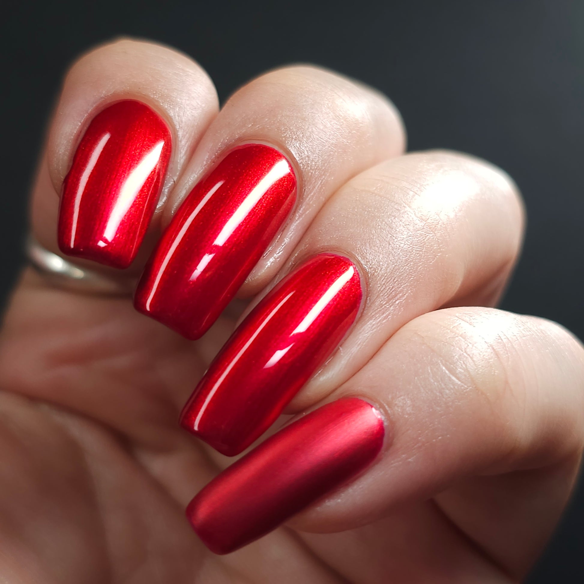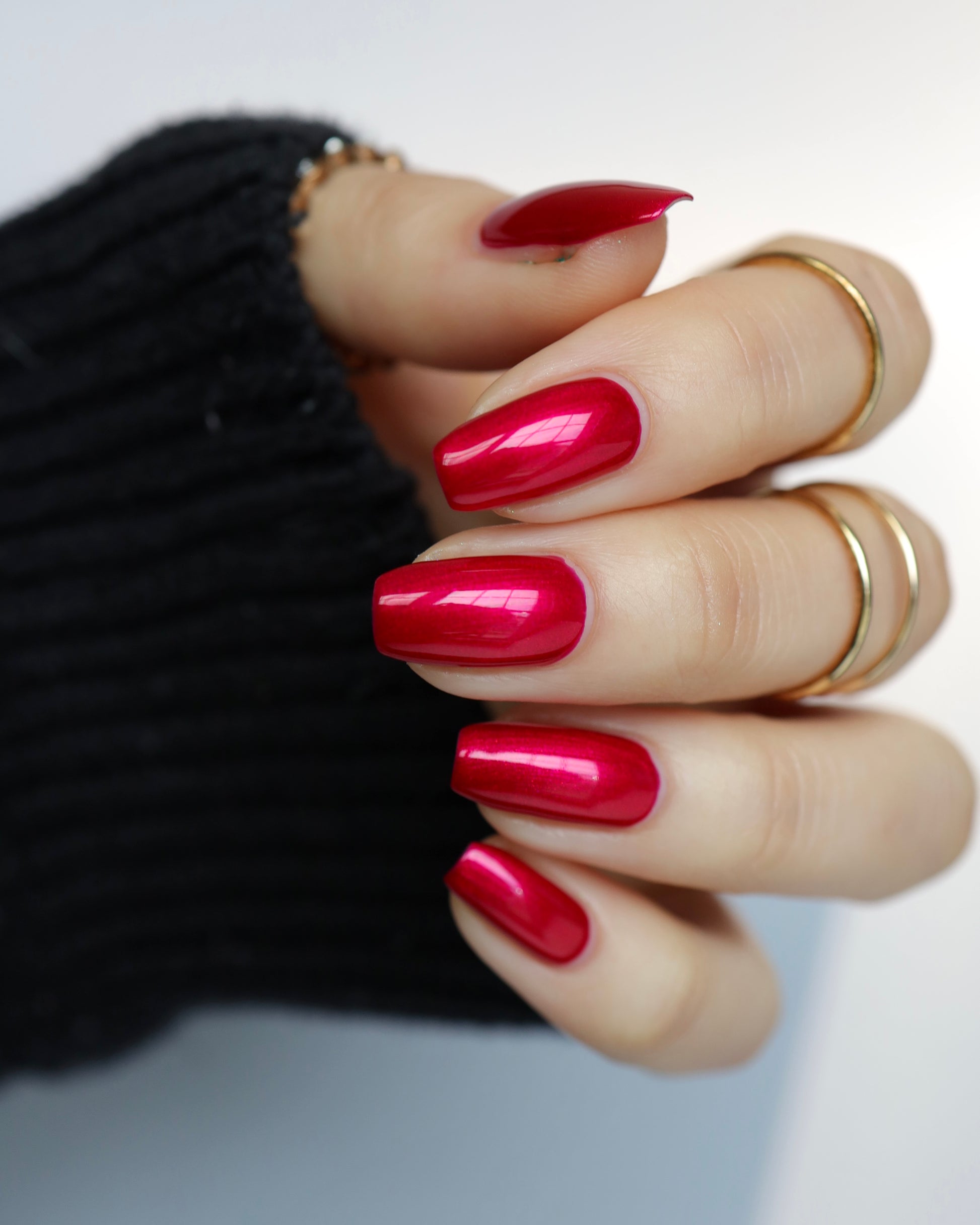 A cherry pinkish-red jelly base with vibrant red to orange shimmer (in some lighting, the base color appears a vibrant deep pink and in other lighting, it appears red)