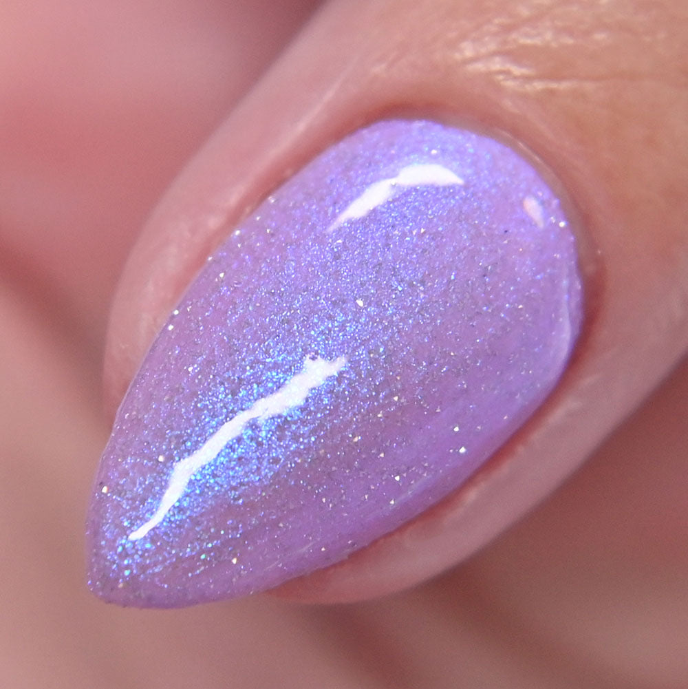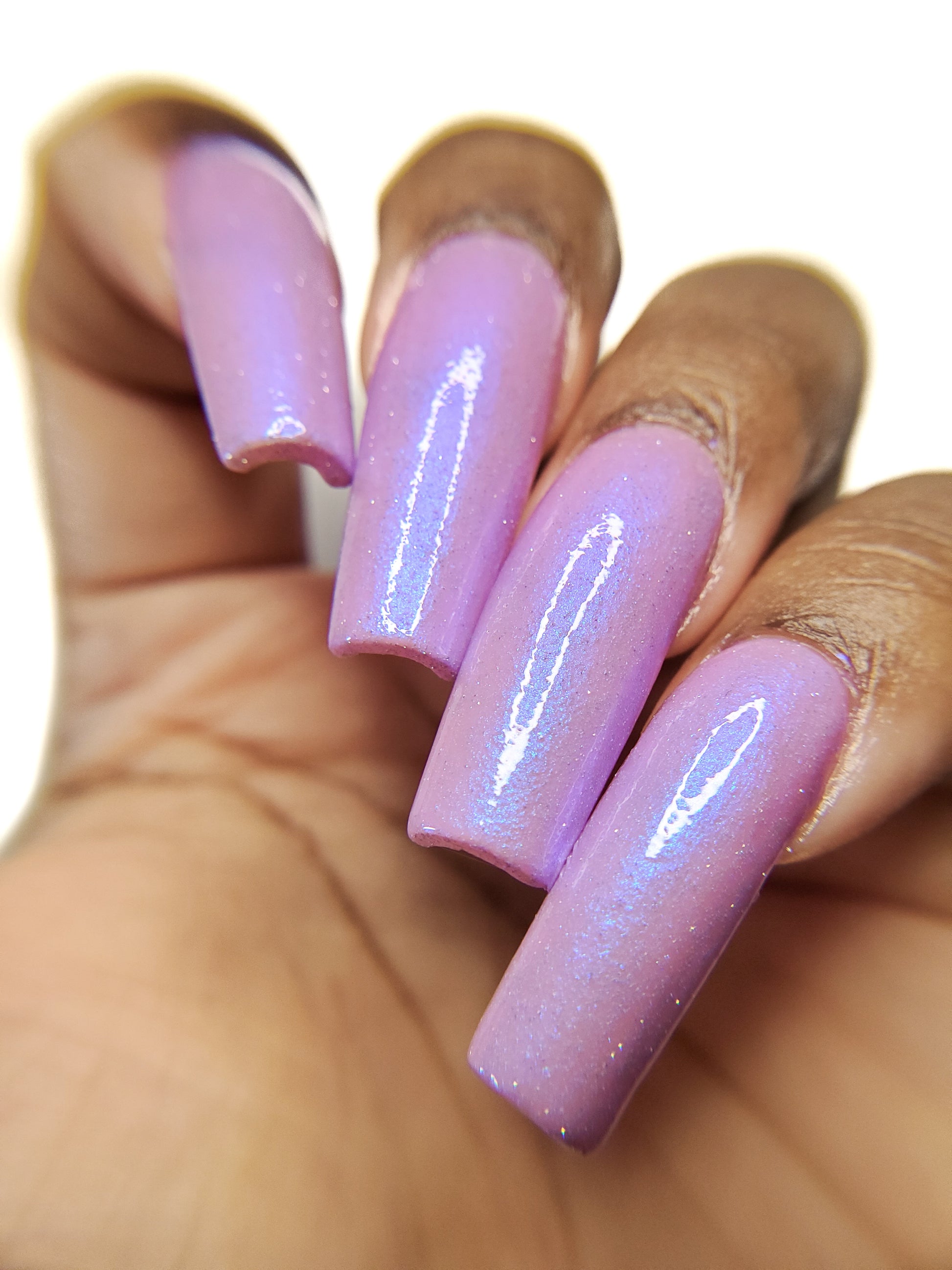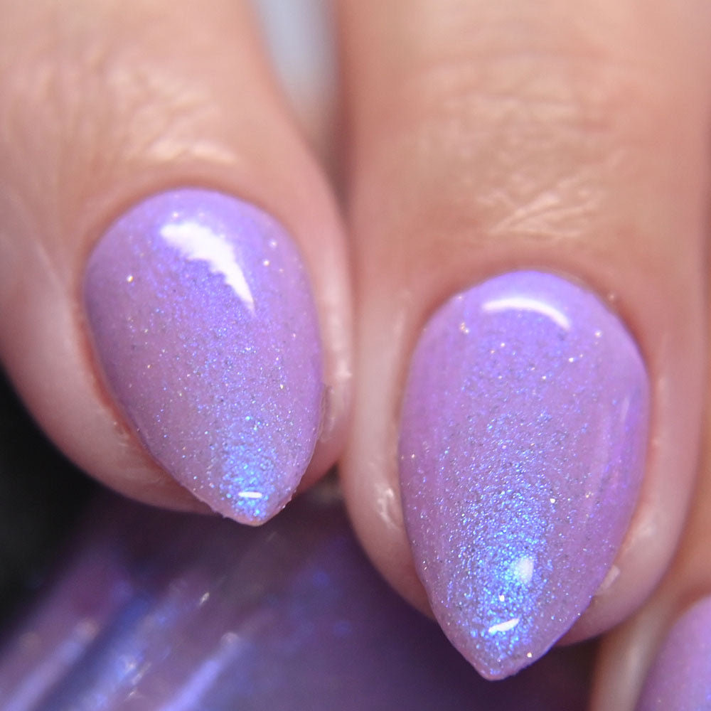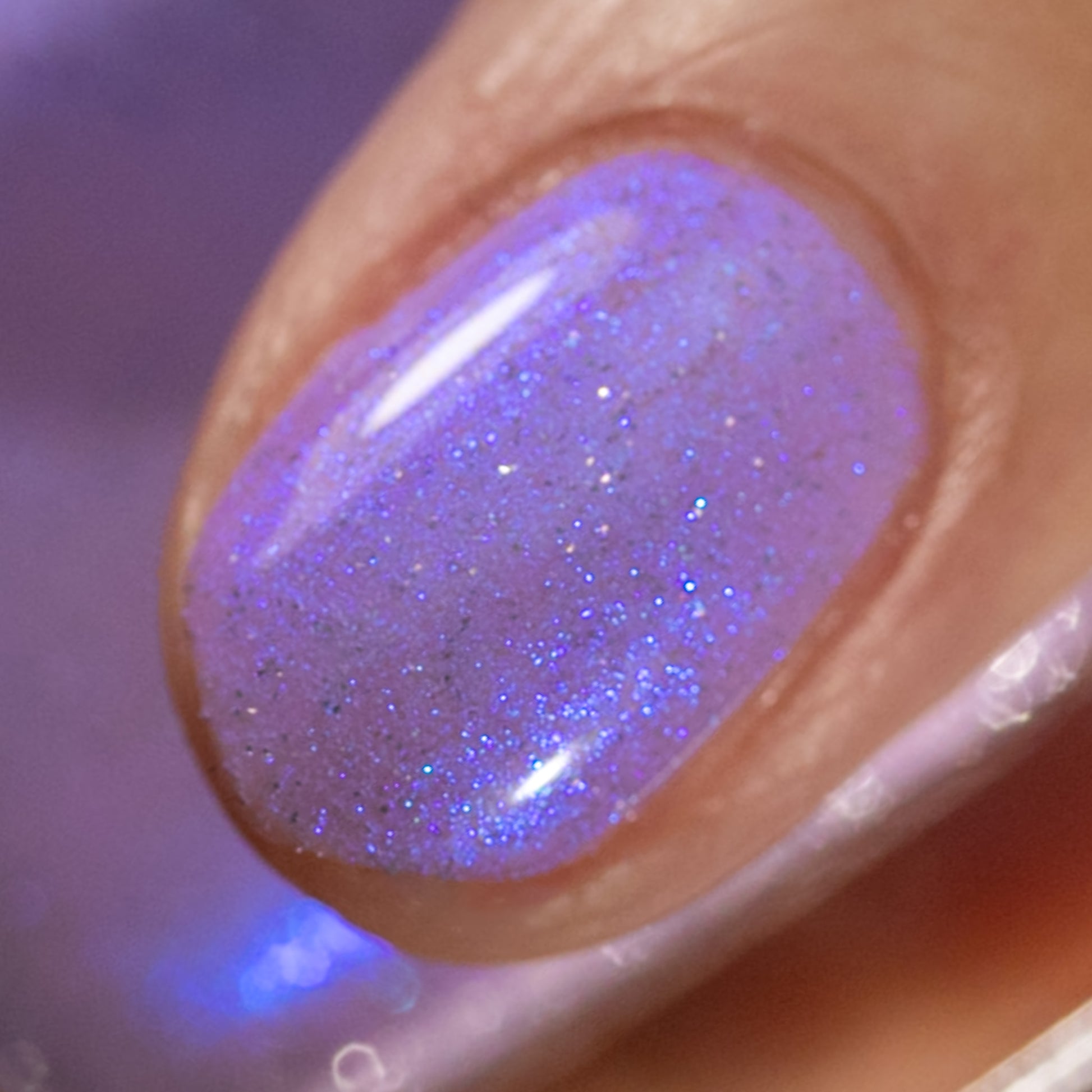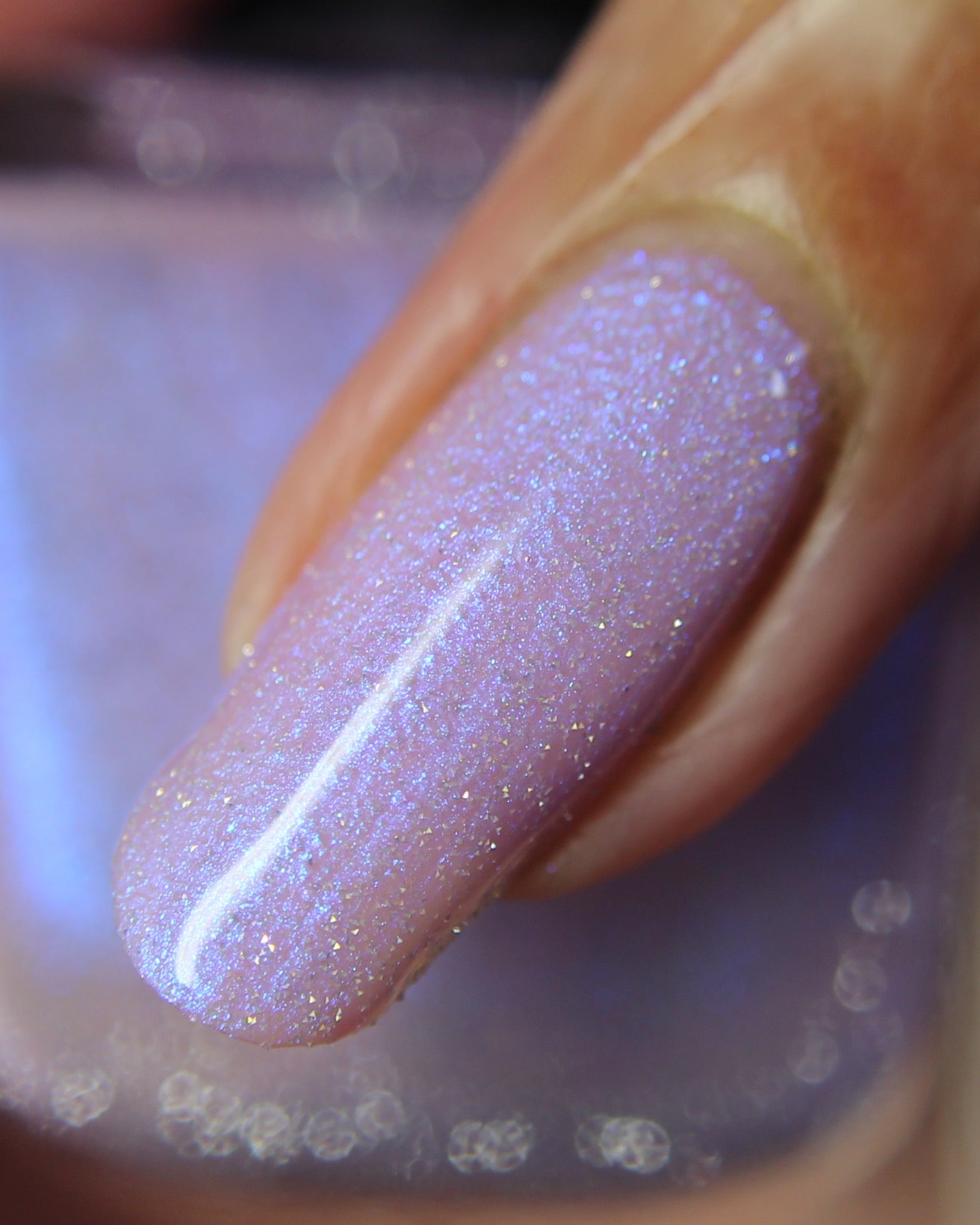 A lilac (purplish pink) crelly base with glowy blue shimmer and subtle silver light reflective glitter