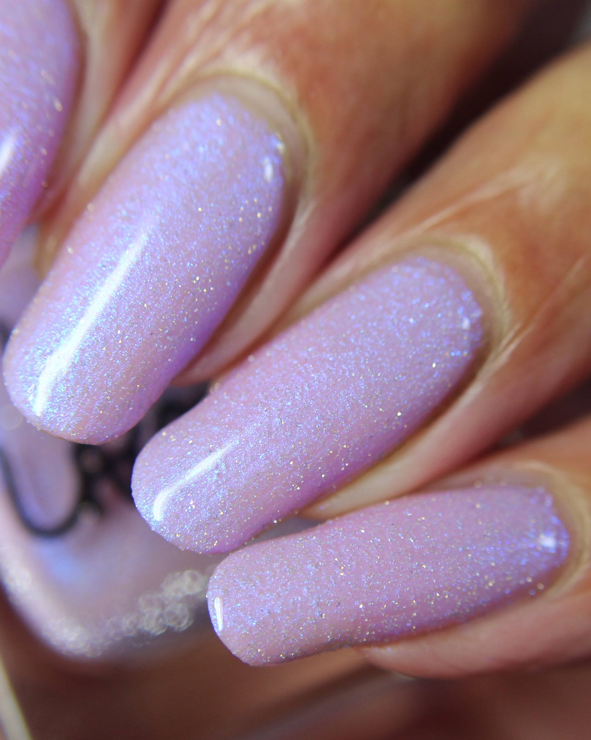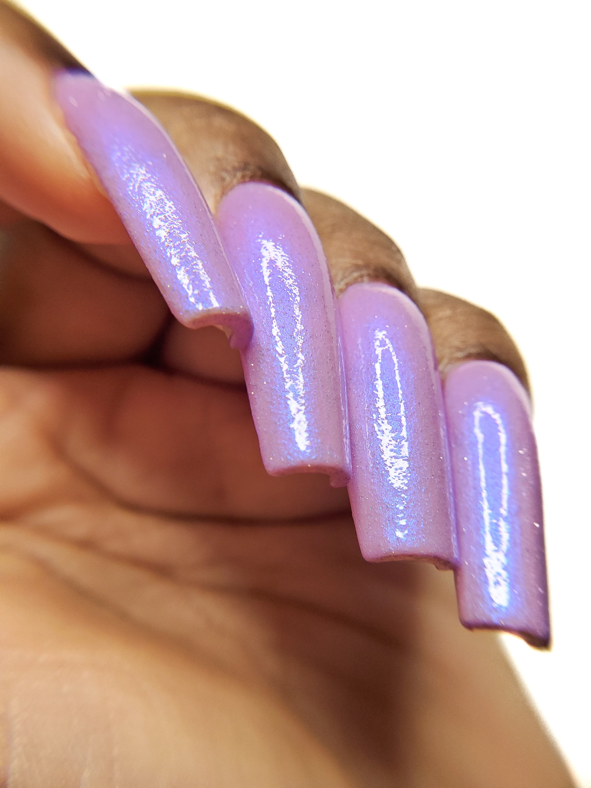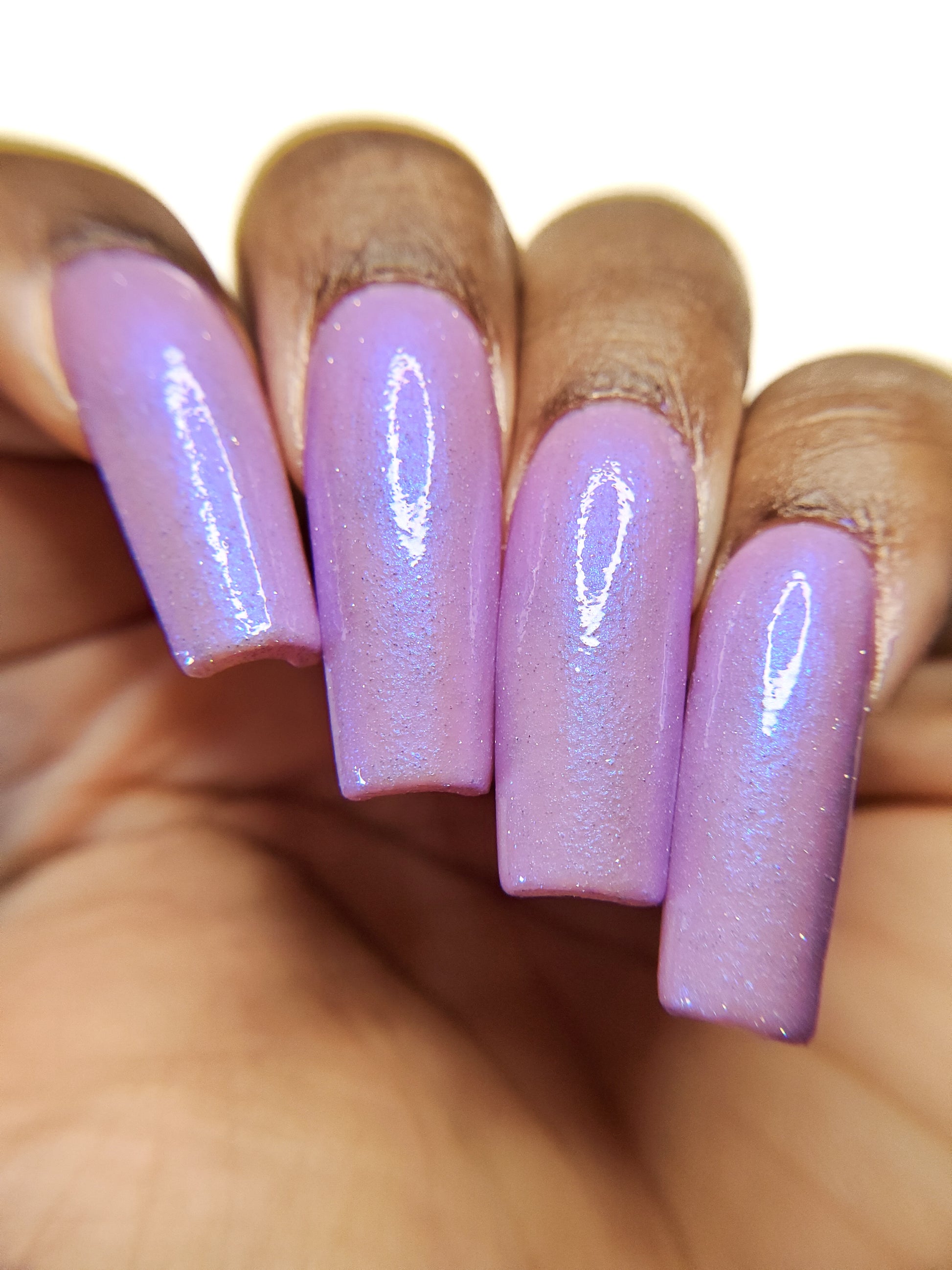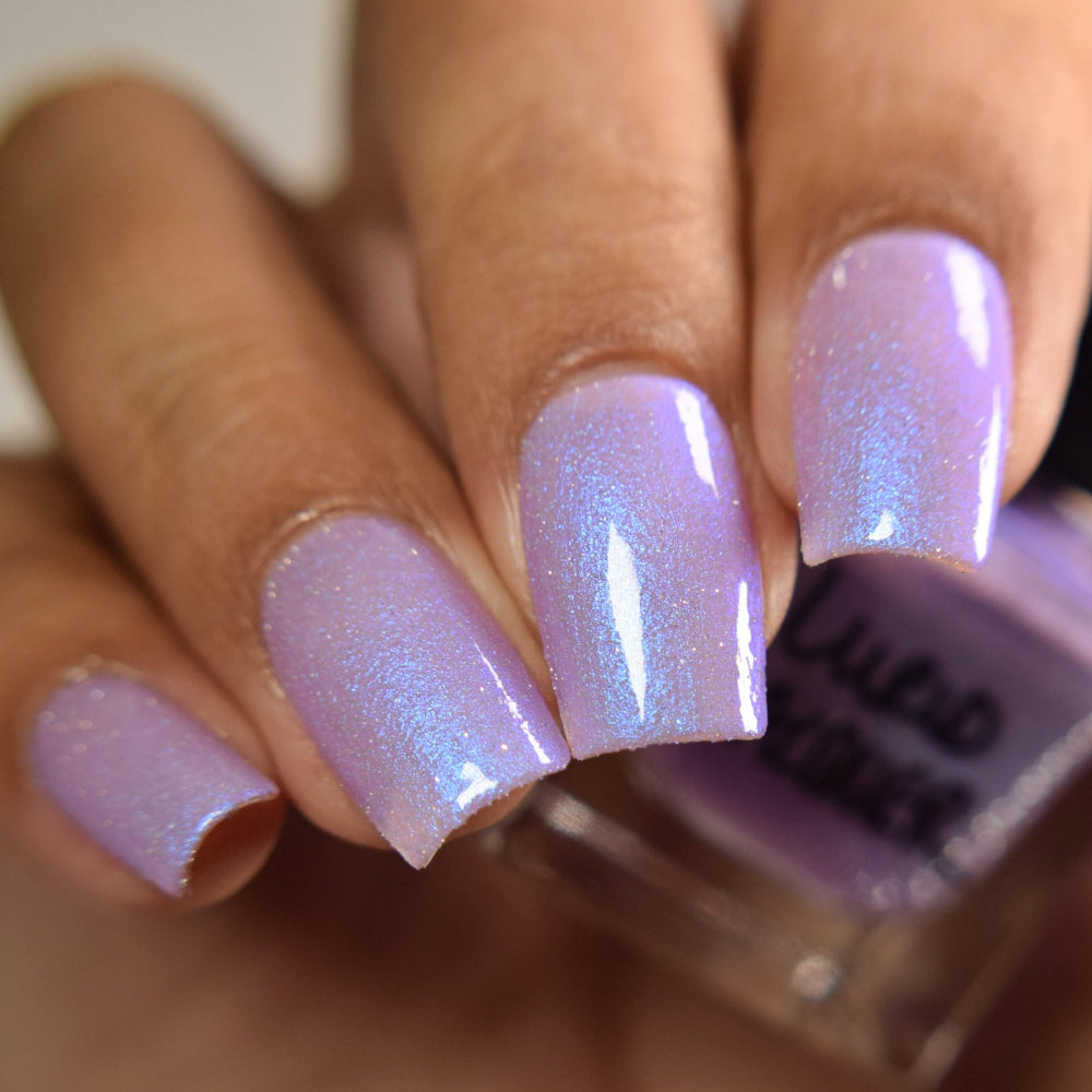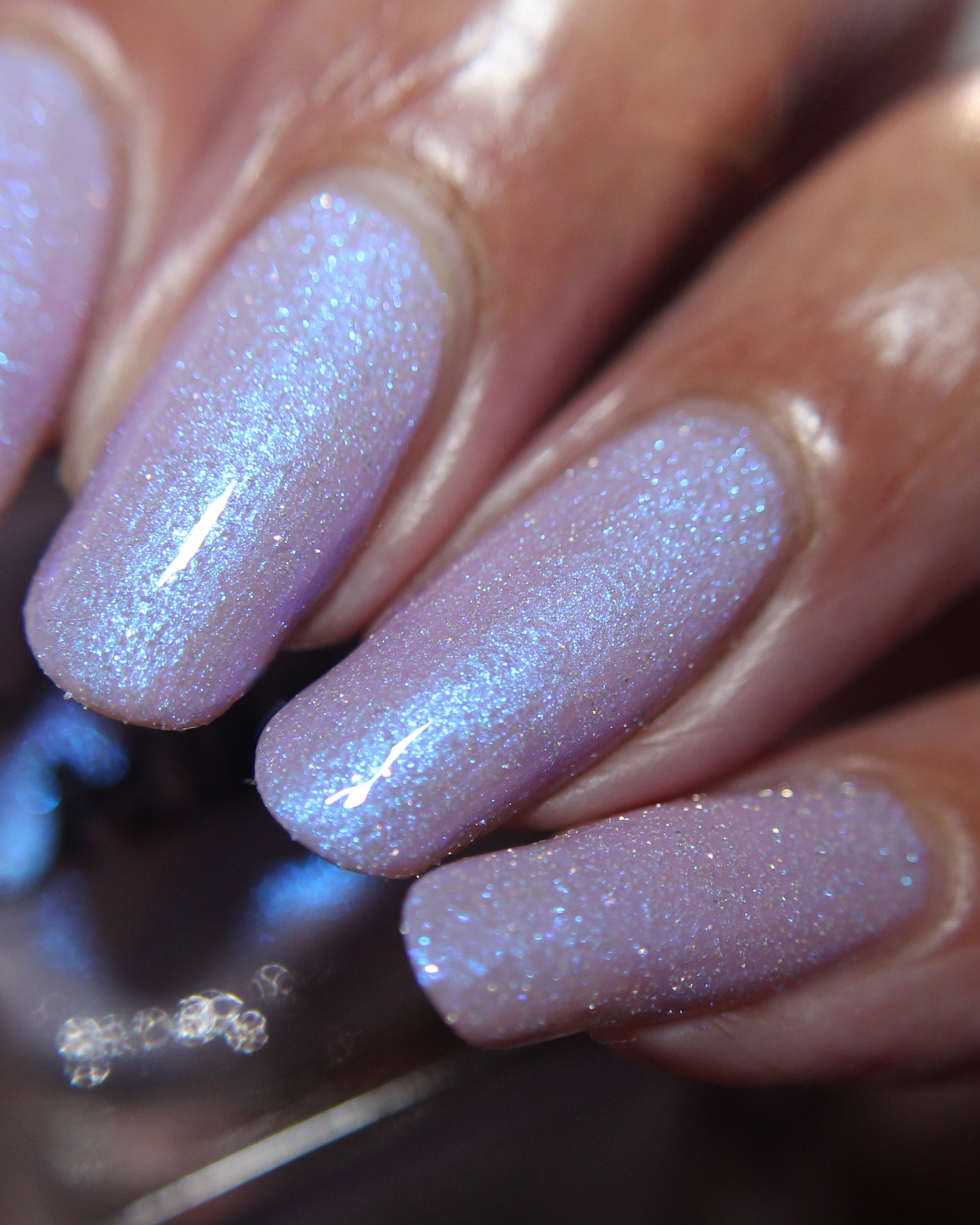 A lilac (purplish pink) crelly base with glowy blue shimmer and subtle silver light reflective glitter