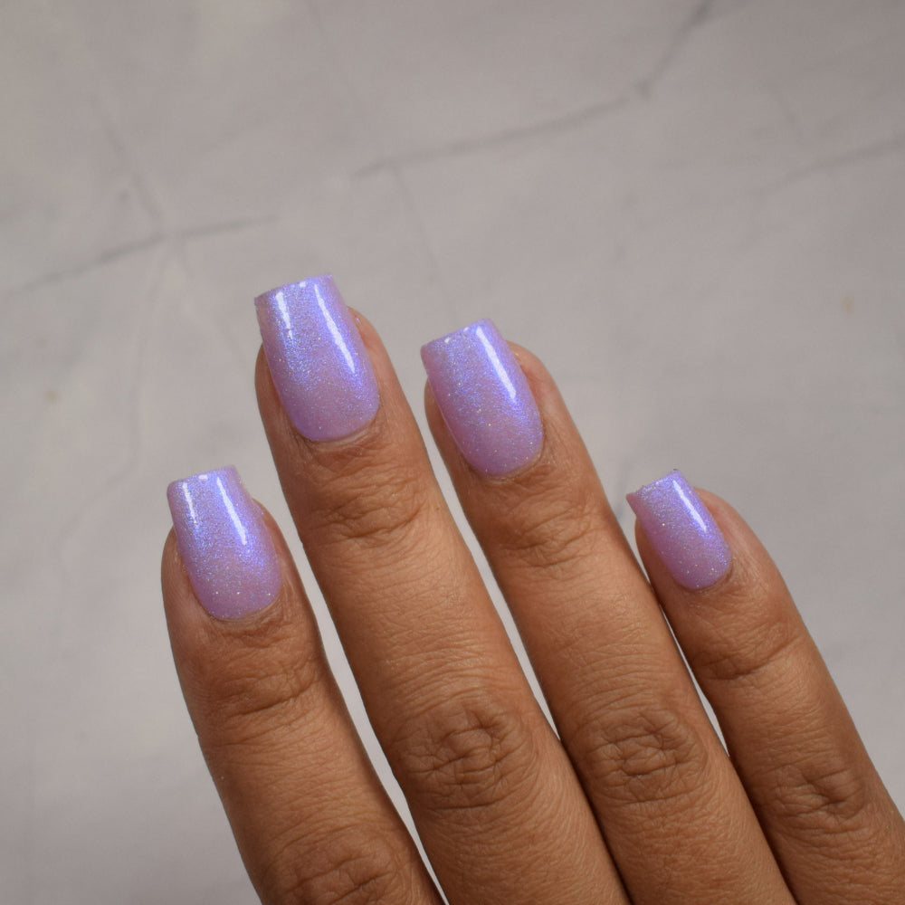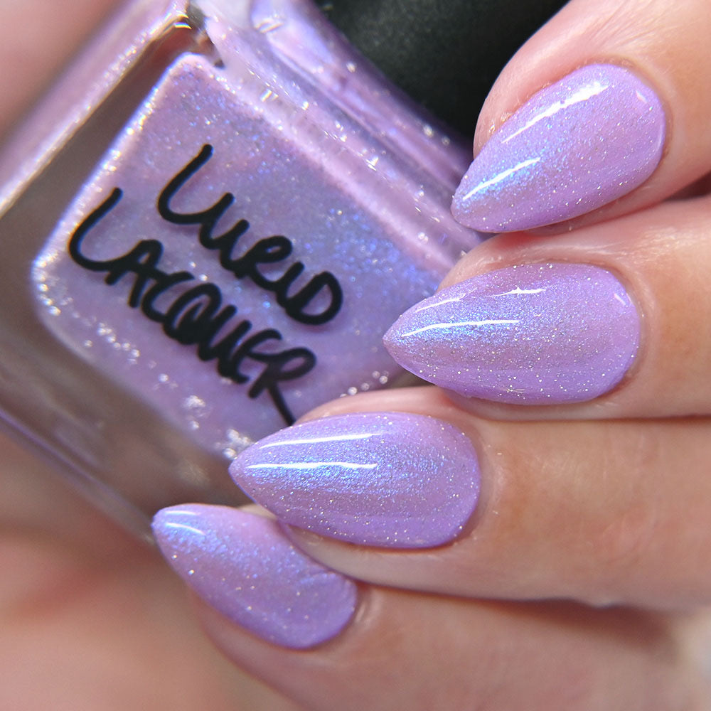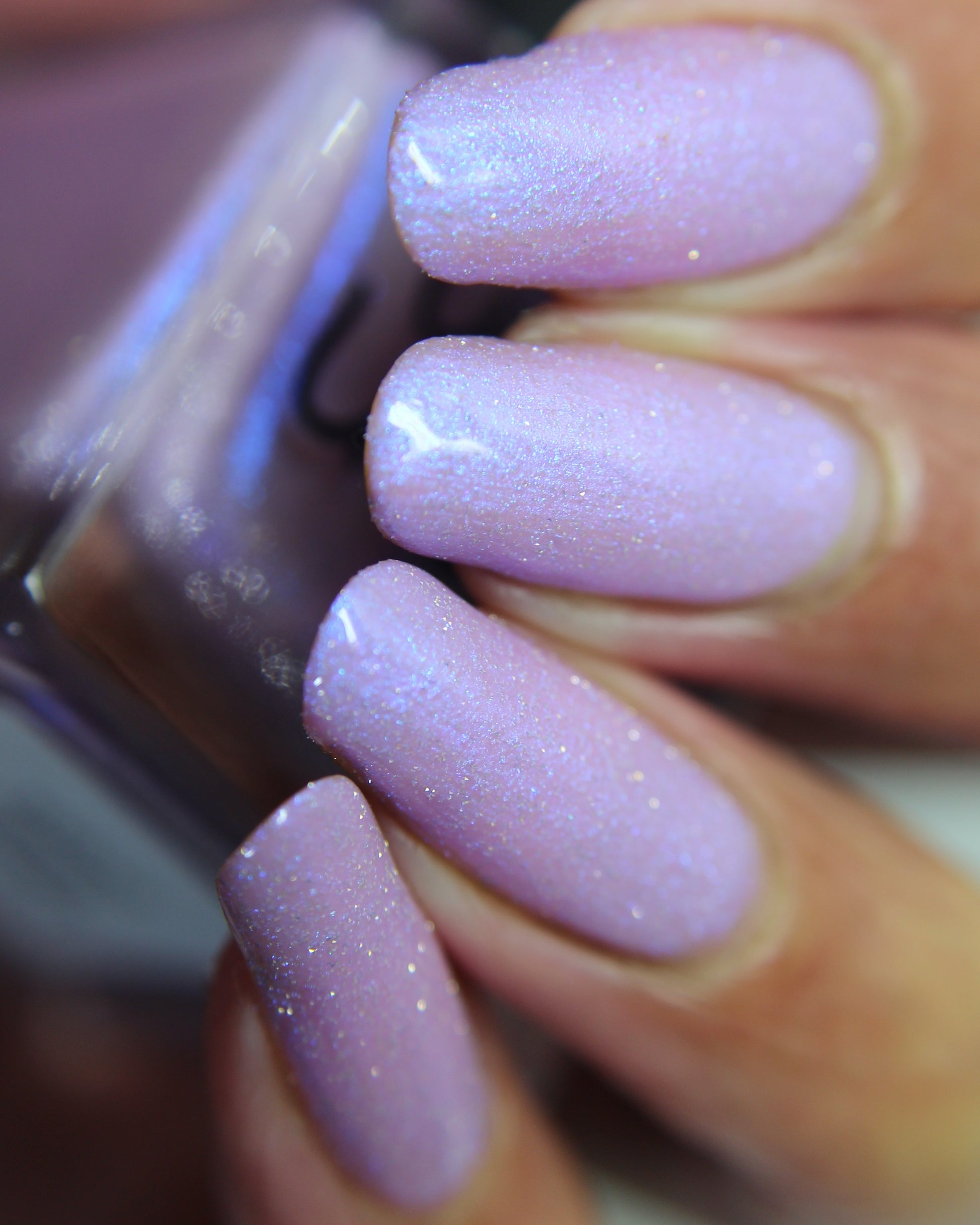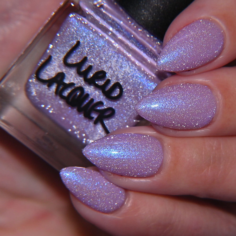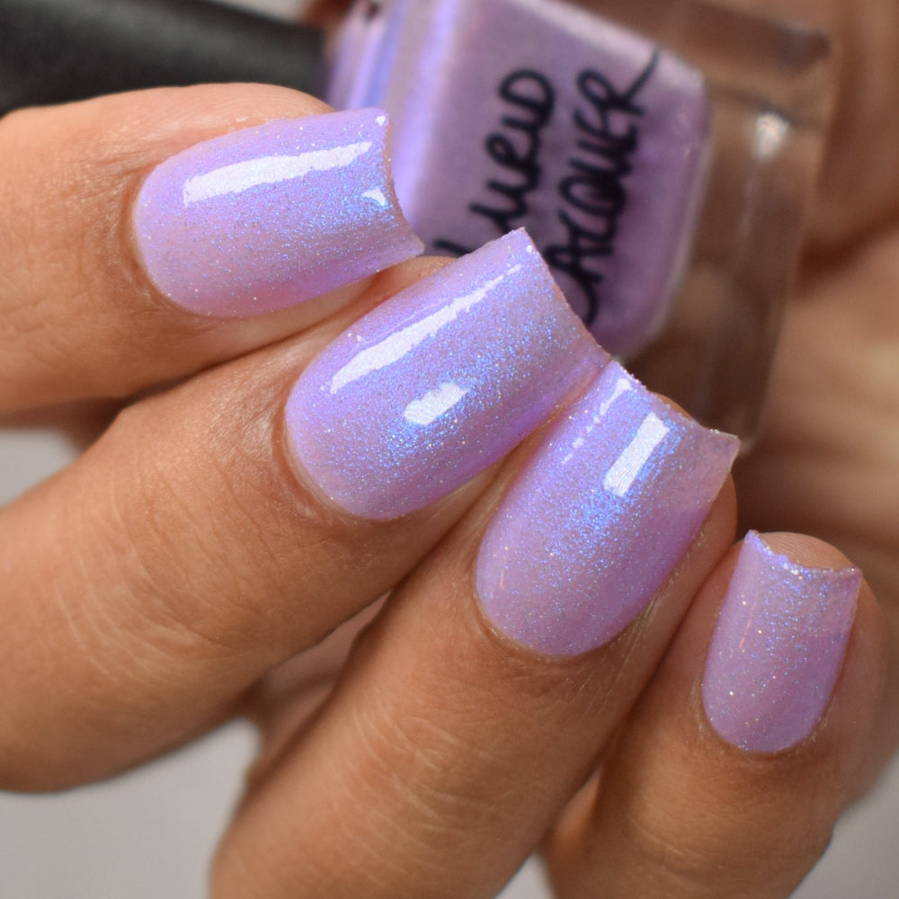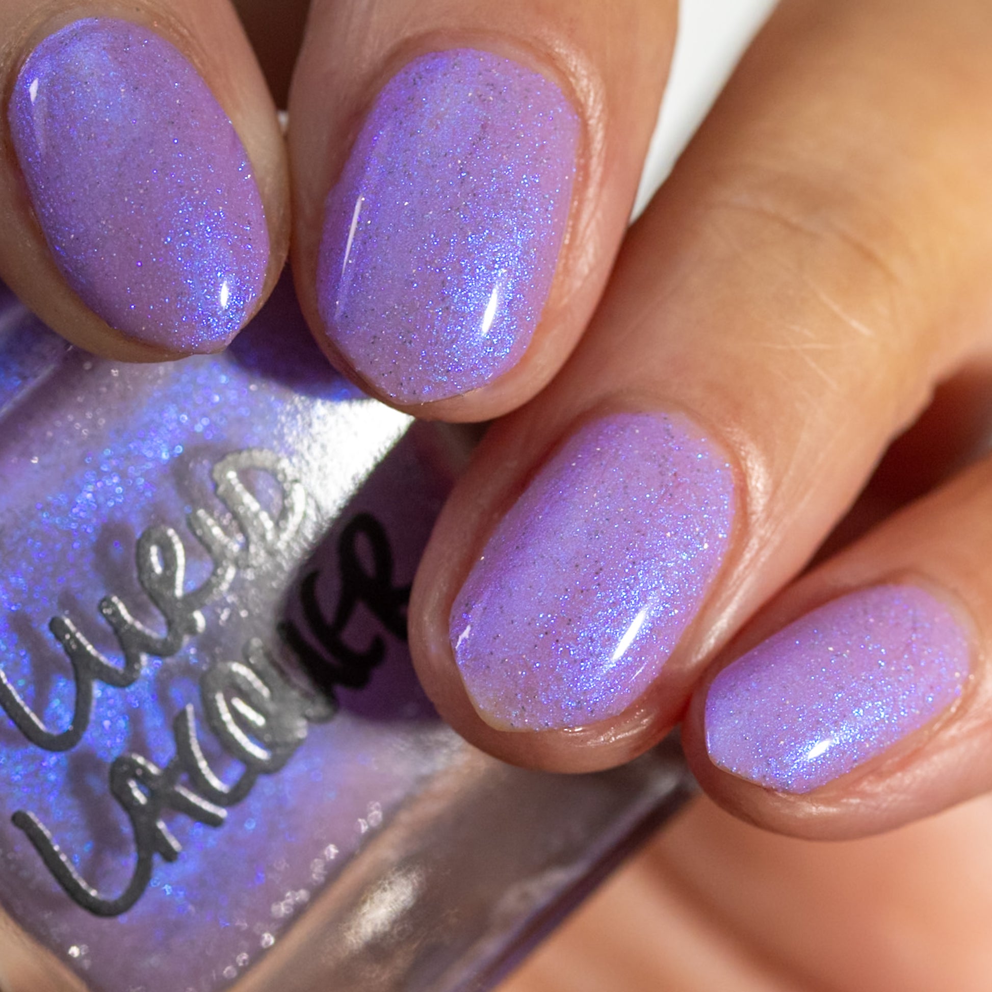 A lilac (purplish pink) crelly base with glowy blue shimmer and subtle silver light reflective glitter