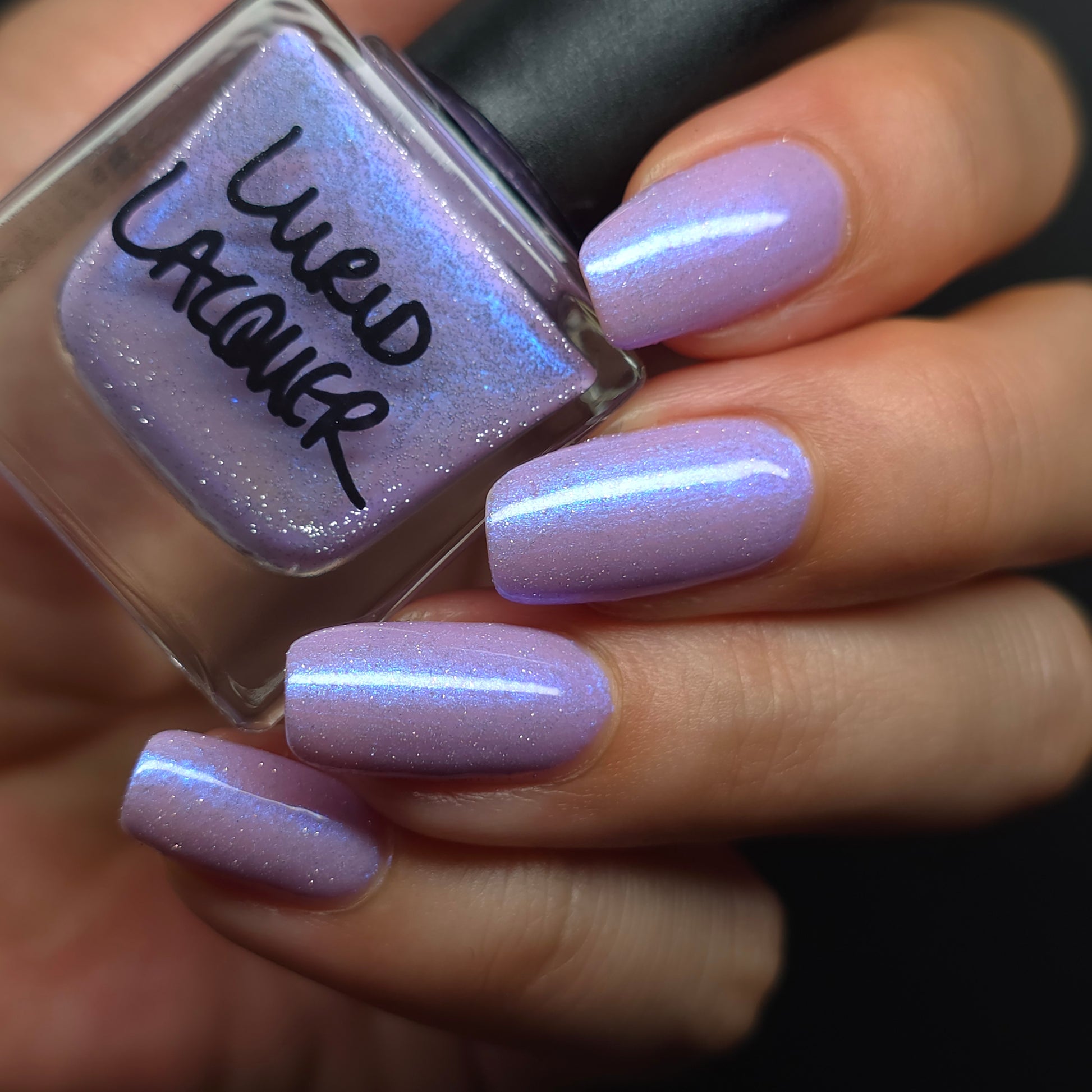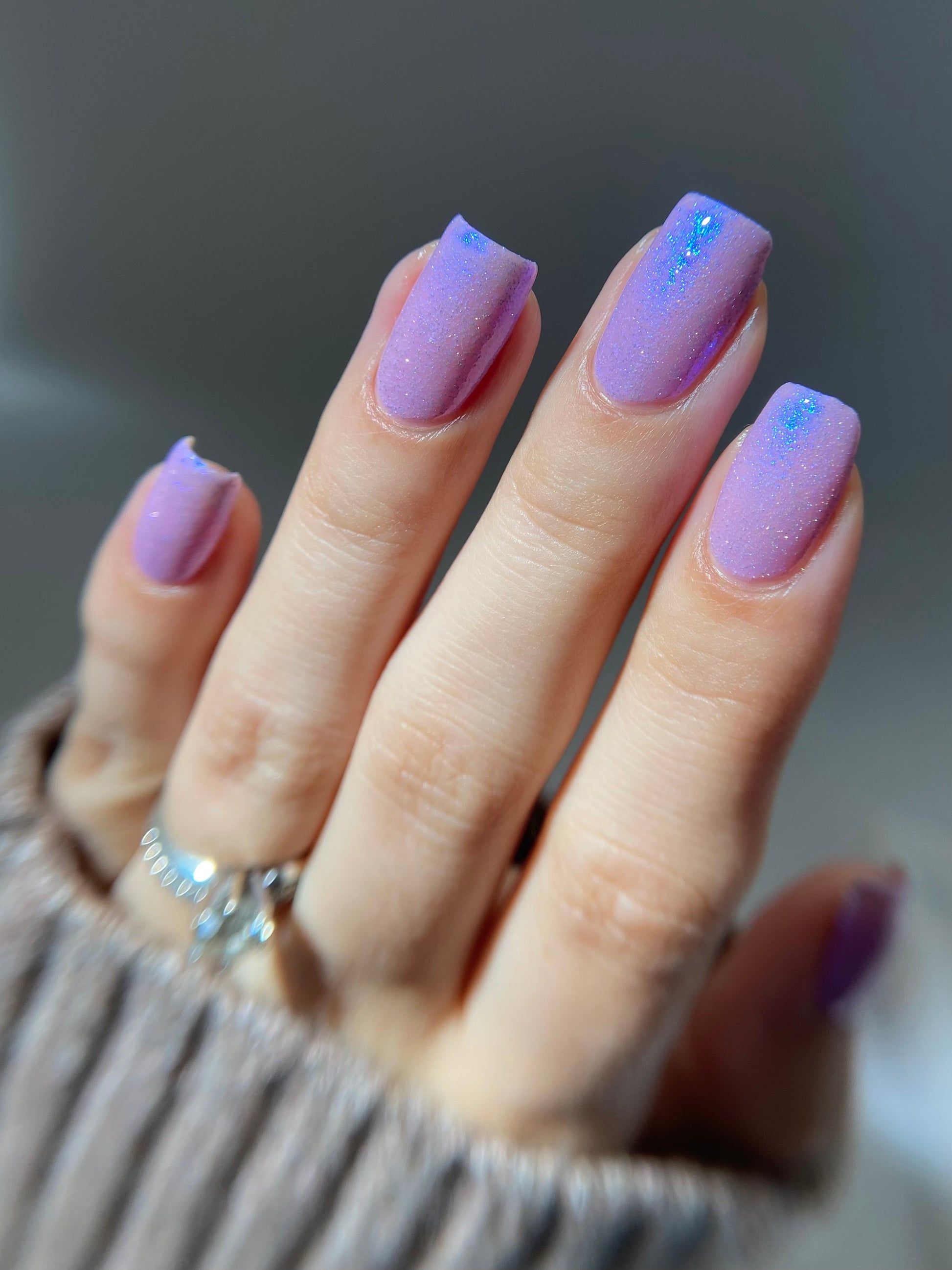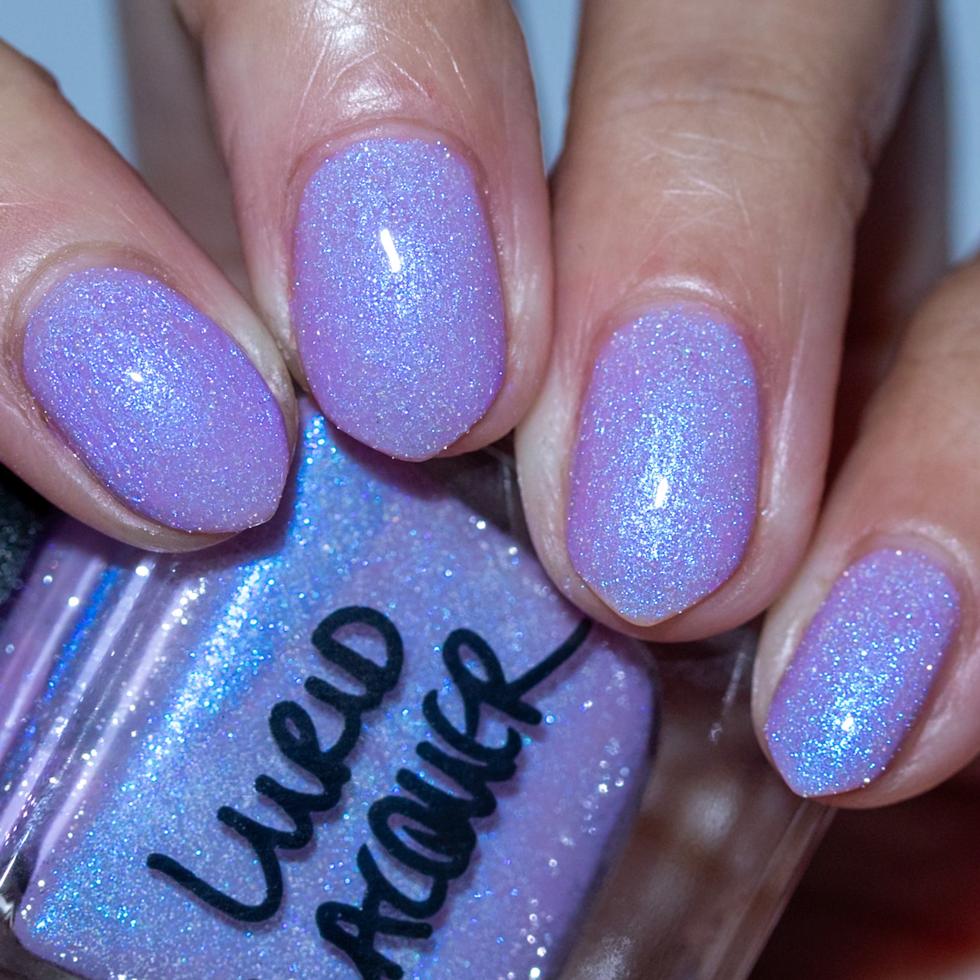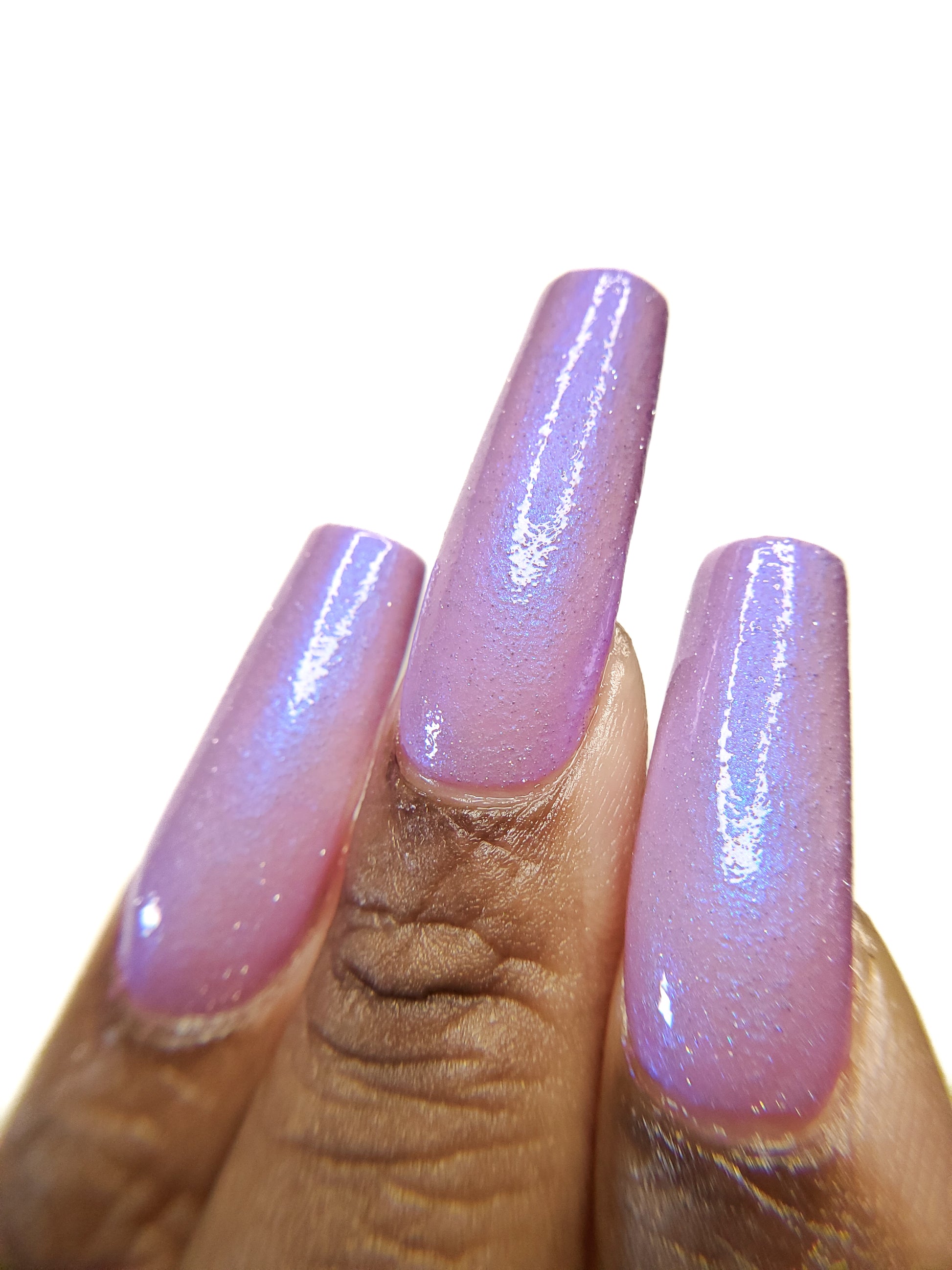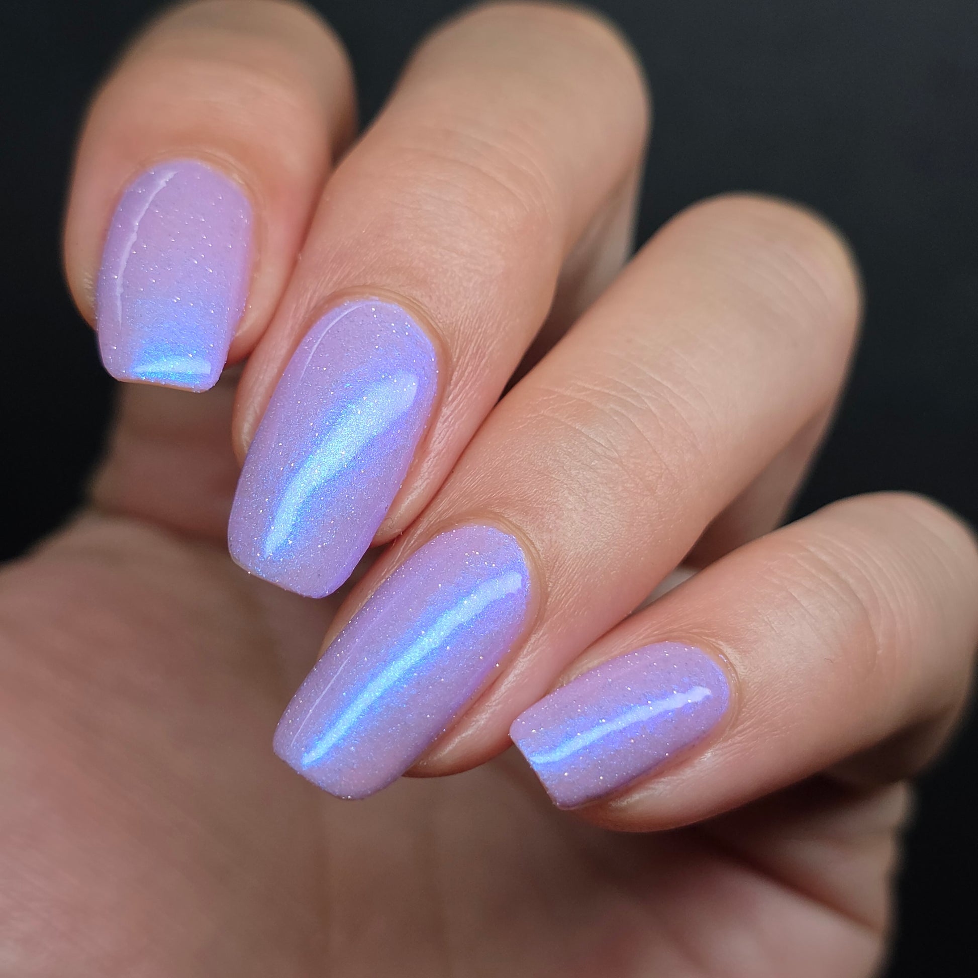 A lilac (purplish pink) crelly base with glowy blue shimmer and subtle silver light reflective glitter