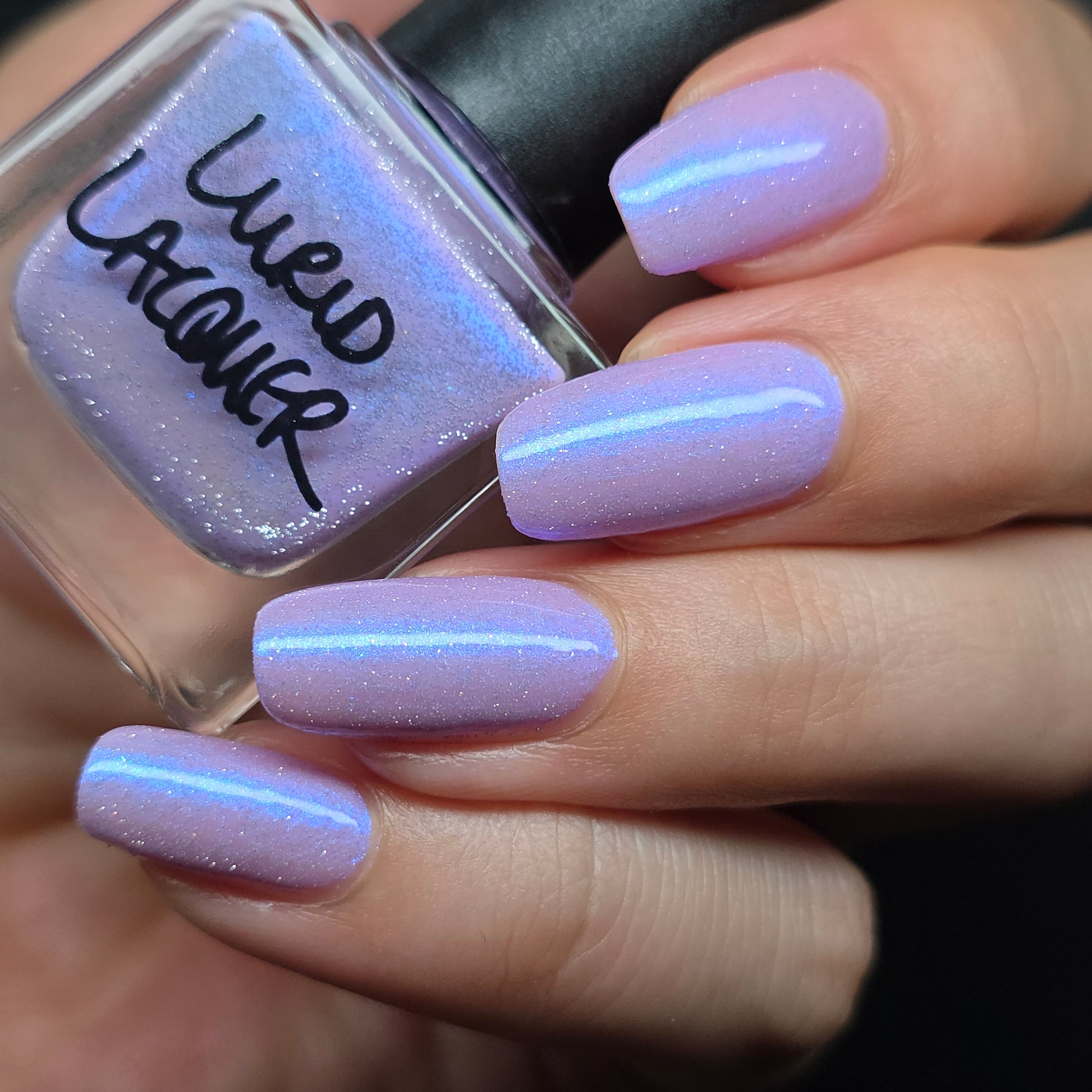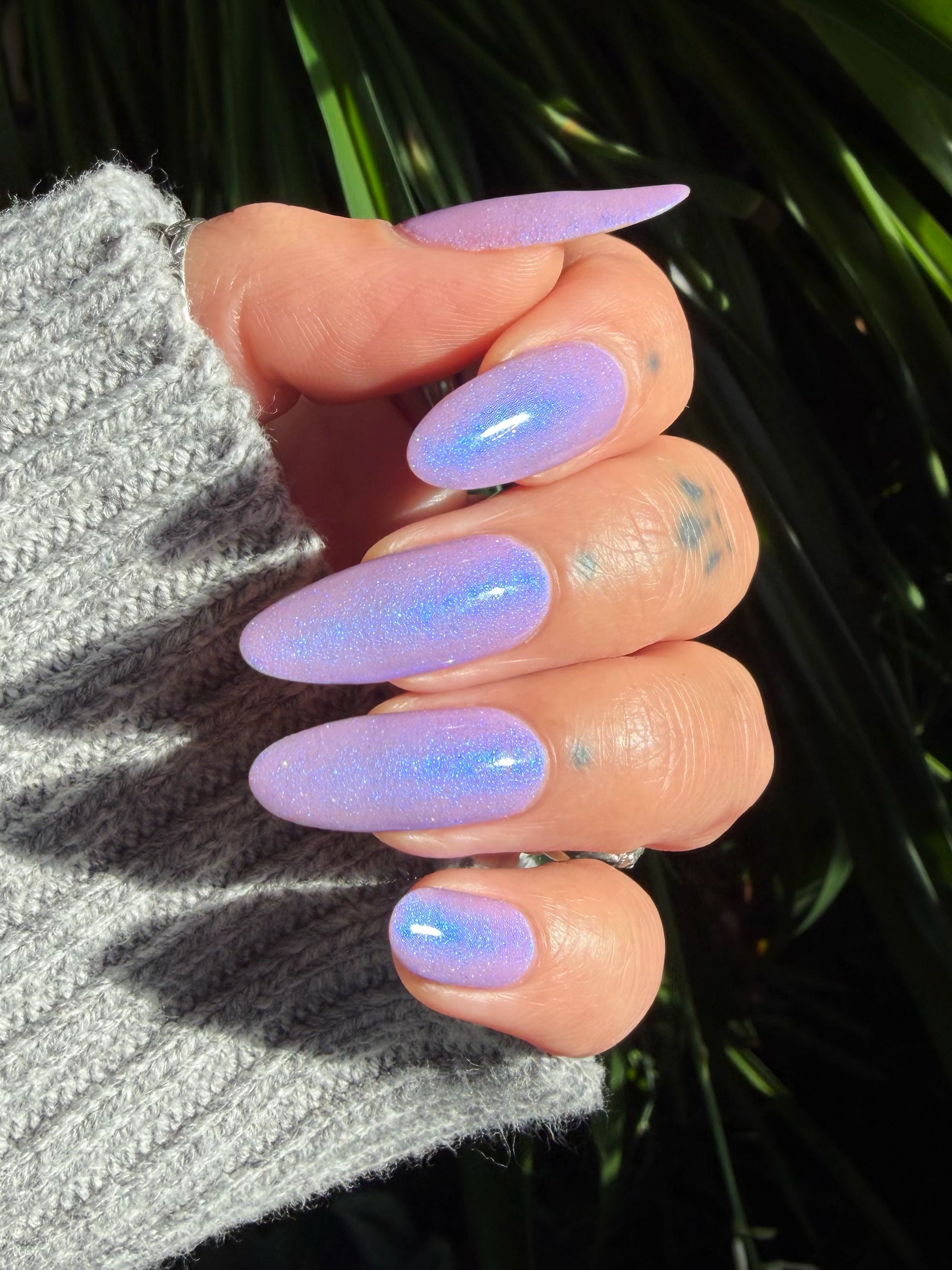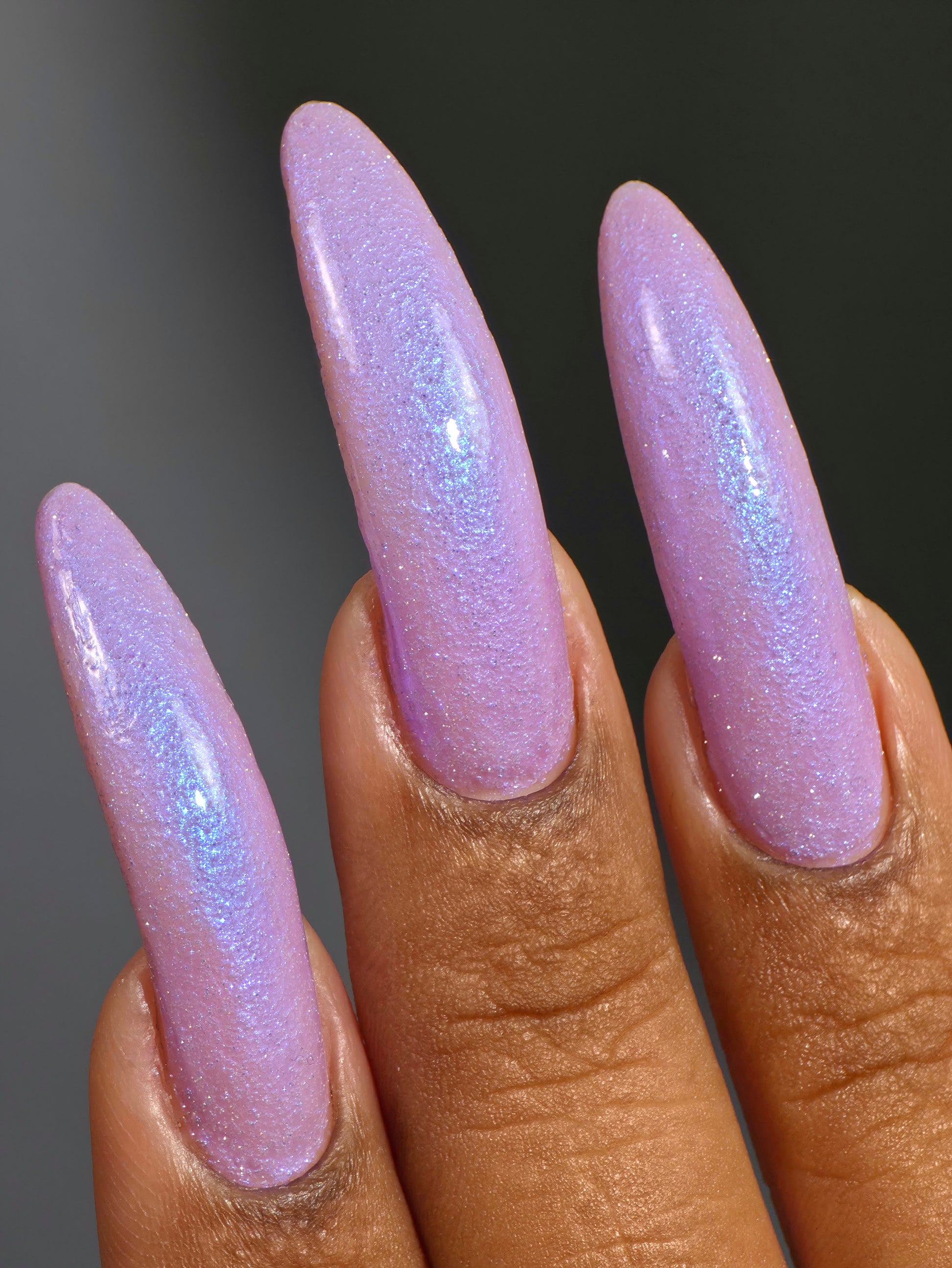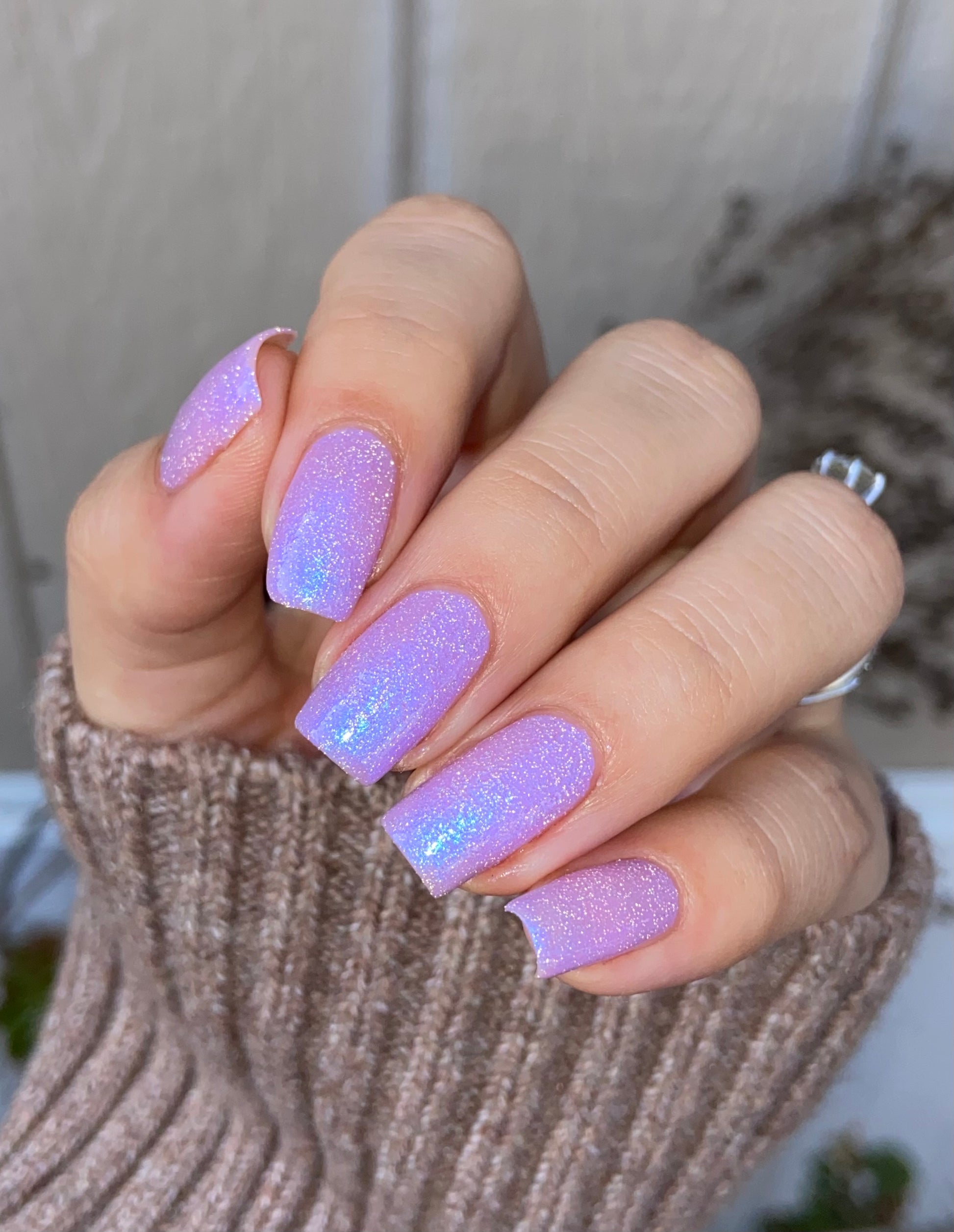 A lilac (purplish pink) crelly base with glowy blue shimmer and subtle silver light reflective glitter