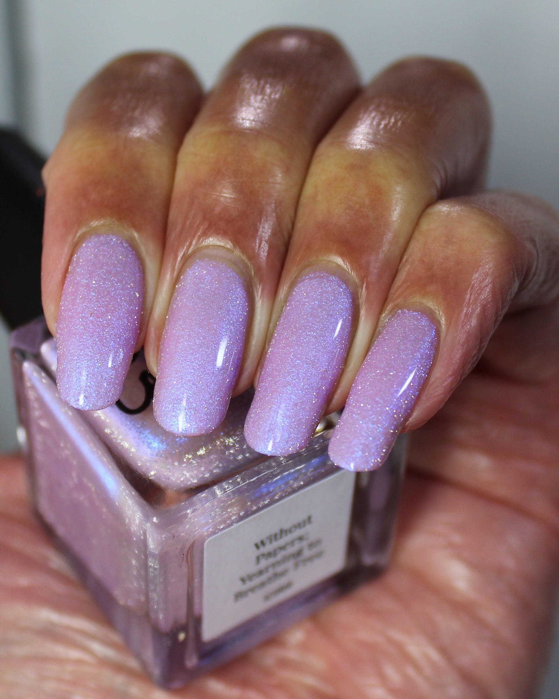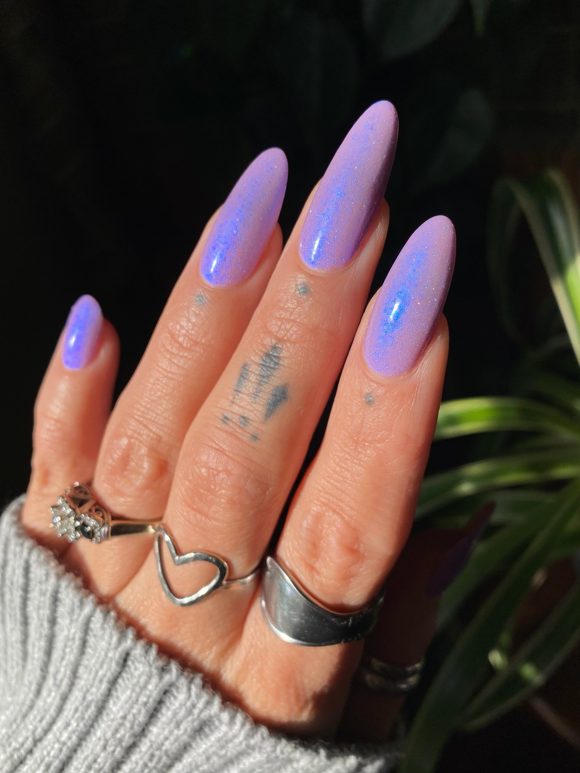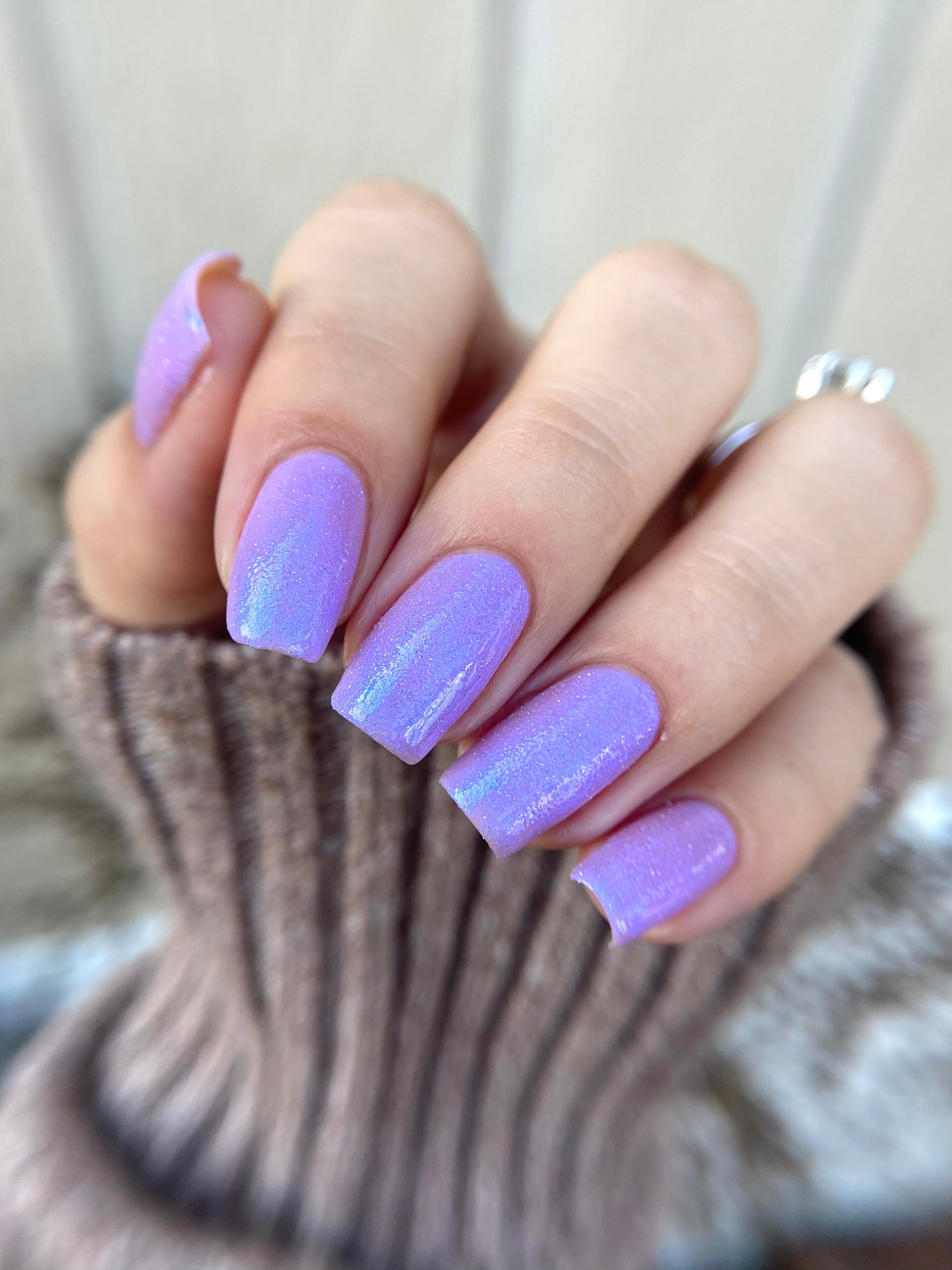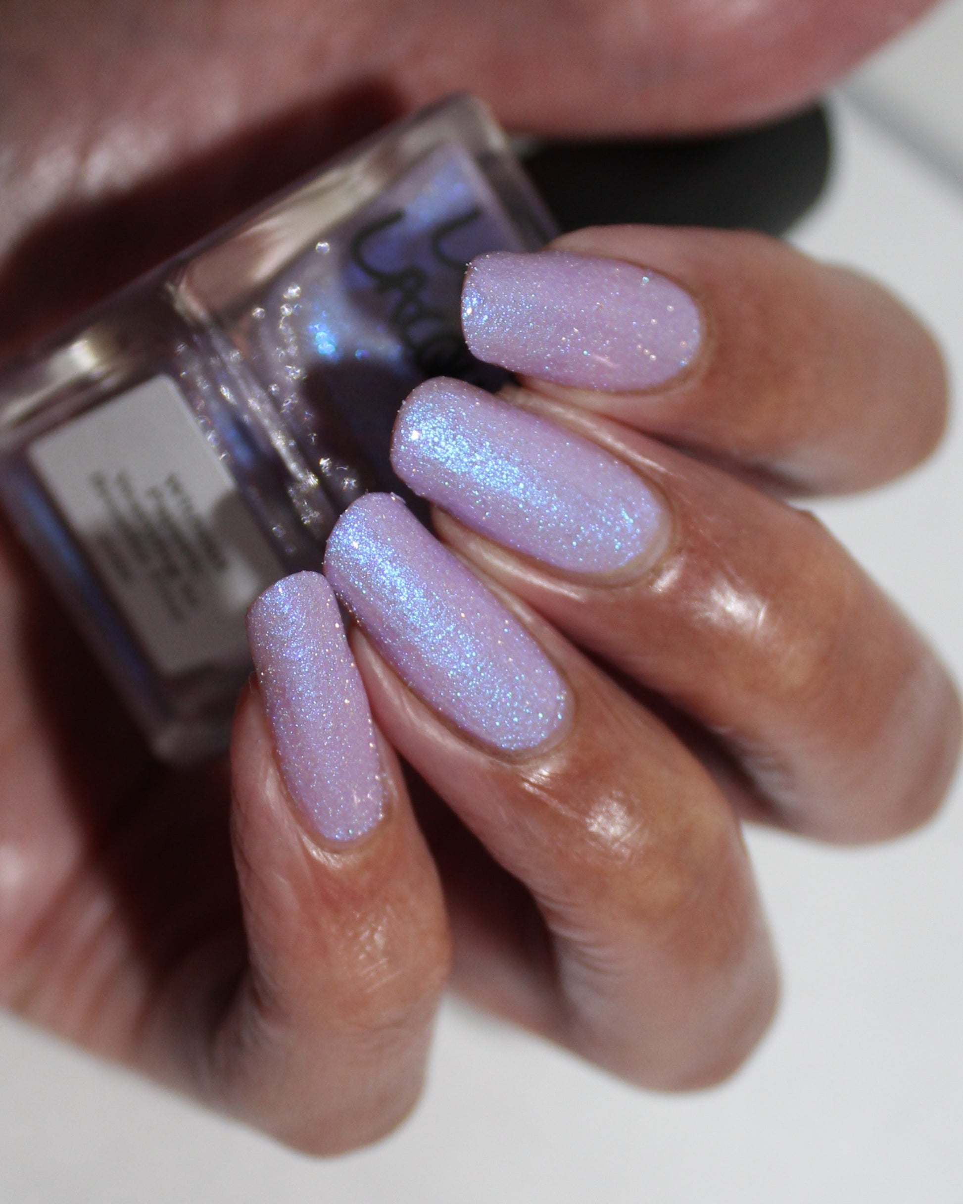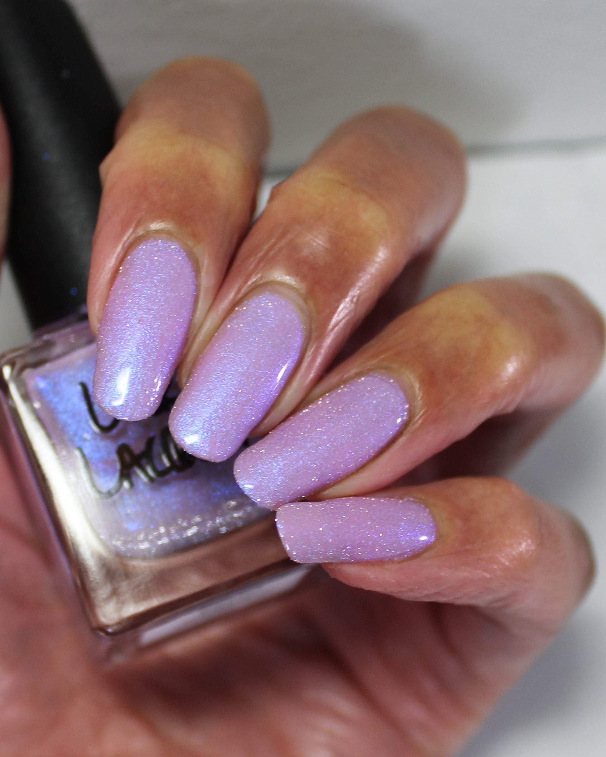 A lilac (purplish pink) crelly base with glowy blue shimmer and subtle silver light reflective glitter