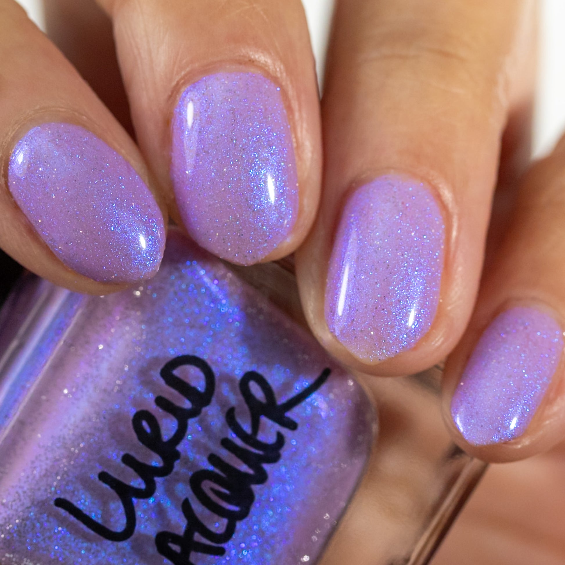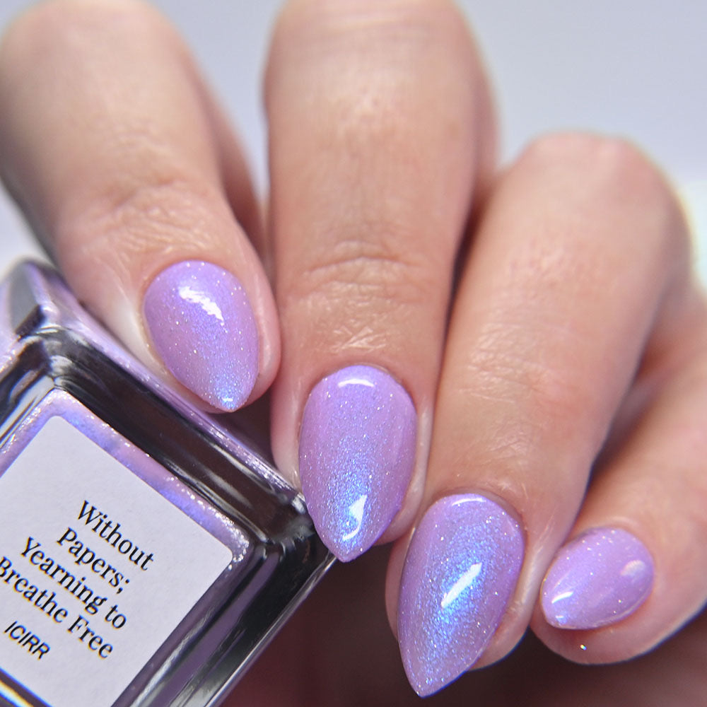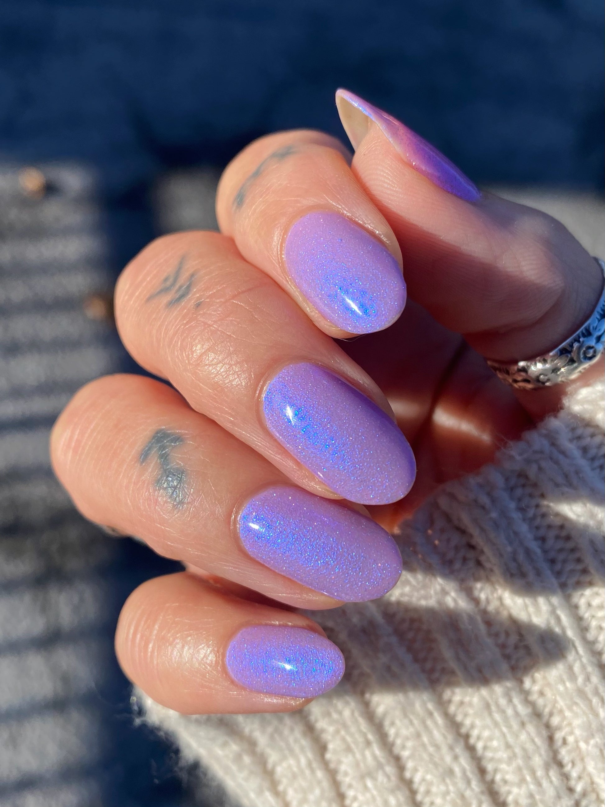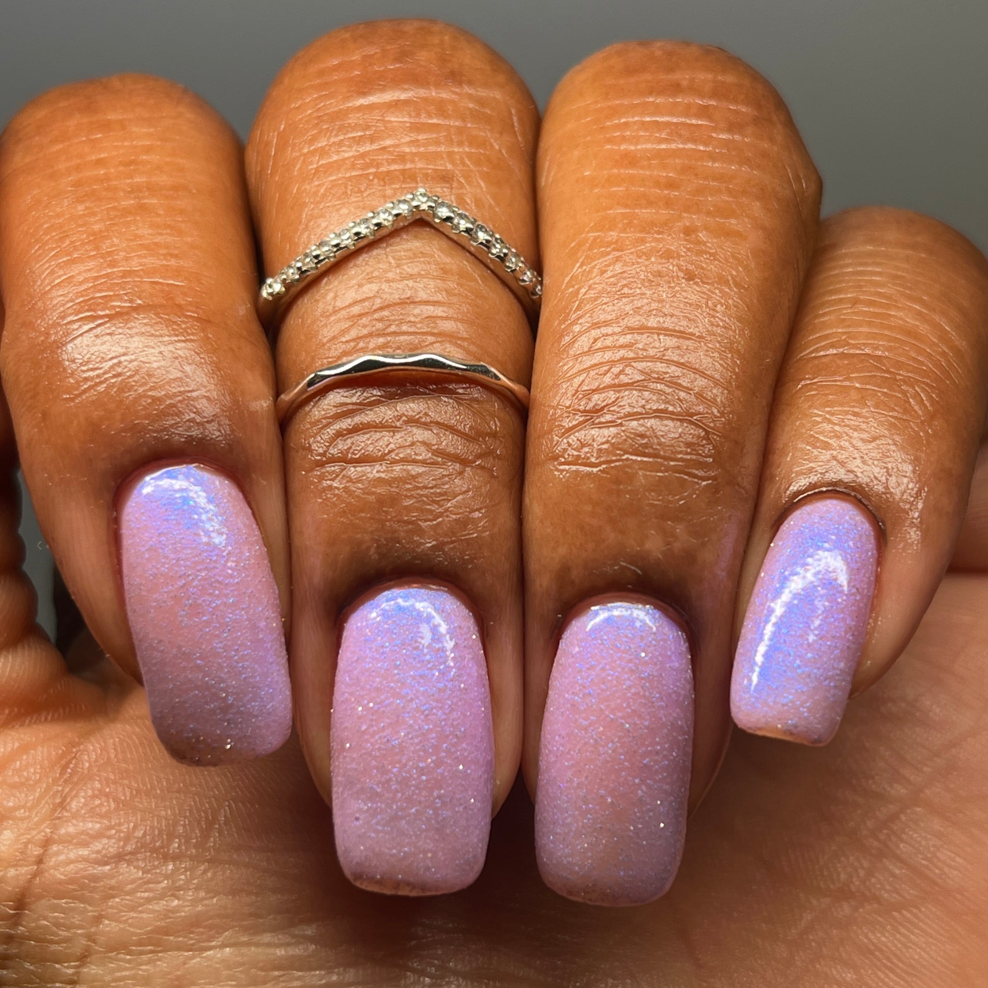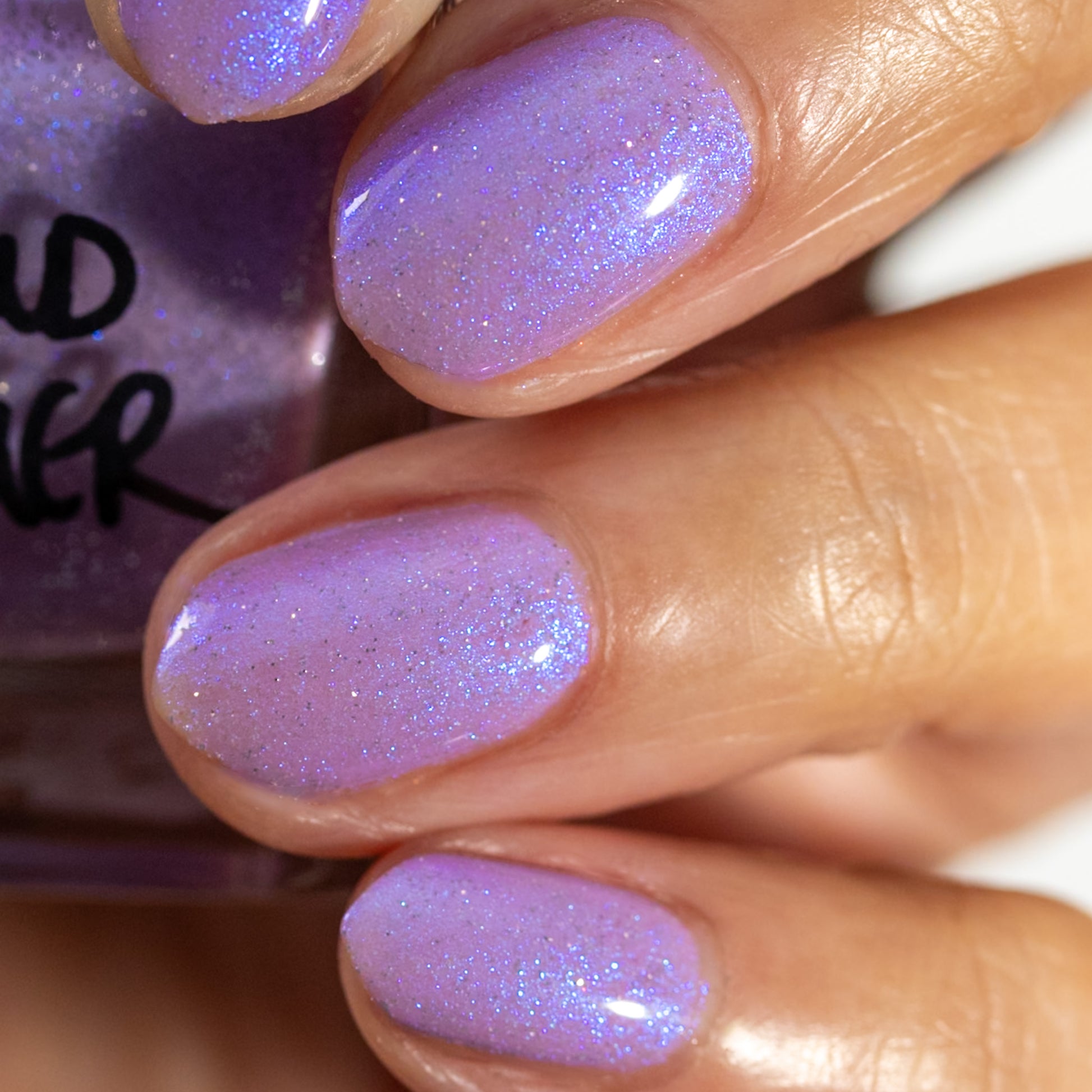 A lilac (purplish pink) crelly base with glowy blue shimmer and subtle silver light reflective glitter