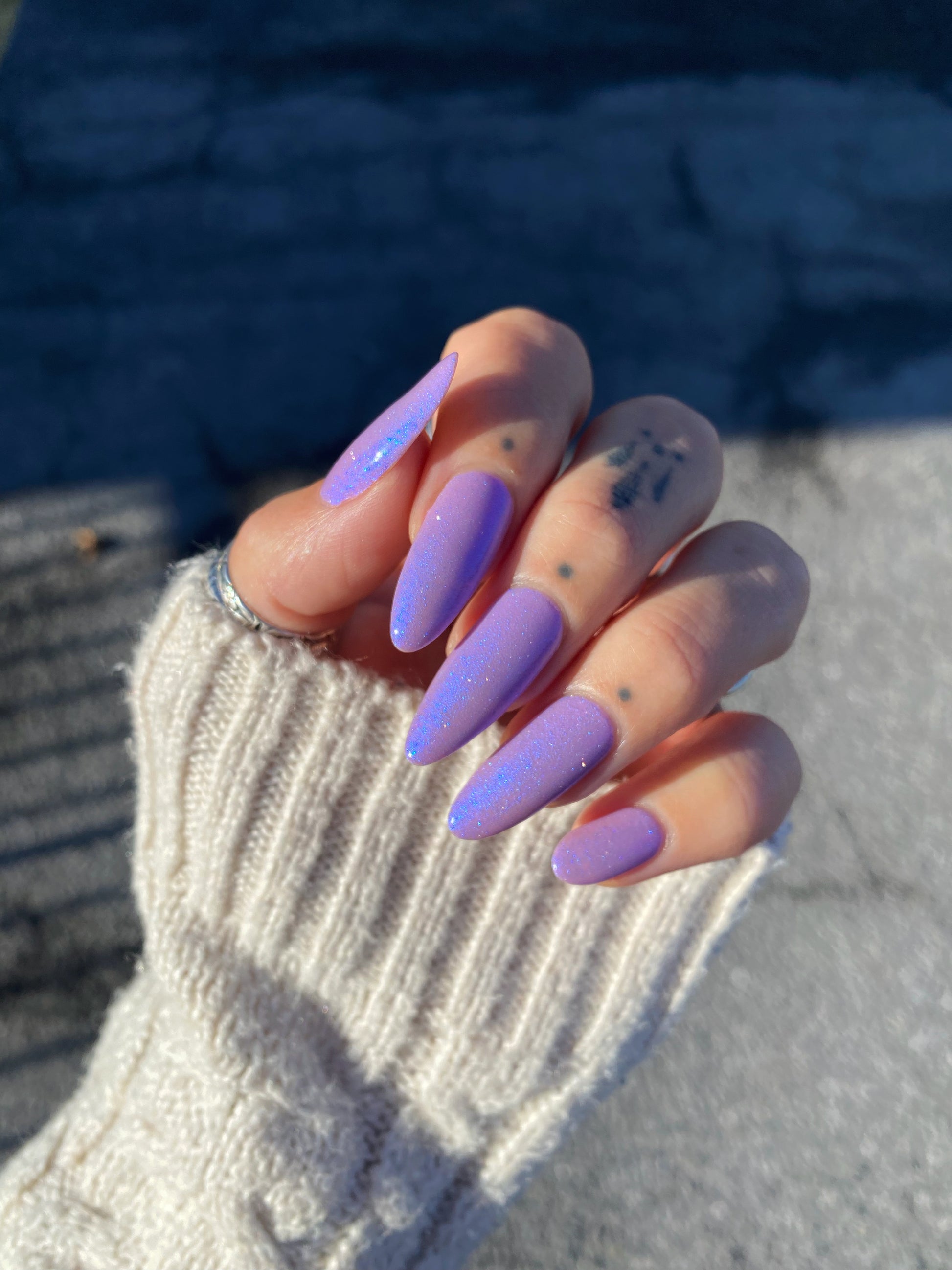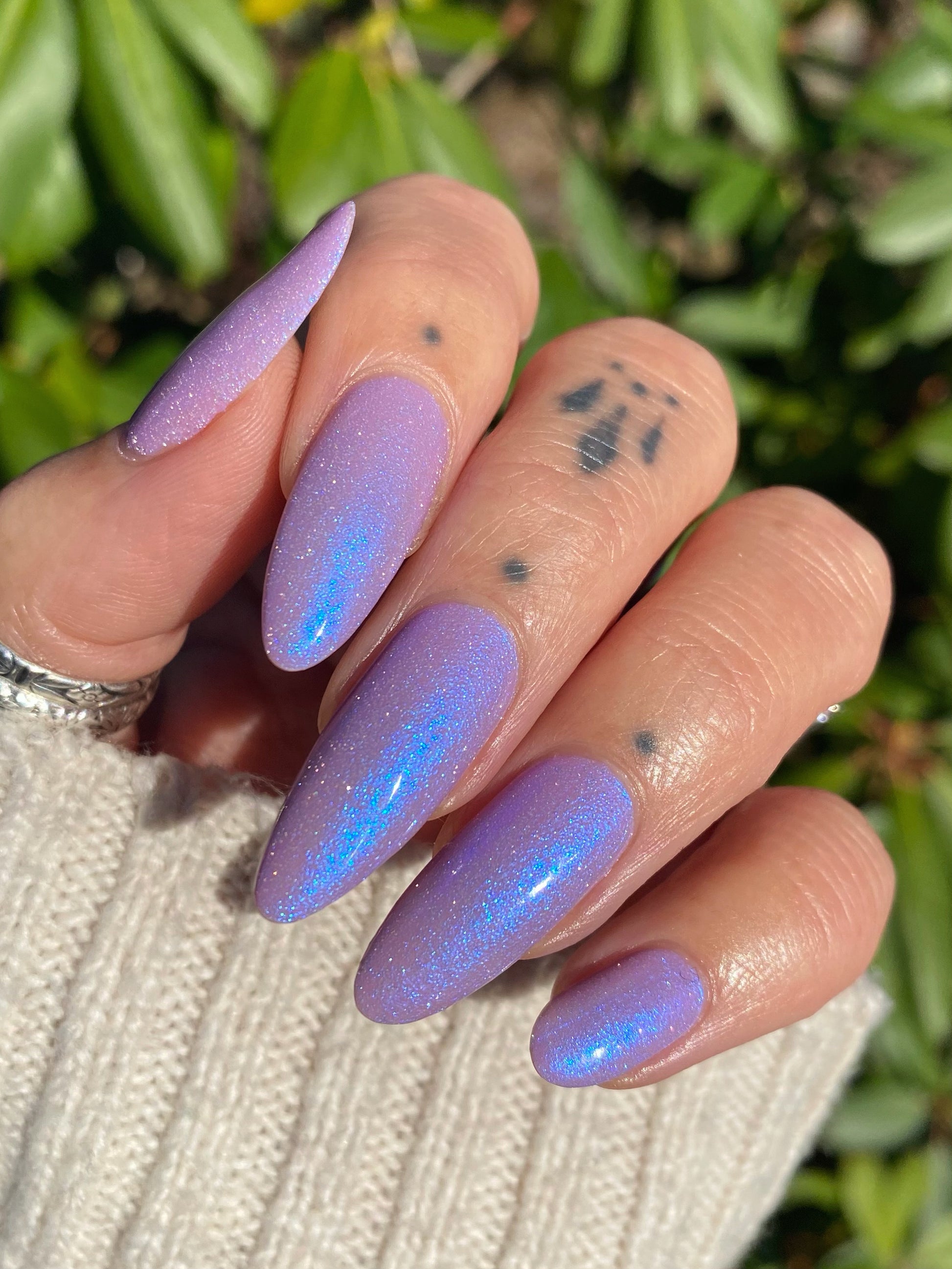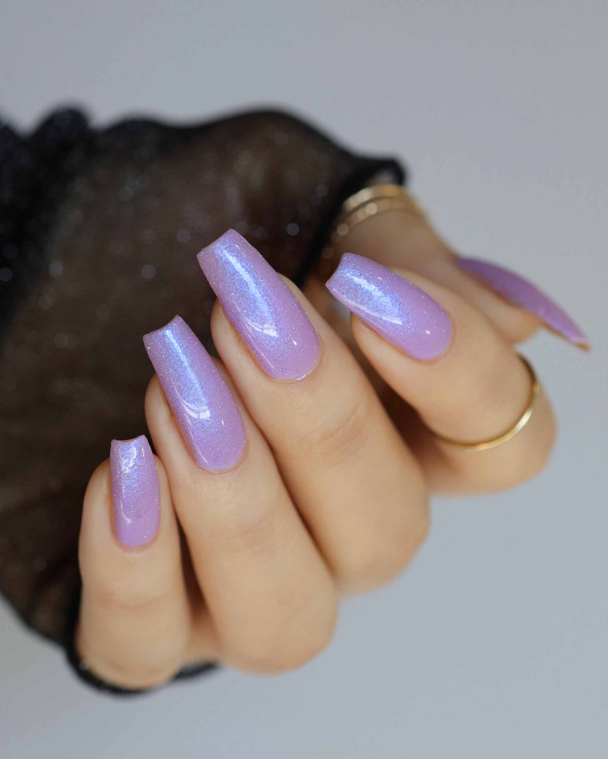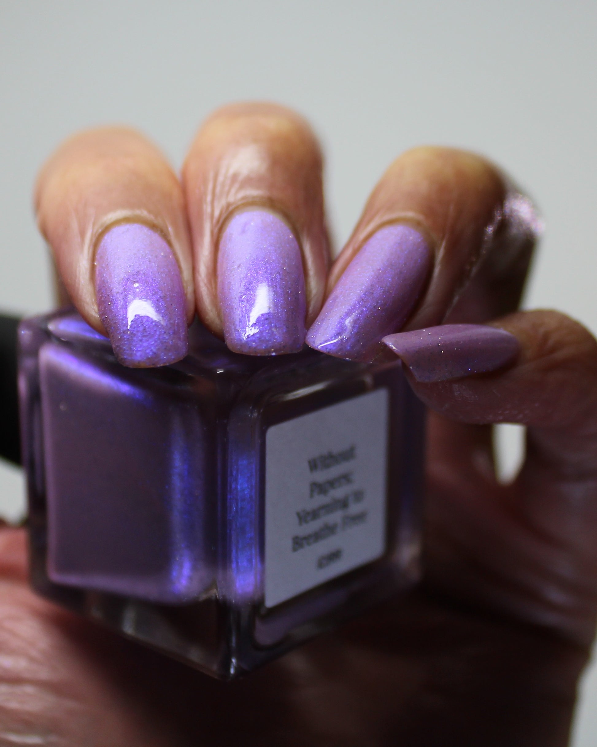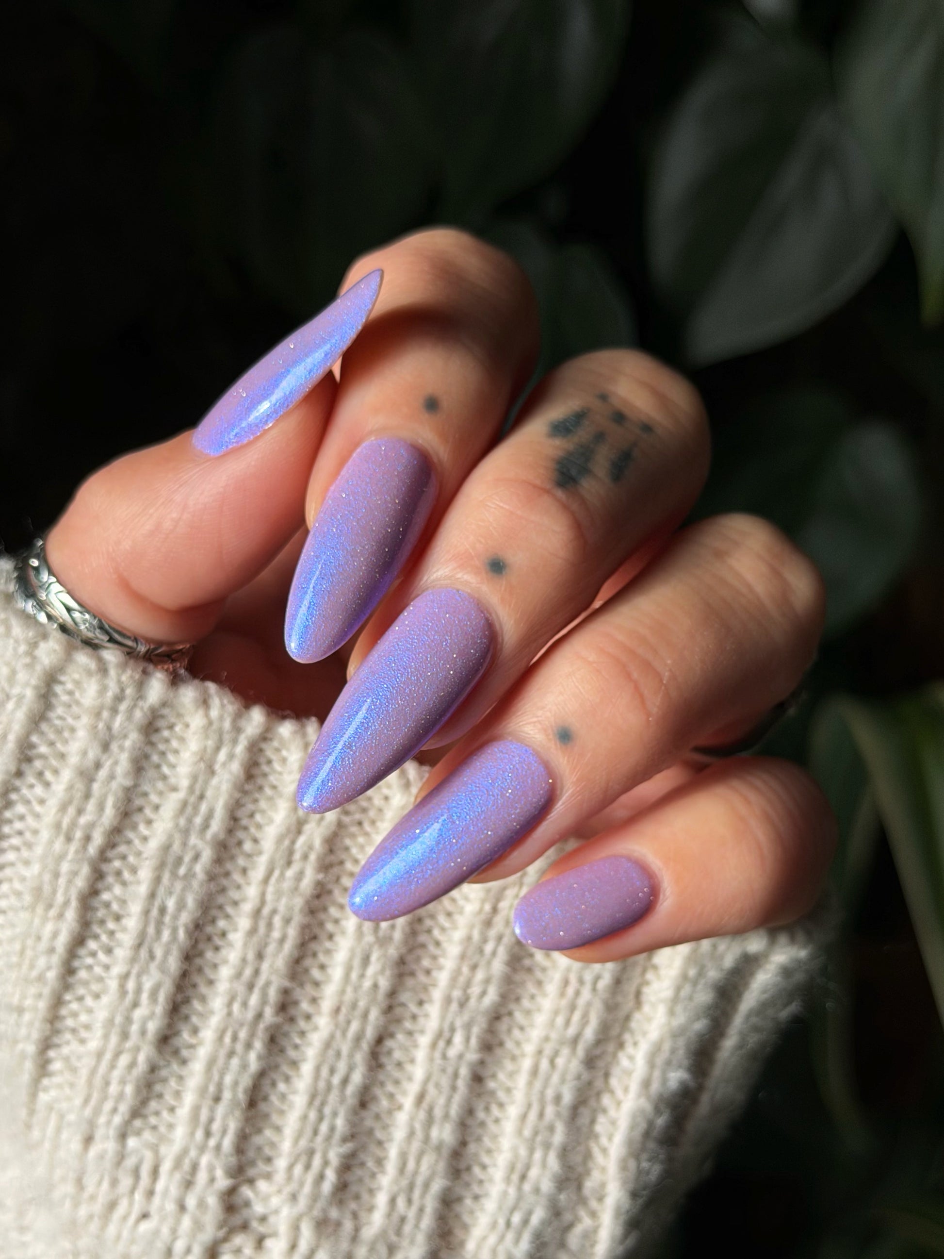 A lilac (purplish pink) crelly base with glowy blue shimmer and subtle silver light reflective glitter