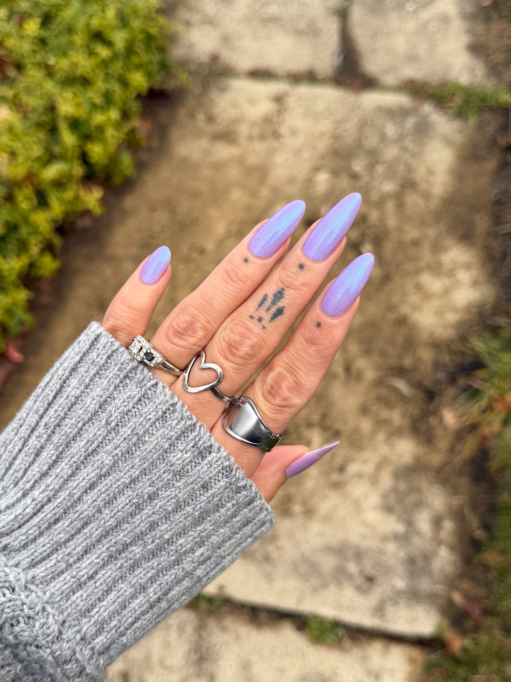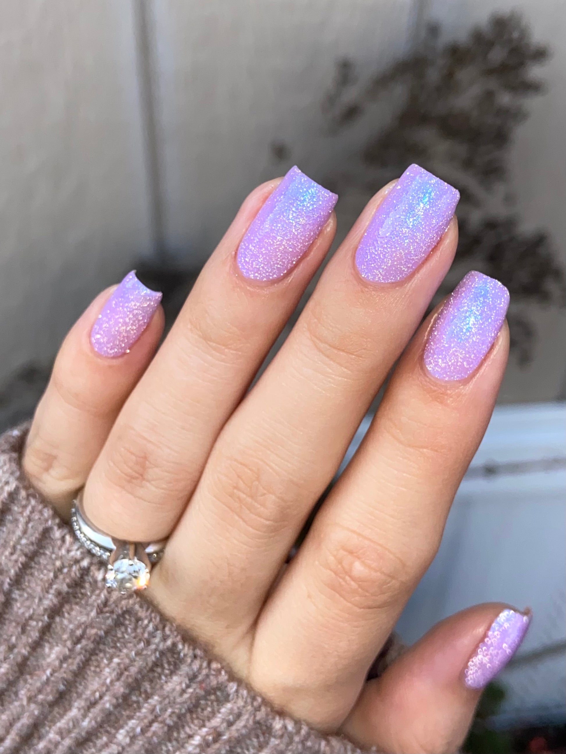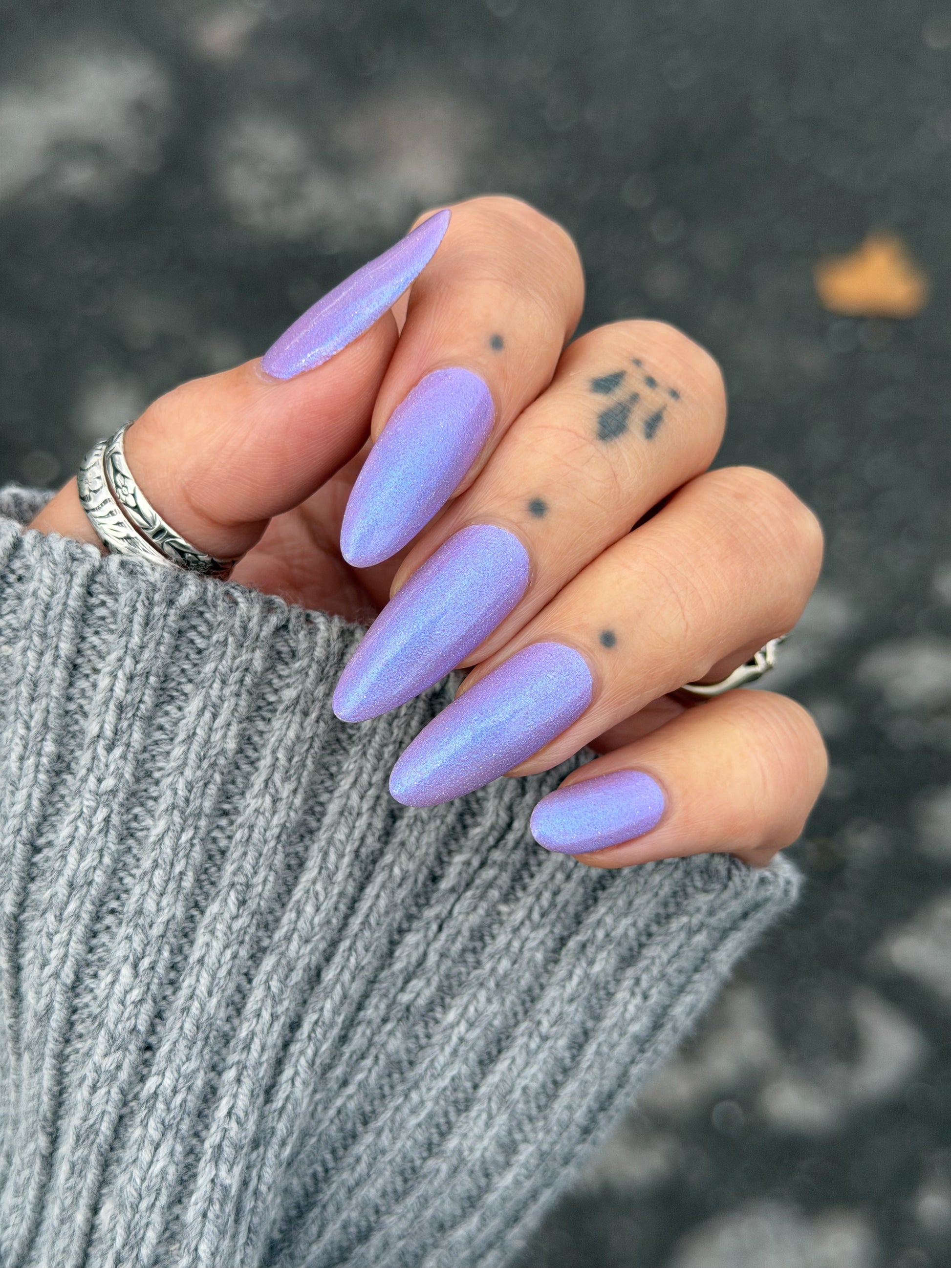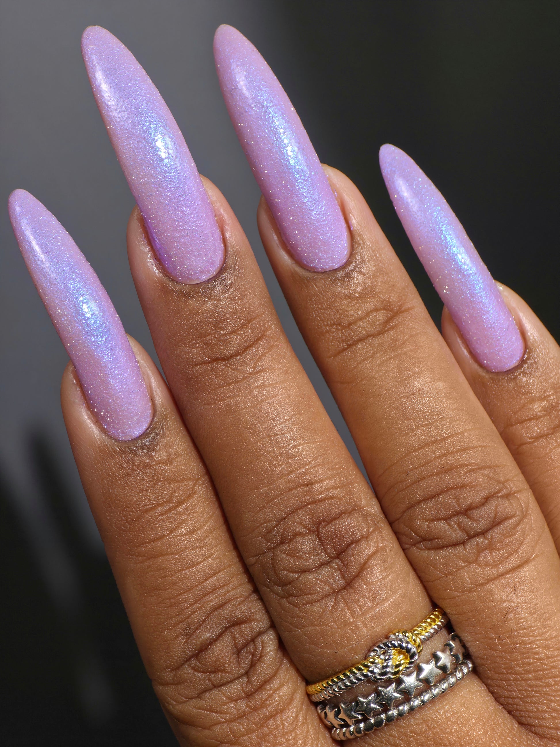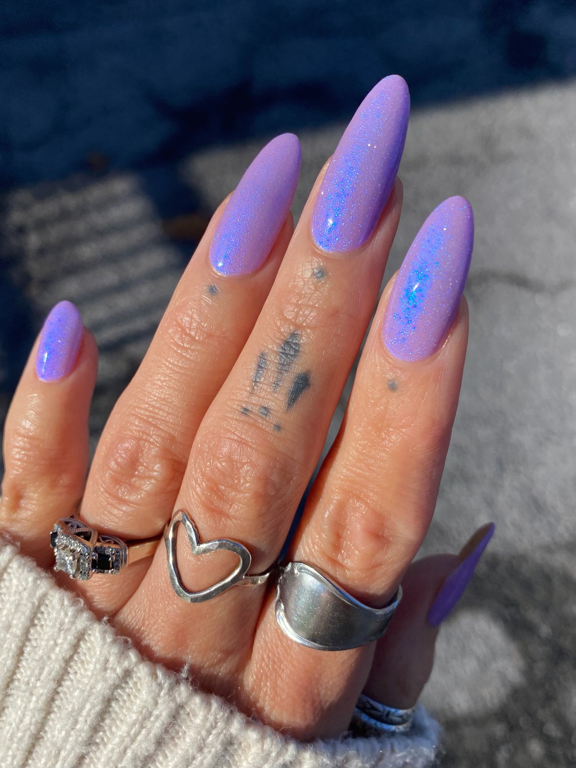 A lilac (purplish pink) crelly base with glowy blue shimmer and subtle silver light reflective glitter