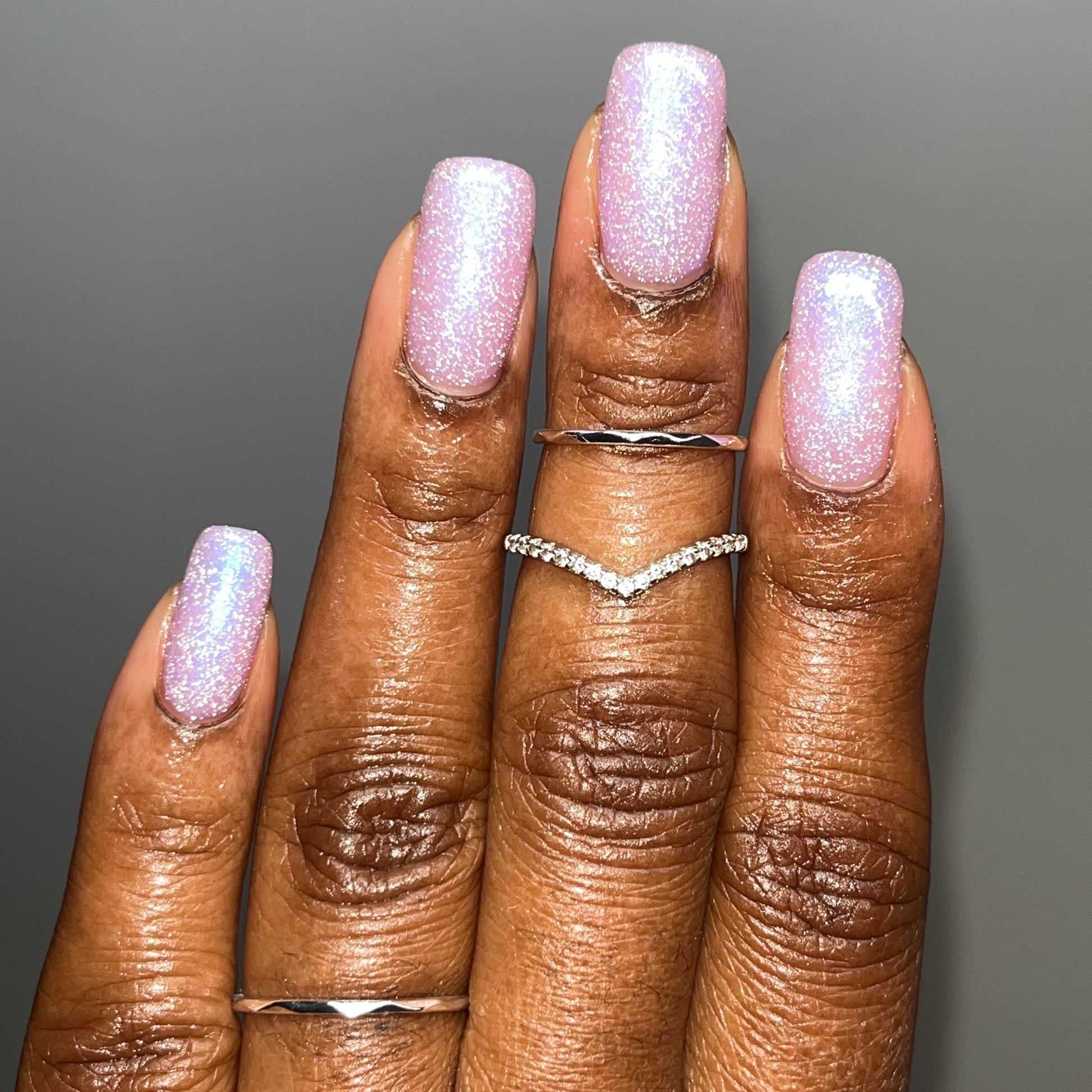 Please note: Reflective glitter polishes are textured and dry down with a gritty, sandpaper feeling. To make them look smooth and glossy, I recommend applying 2-3 coats of the polish, then applying one coat of a glitter smoother, followed by one coat of top coat.