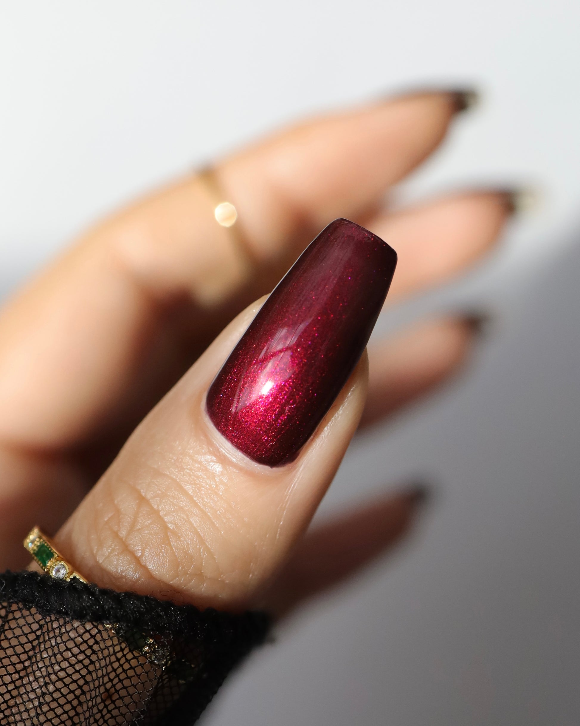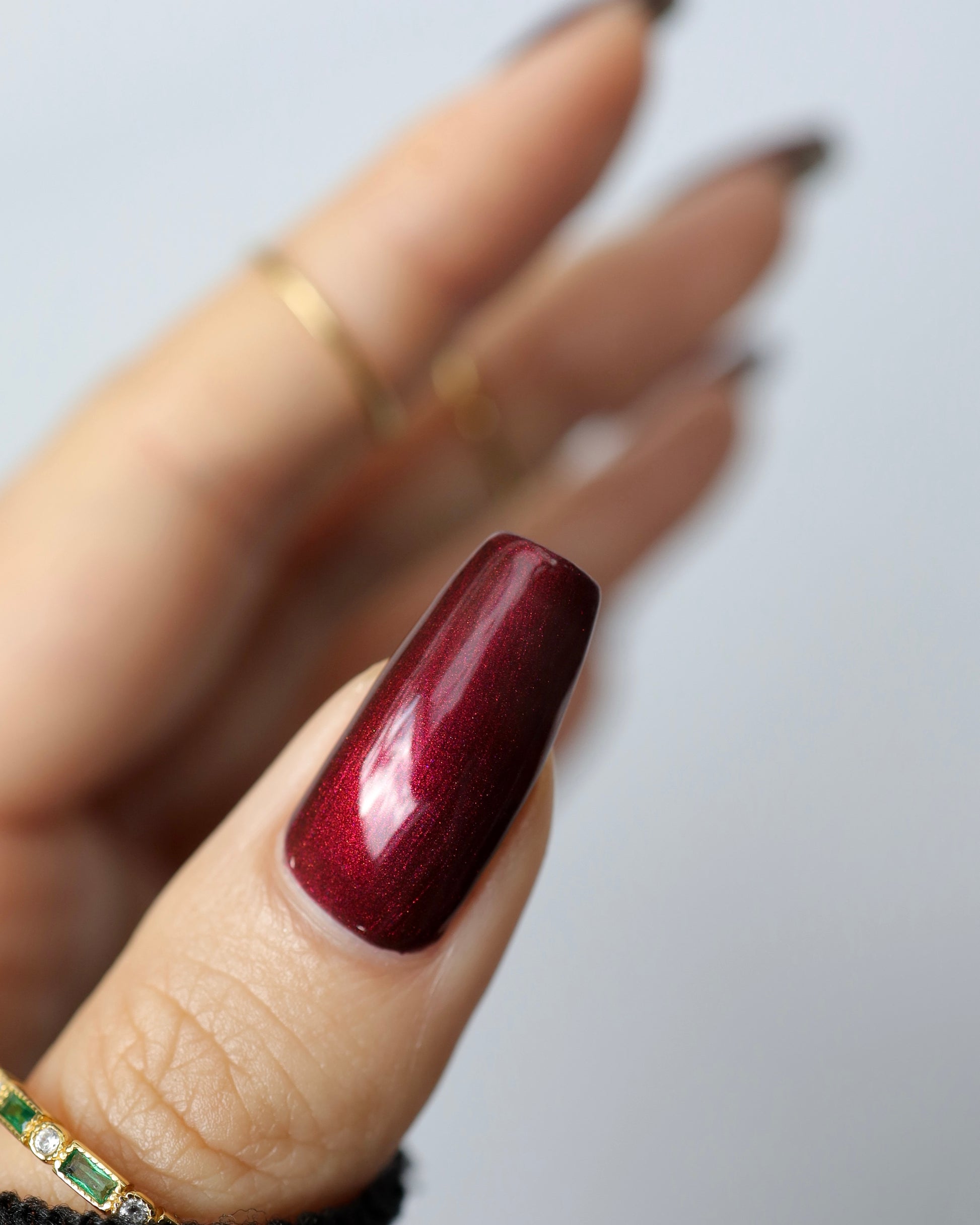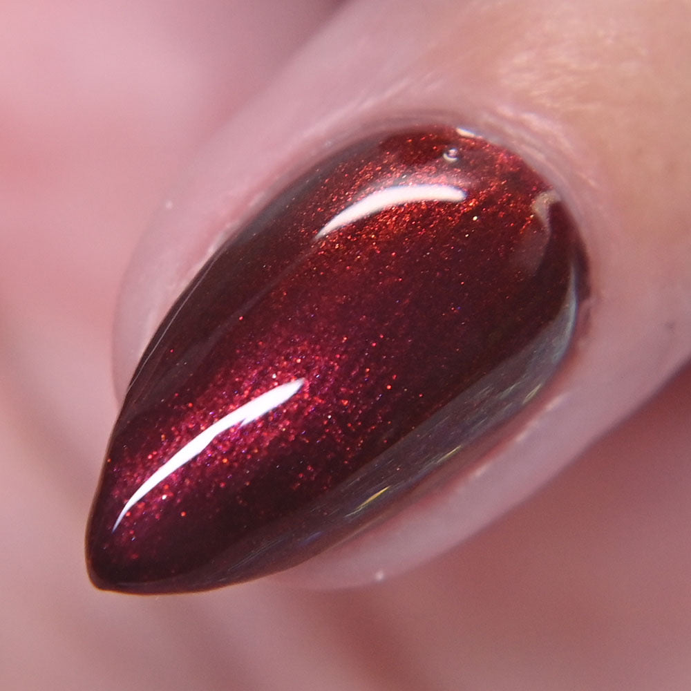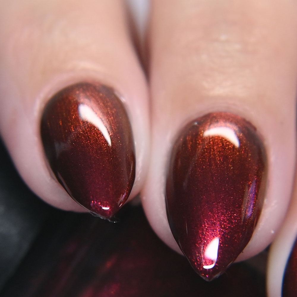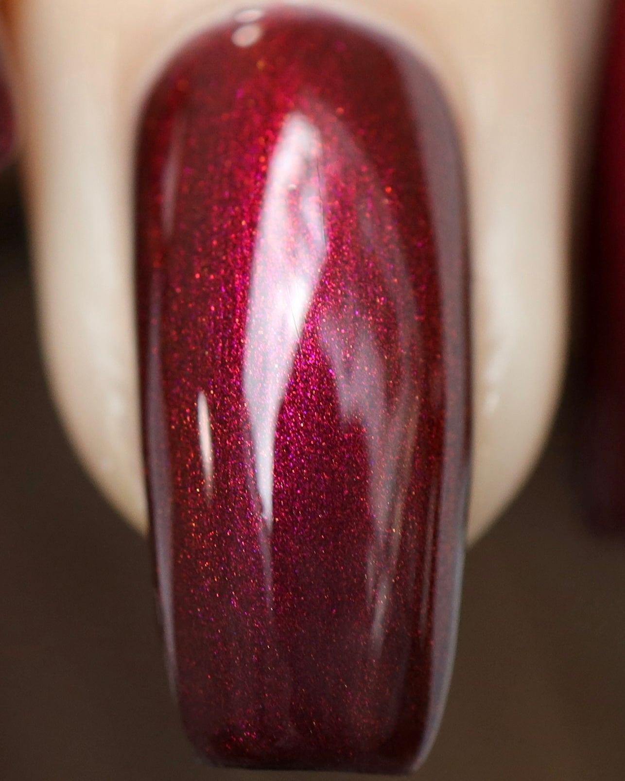 Please note that the shimmer is so strong in this polish that it mostly appears as a red polish on the nail, with hints of the base color visible at extremes.