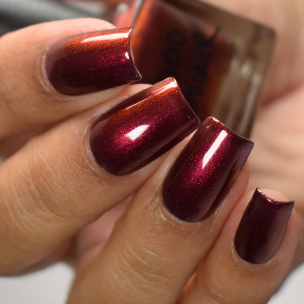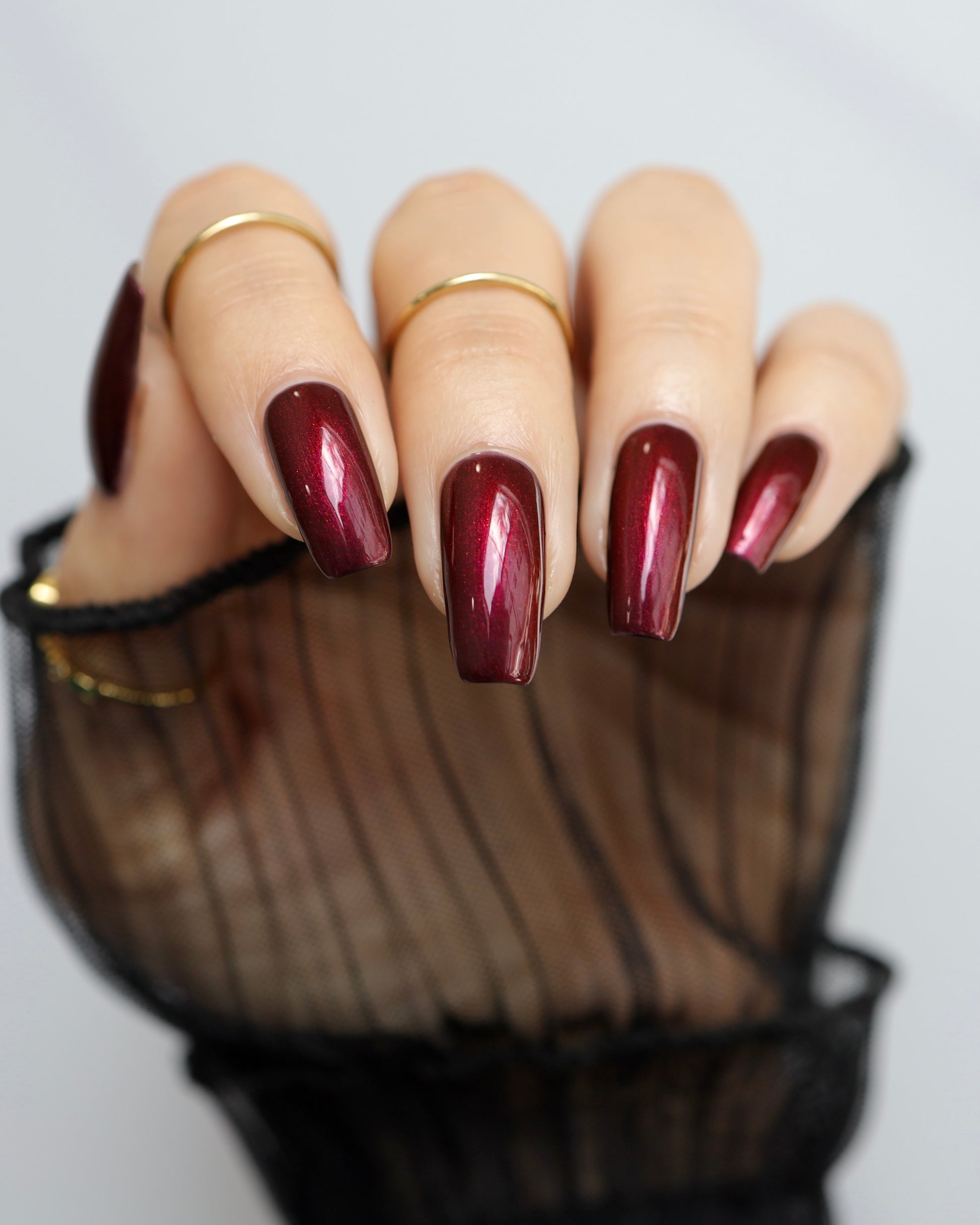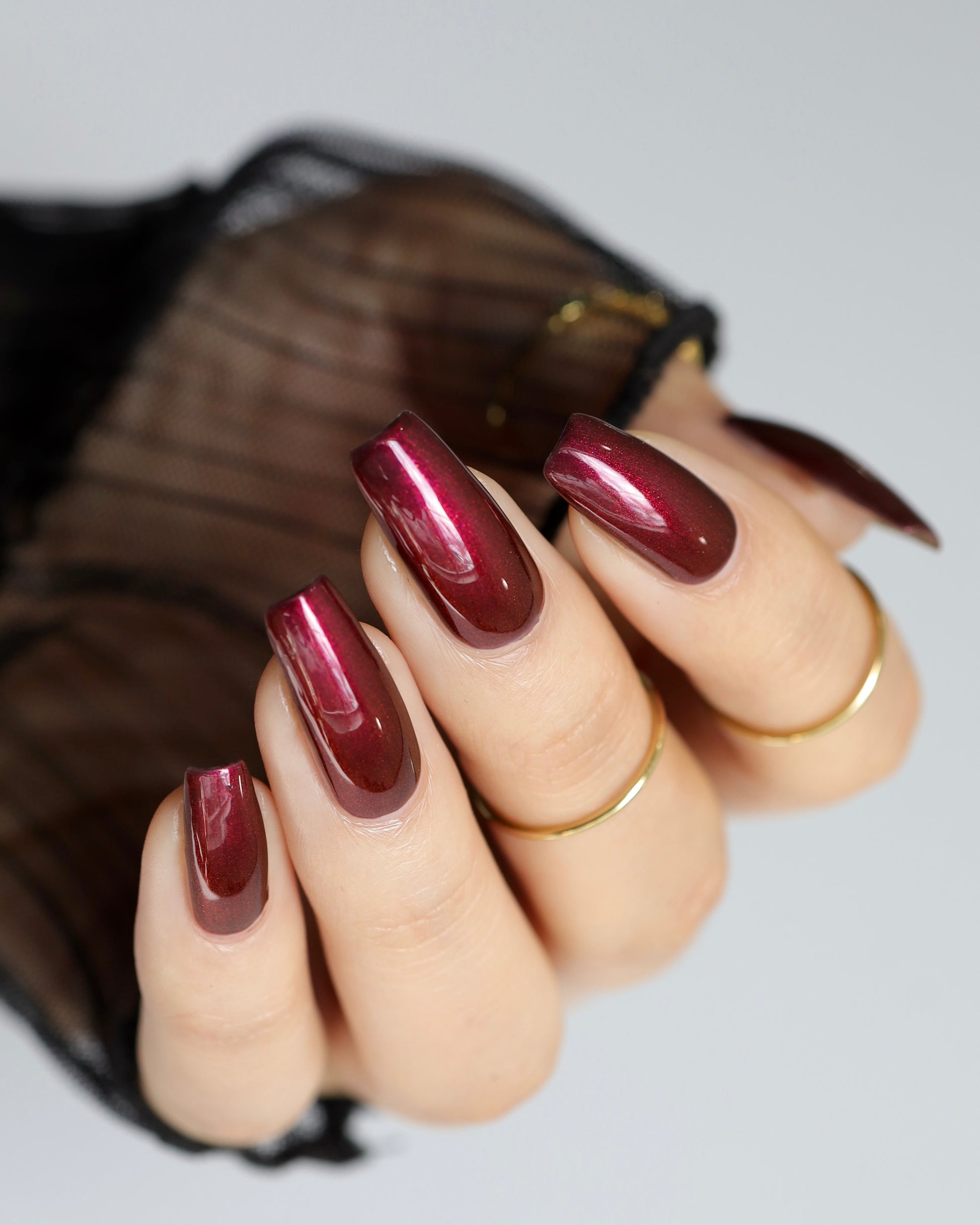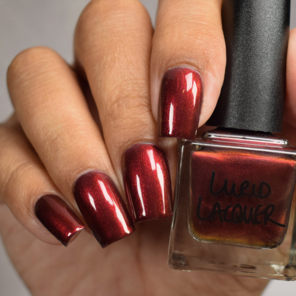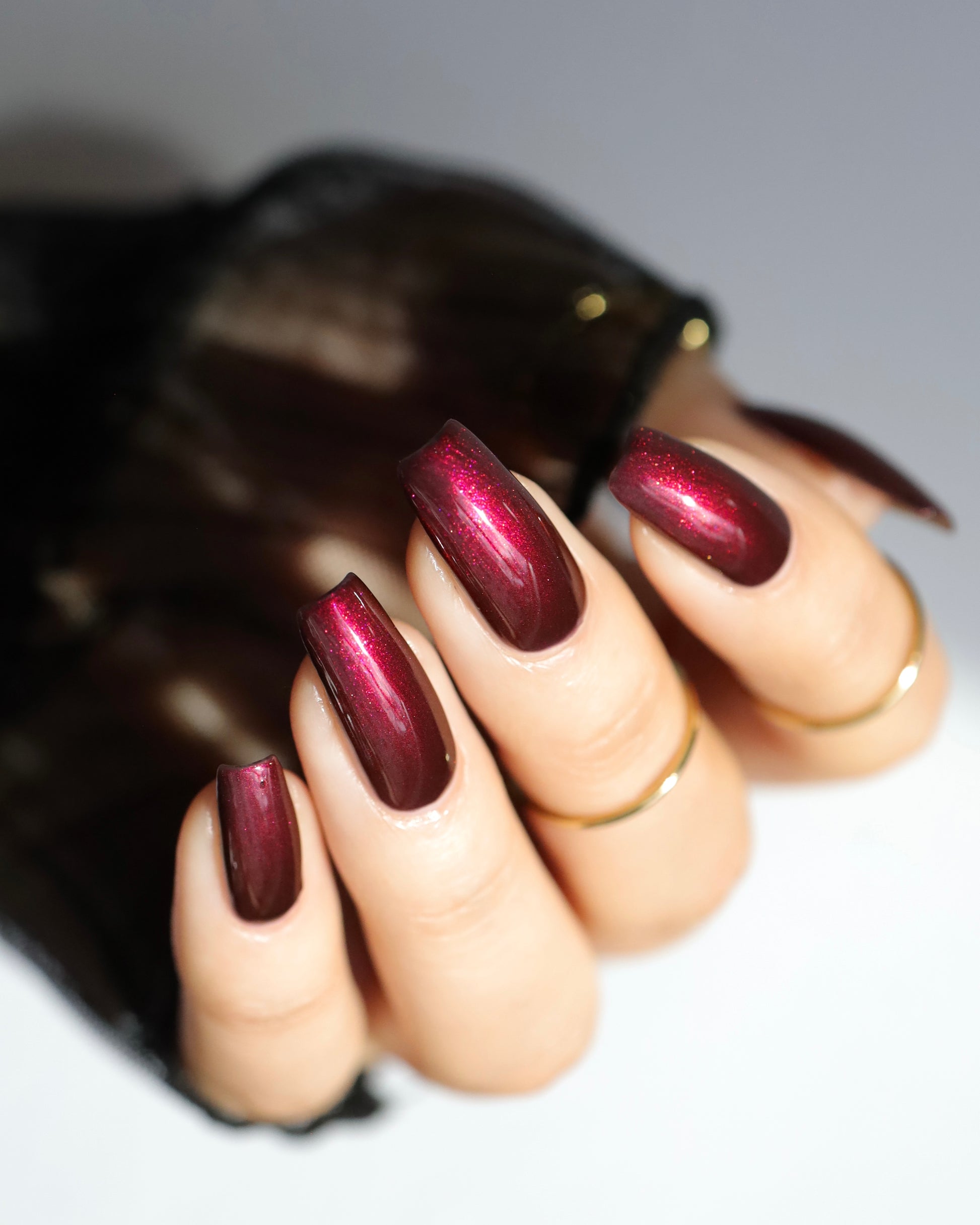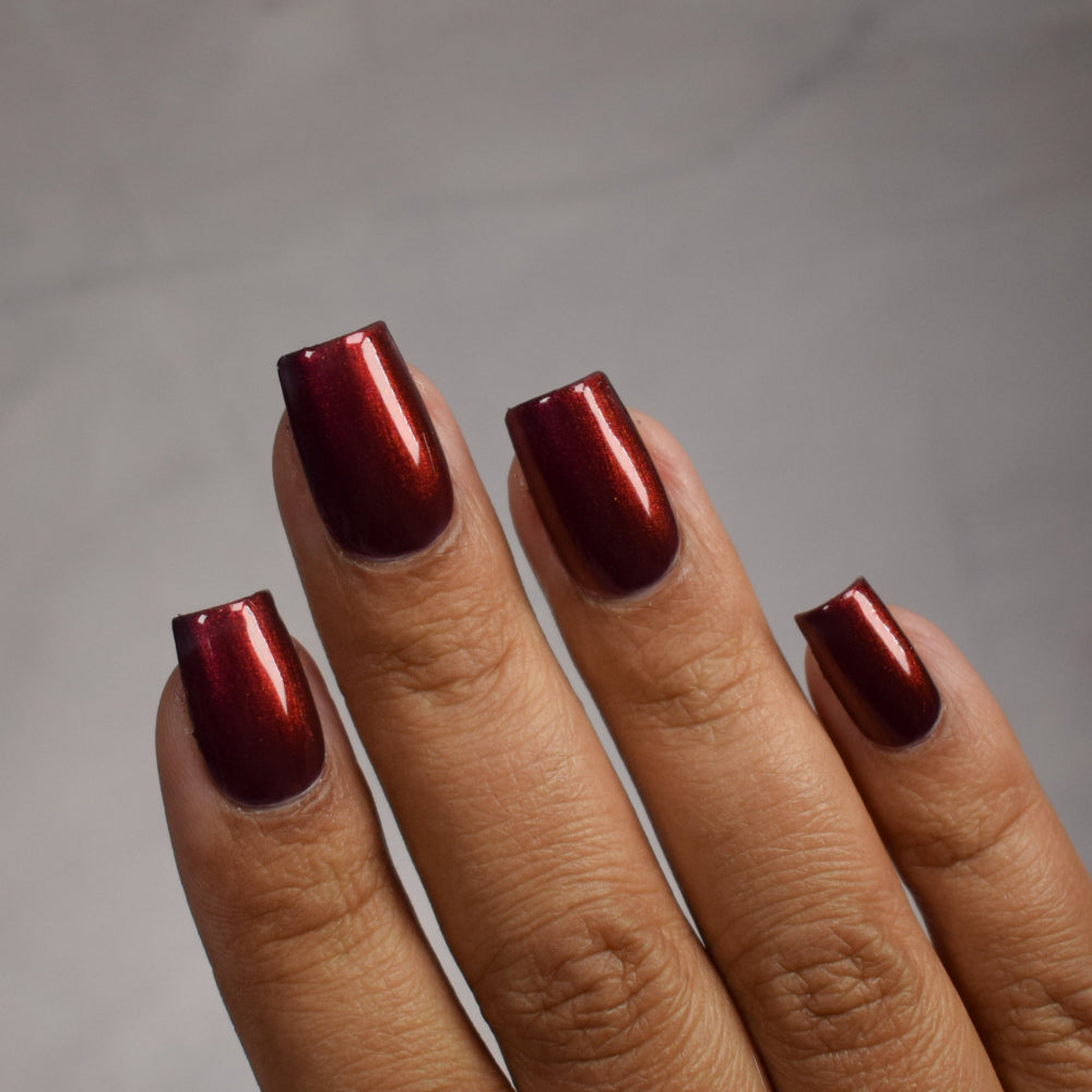 Please note that the shimmer is so strong in this polish that it mostly appears as a red polish on the nail, with hints of the base color visible at extremes.