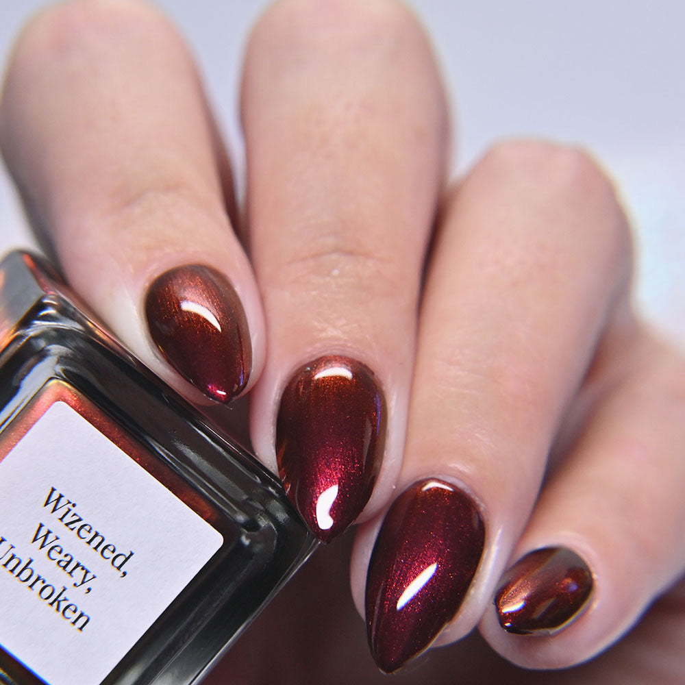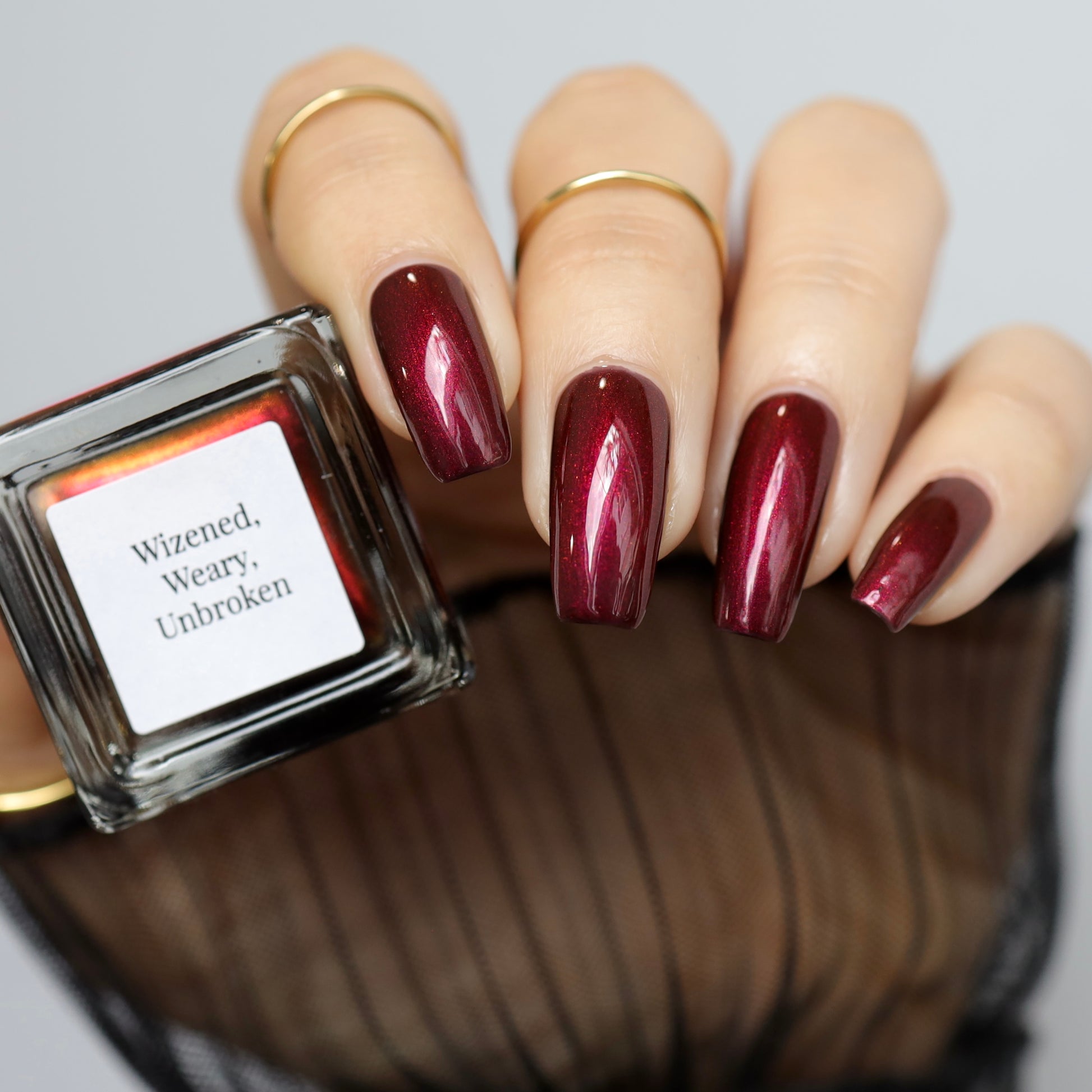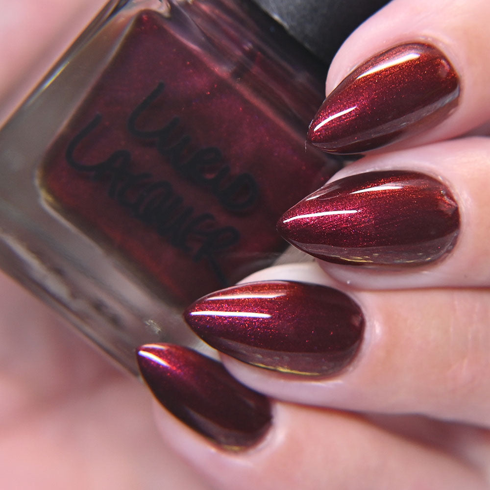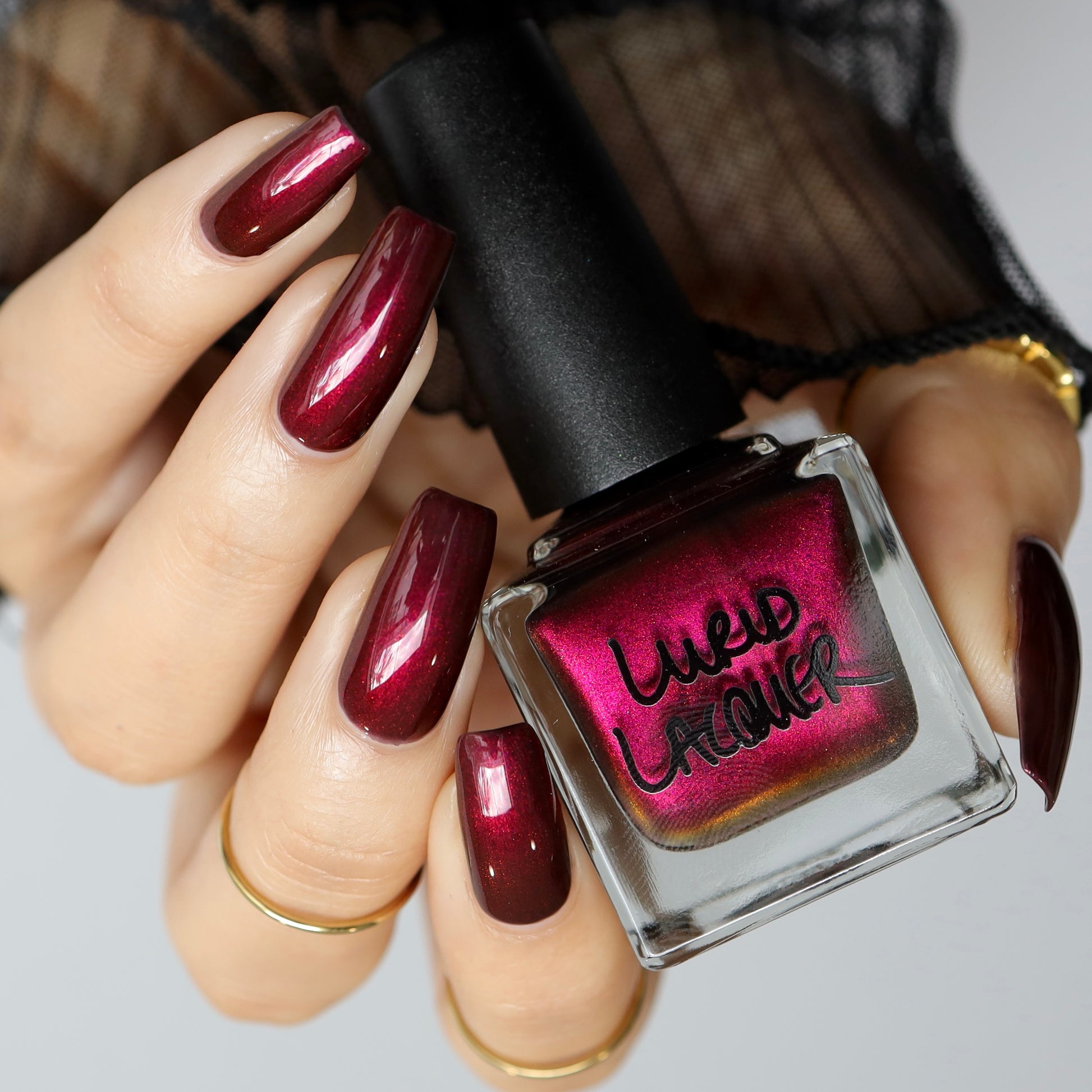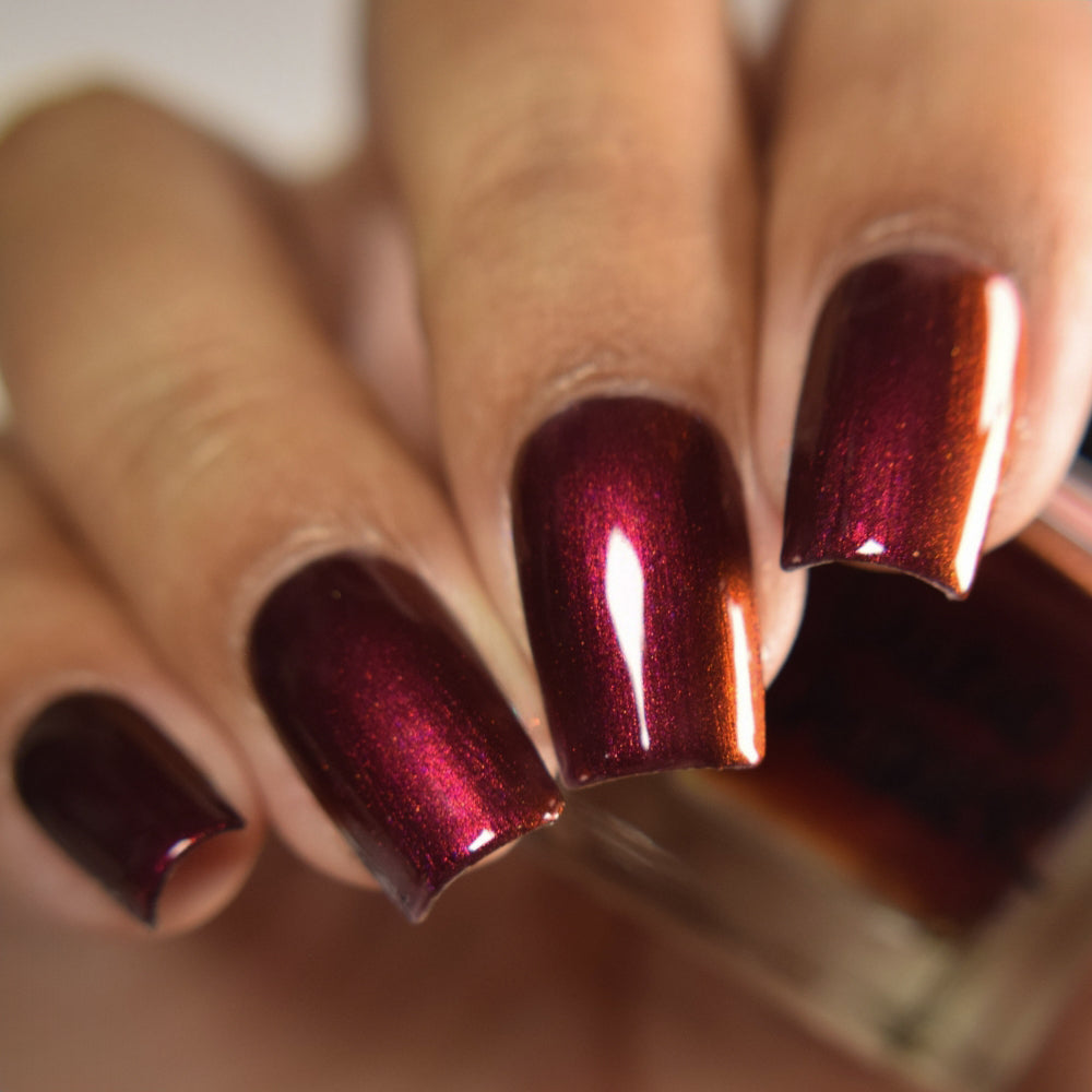 Please note that the shimmer is so strong in this polish that it mostly appears as a red polish on the nail, with hints of the base color visible at extremes.