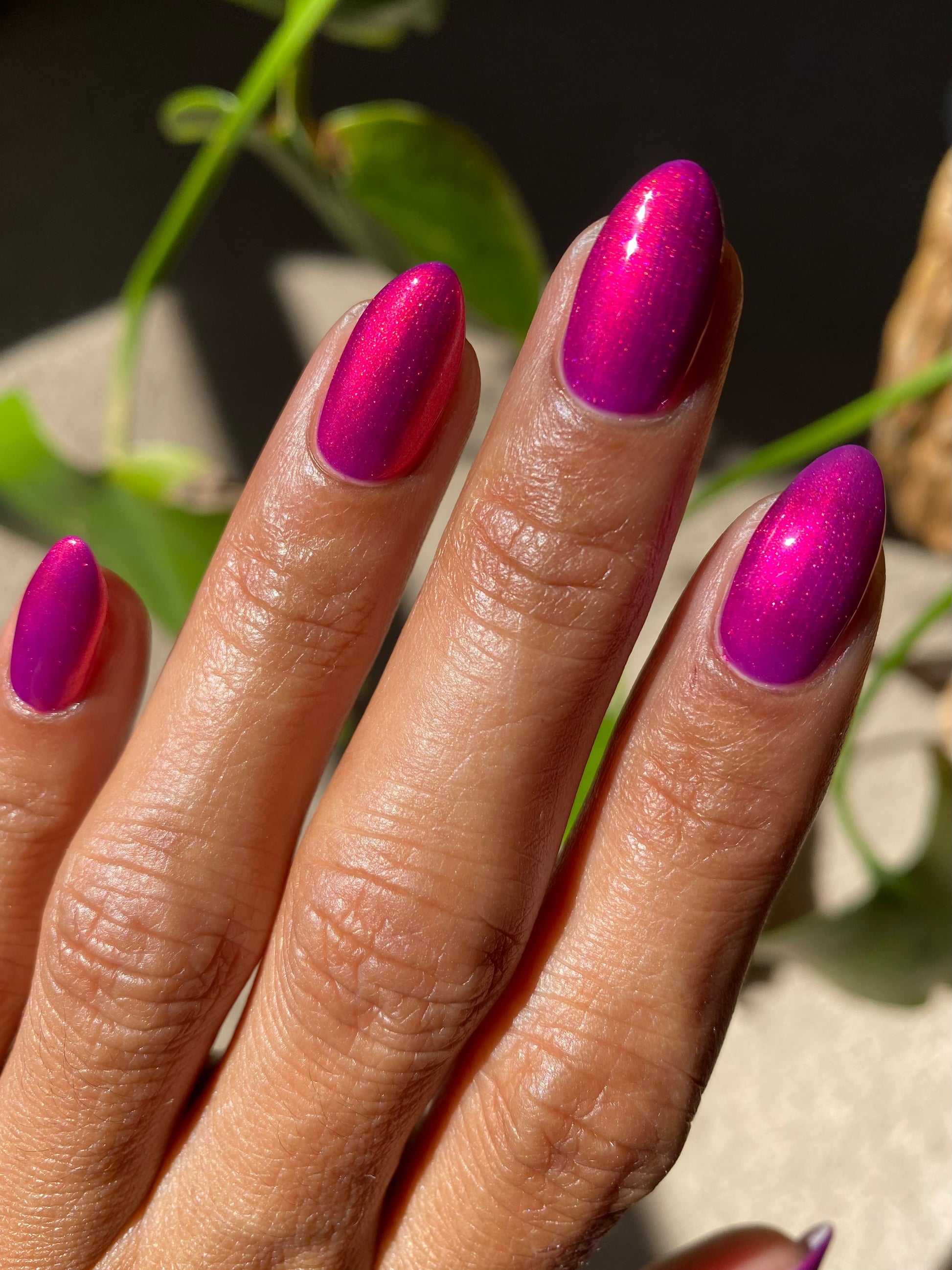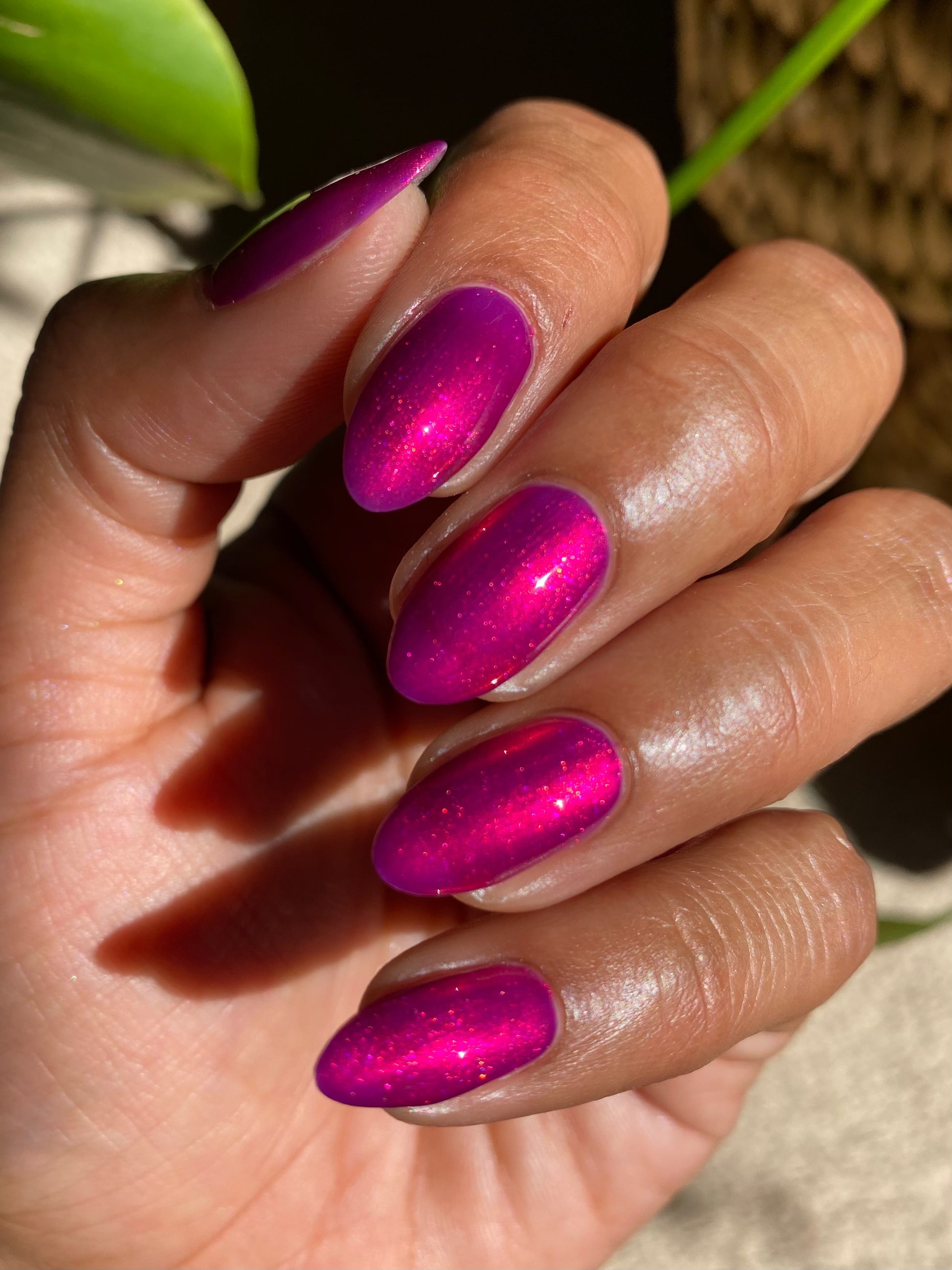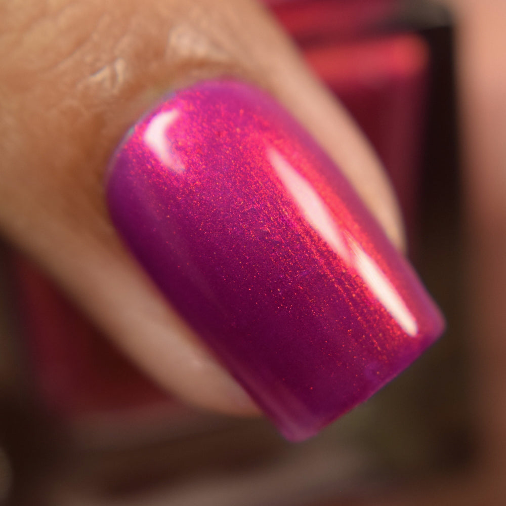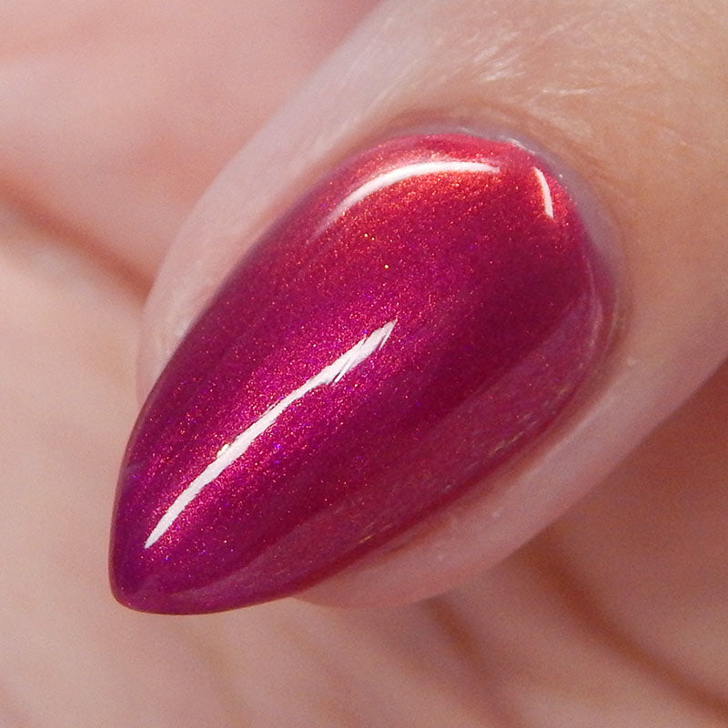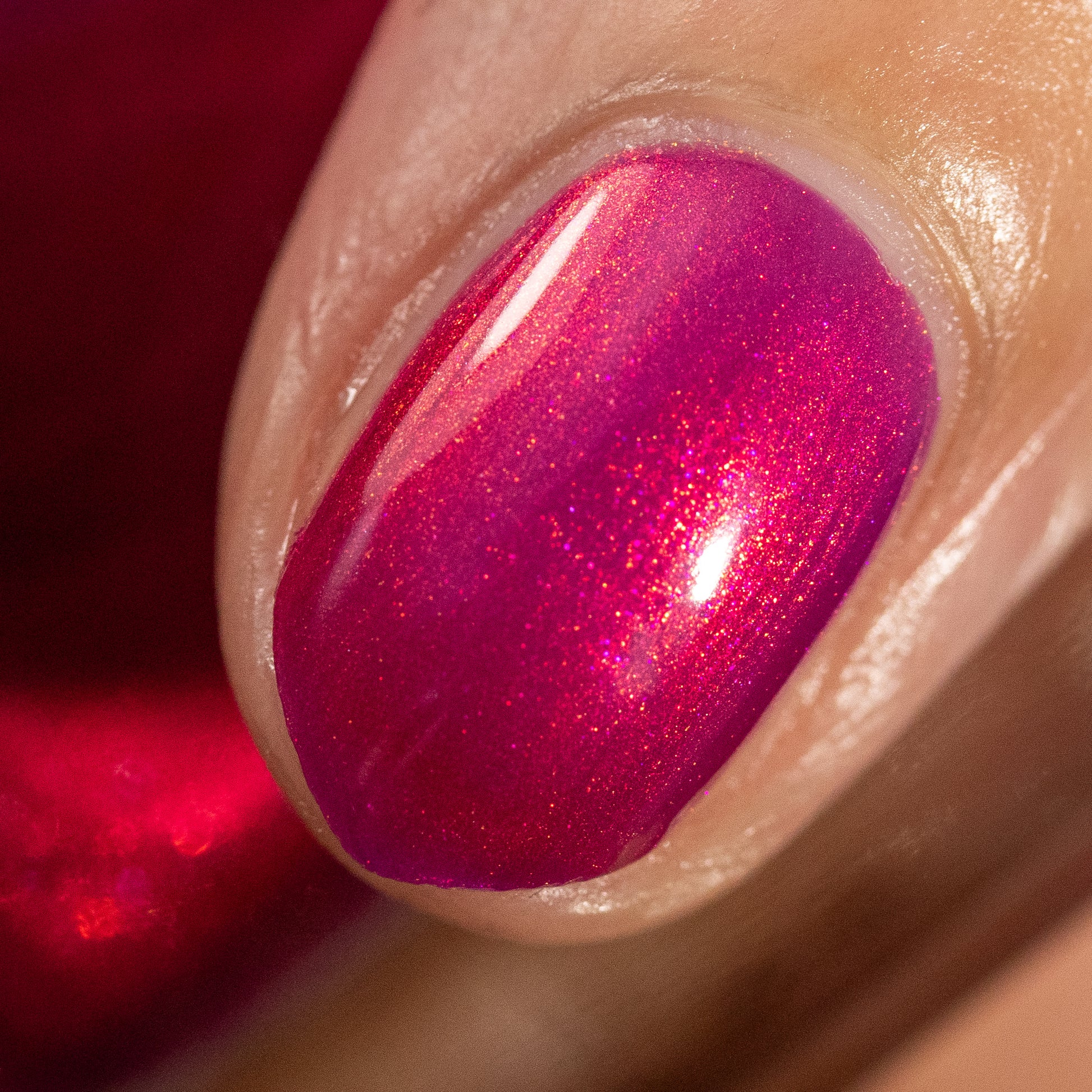 A reddish purple jelly base with glowy fine particle red to orange shimmer