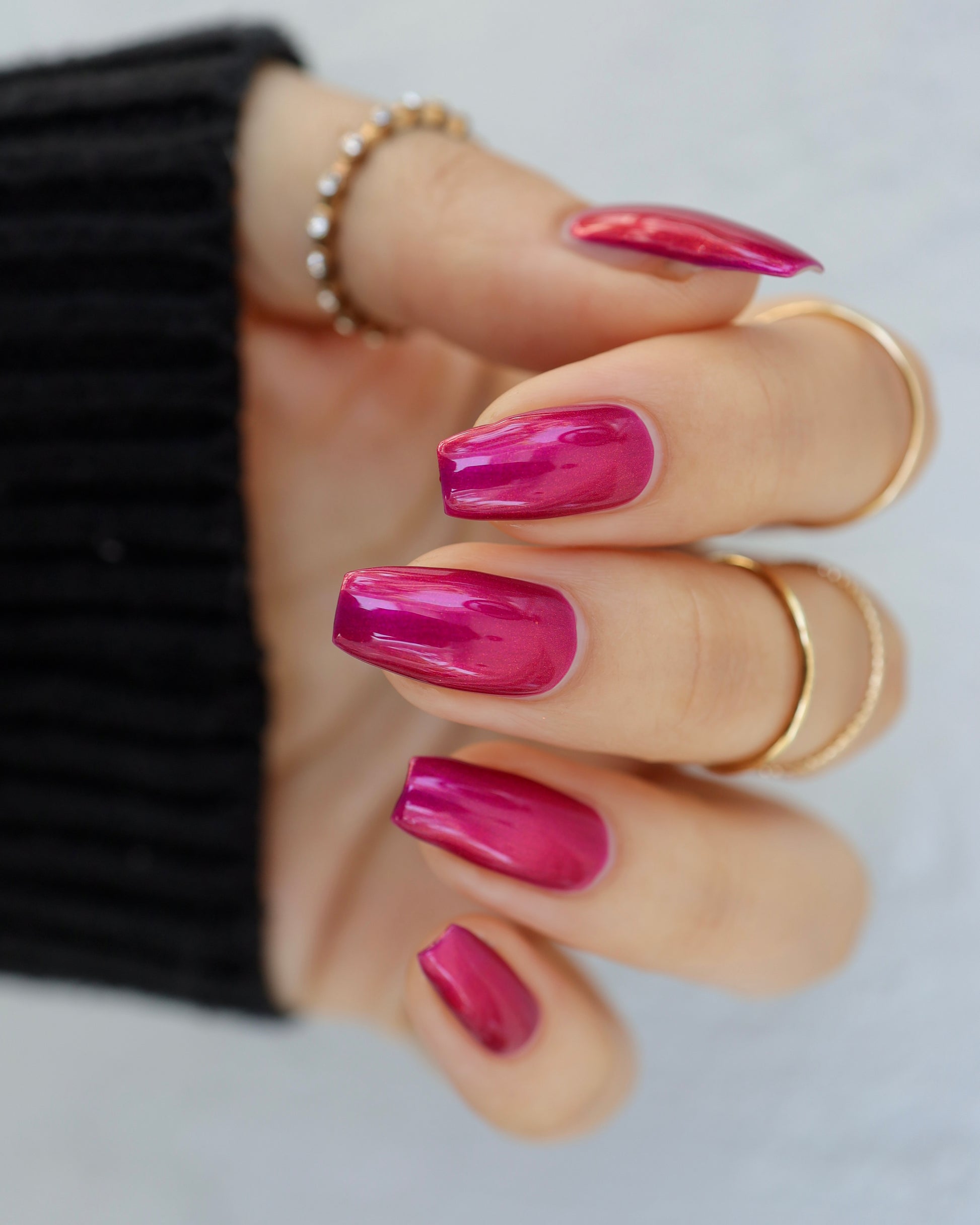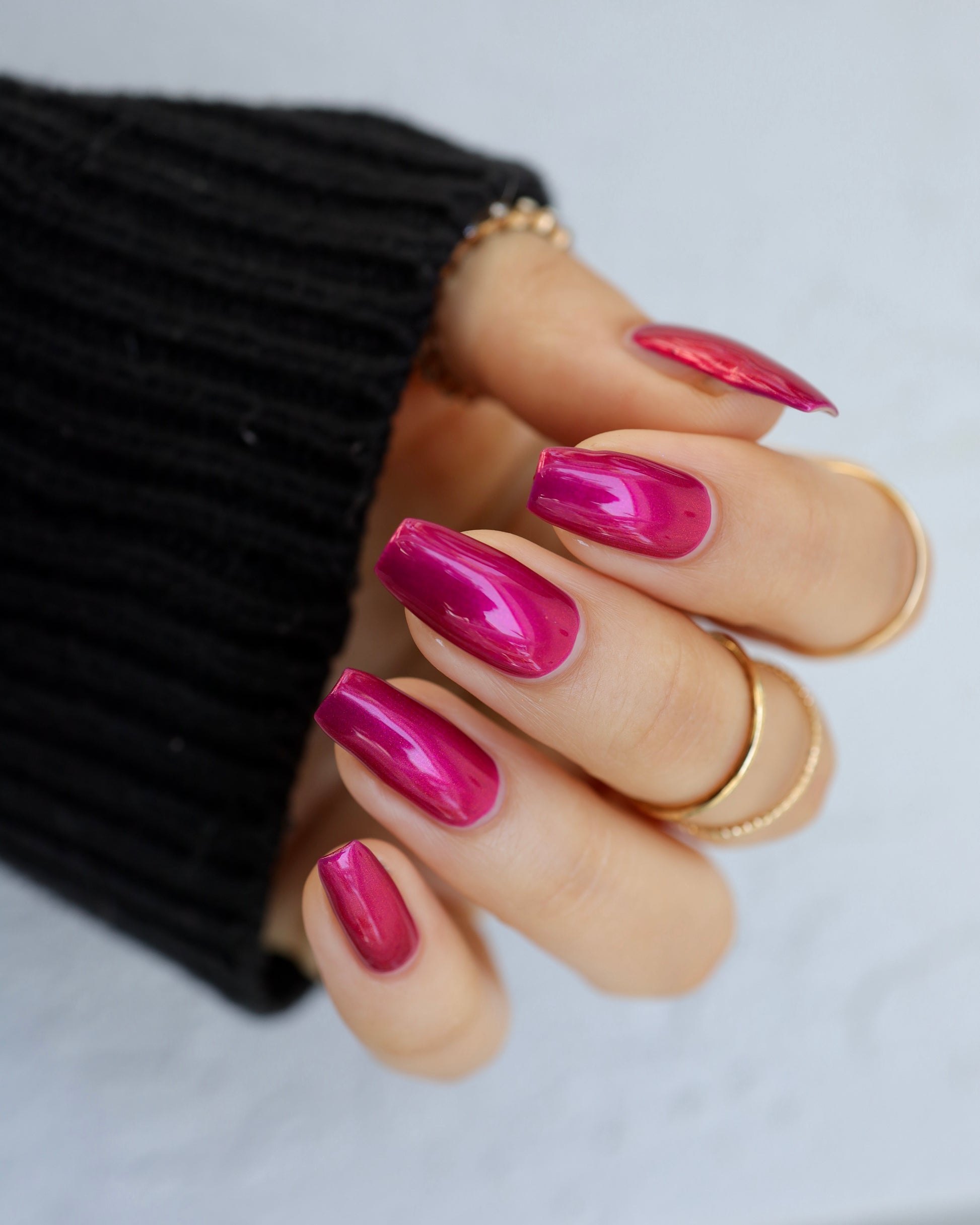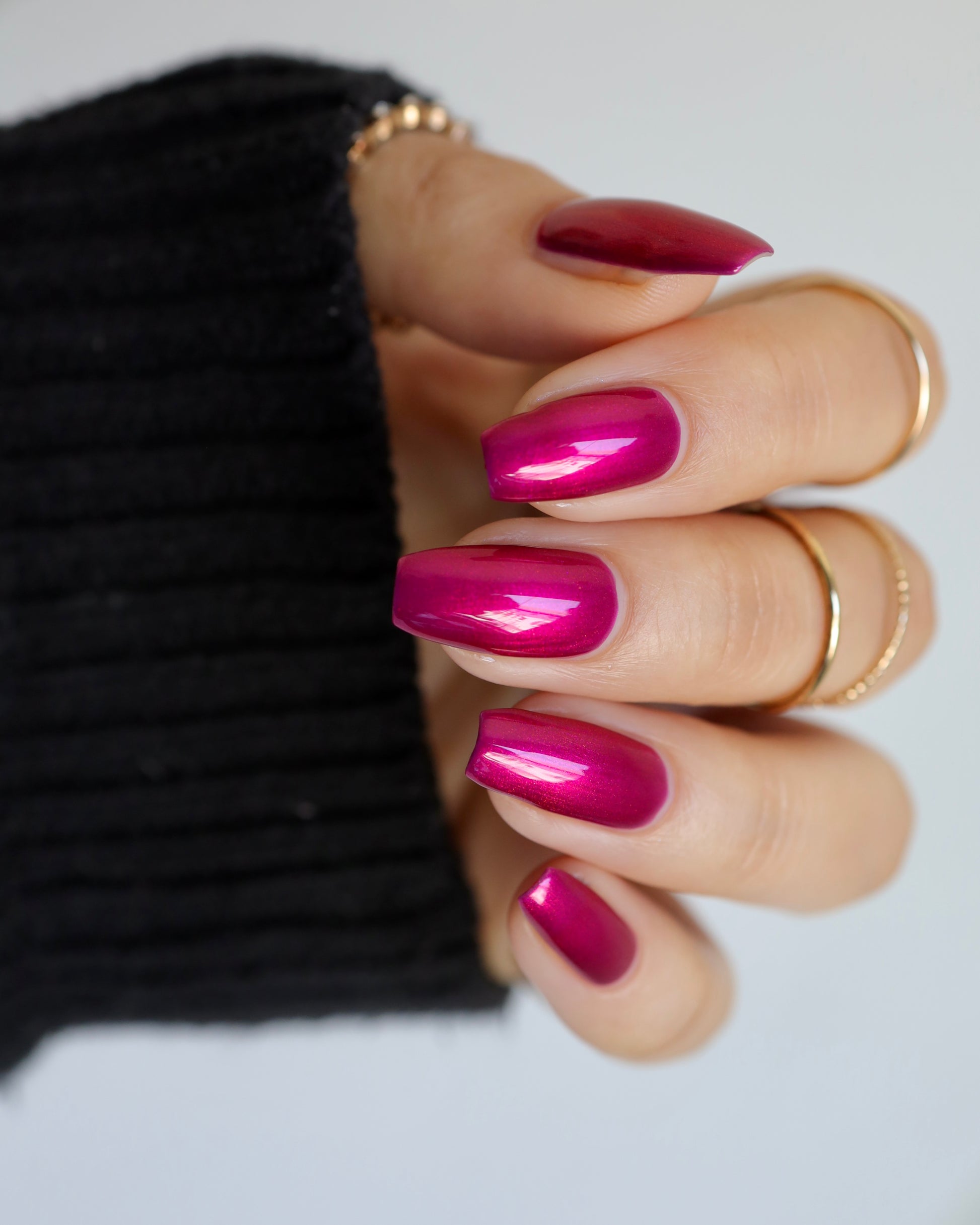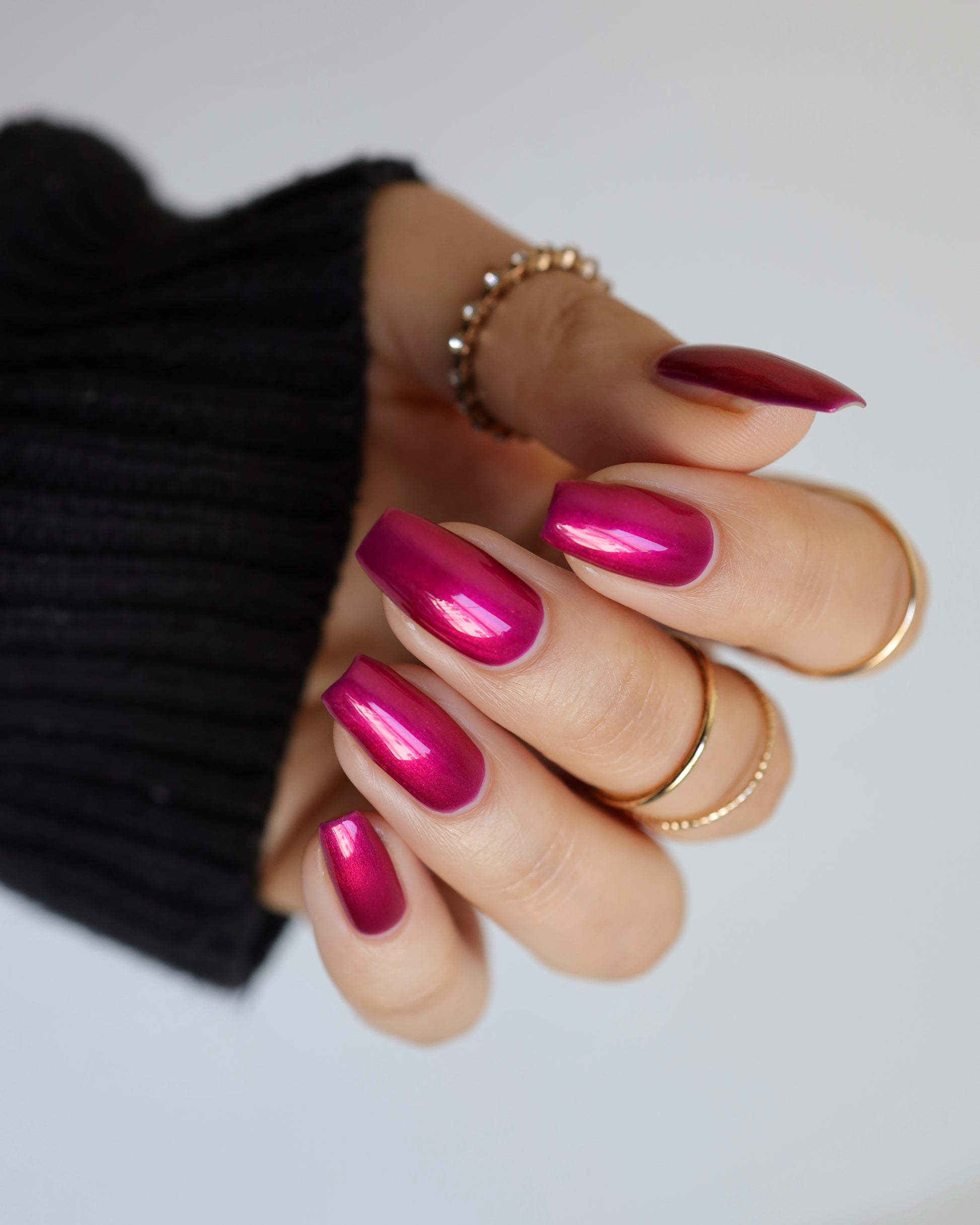 A reddish purple jelly base with glowy fine particle red to orange shimmer