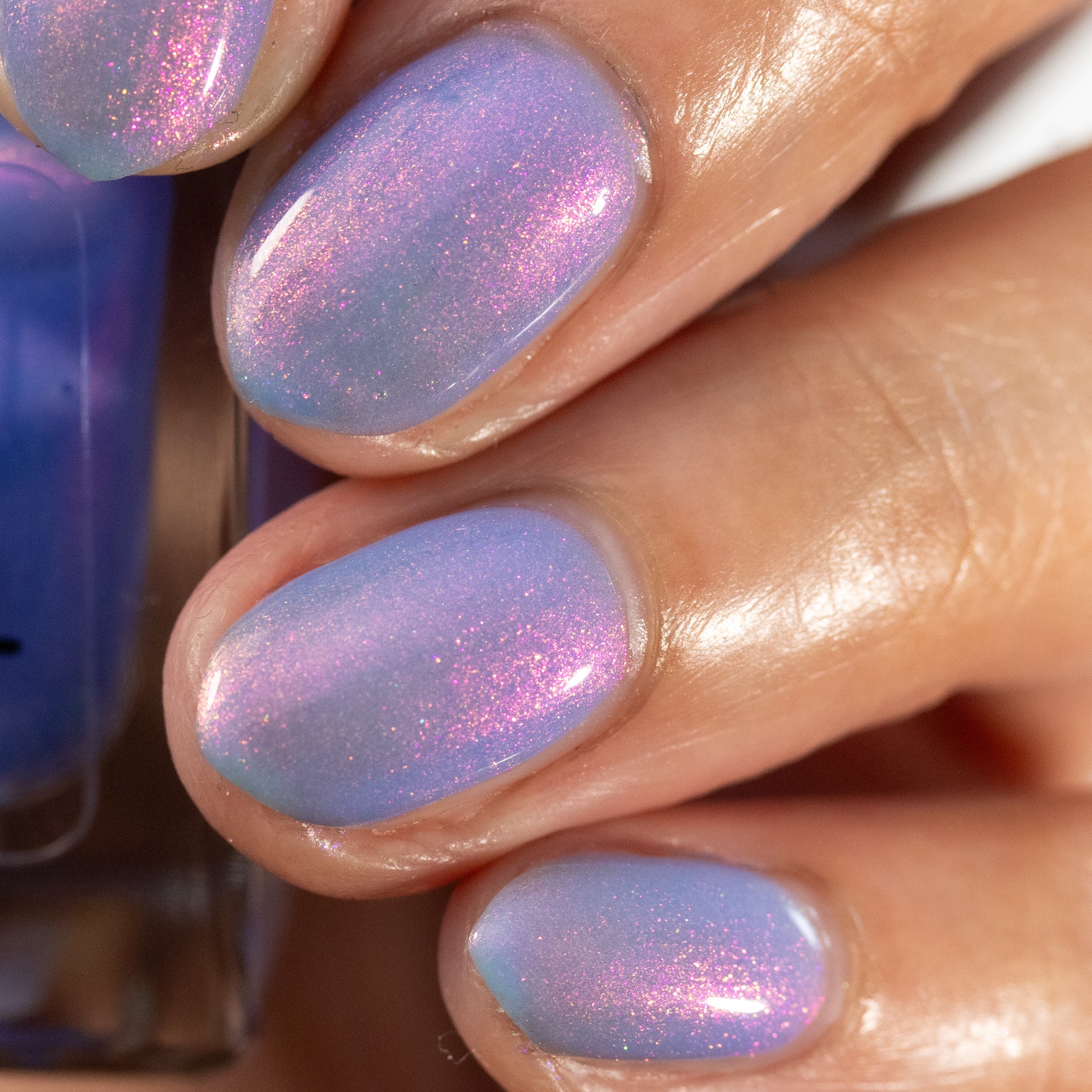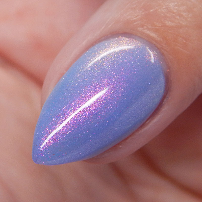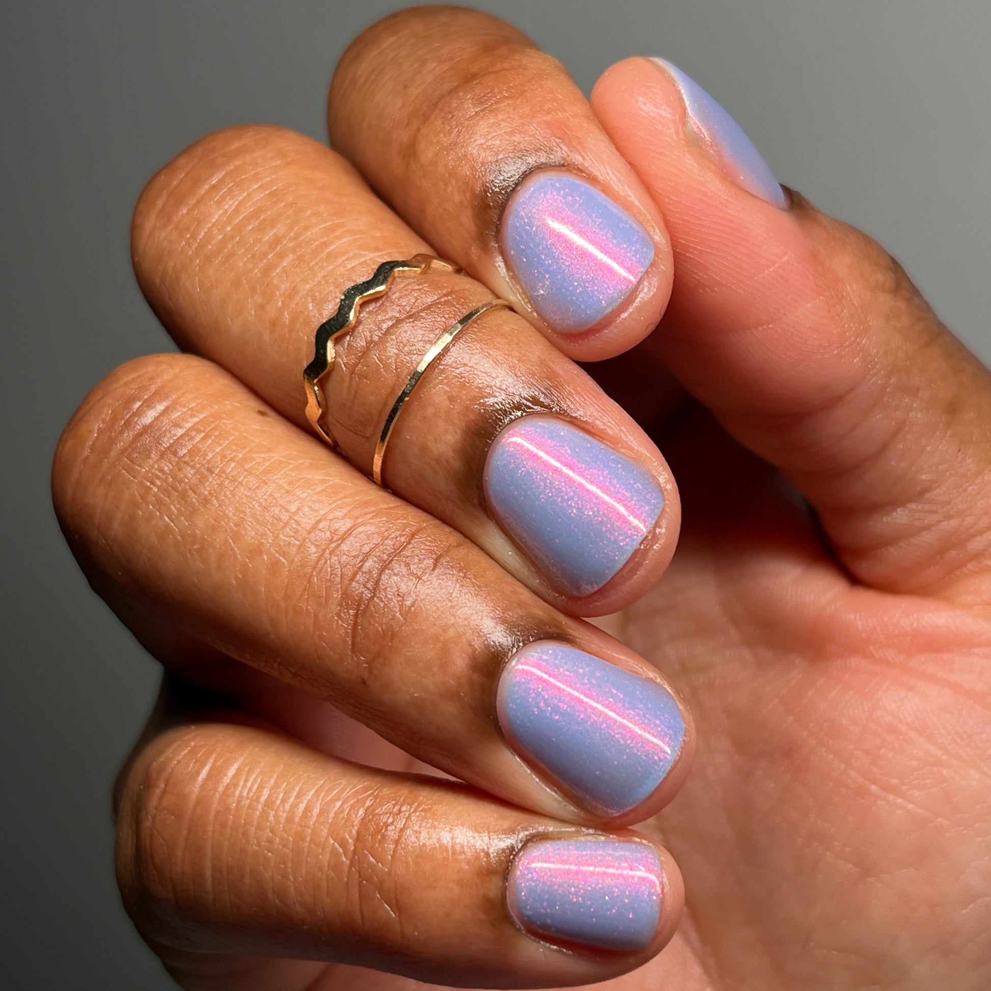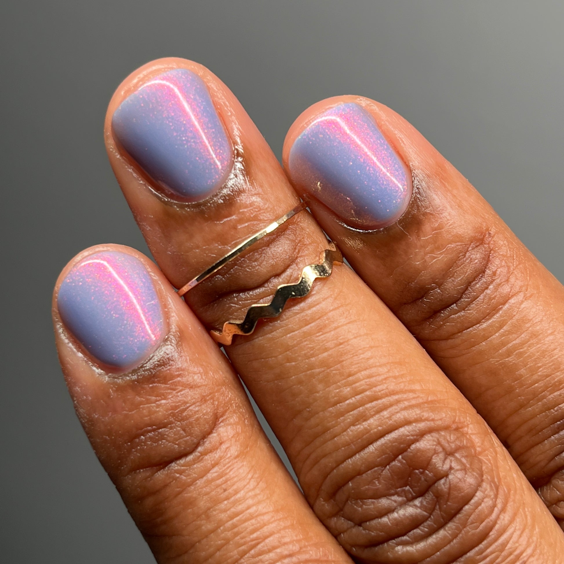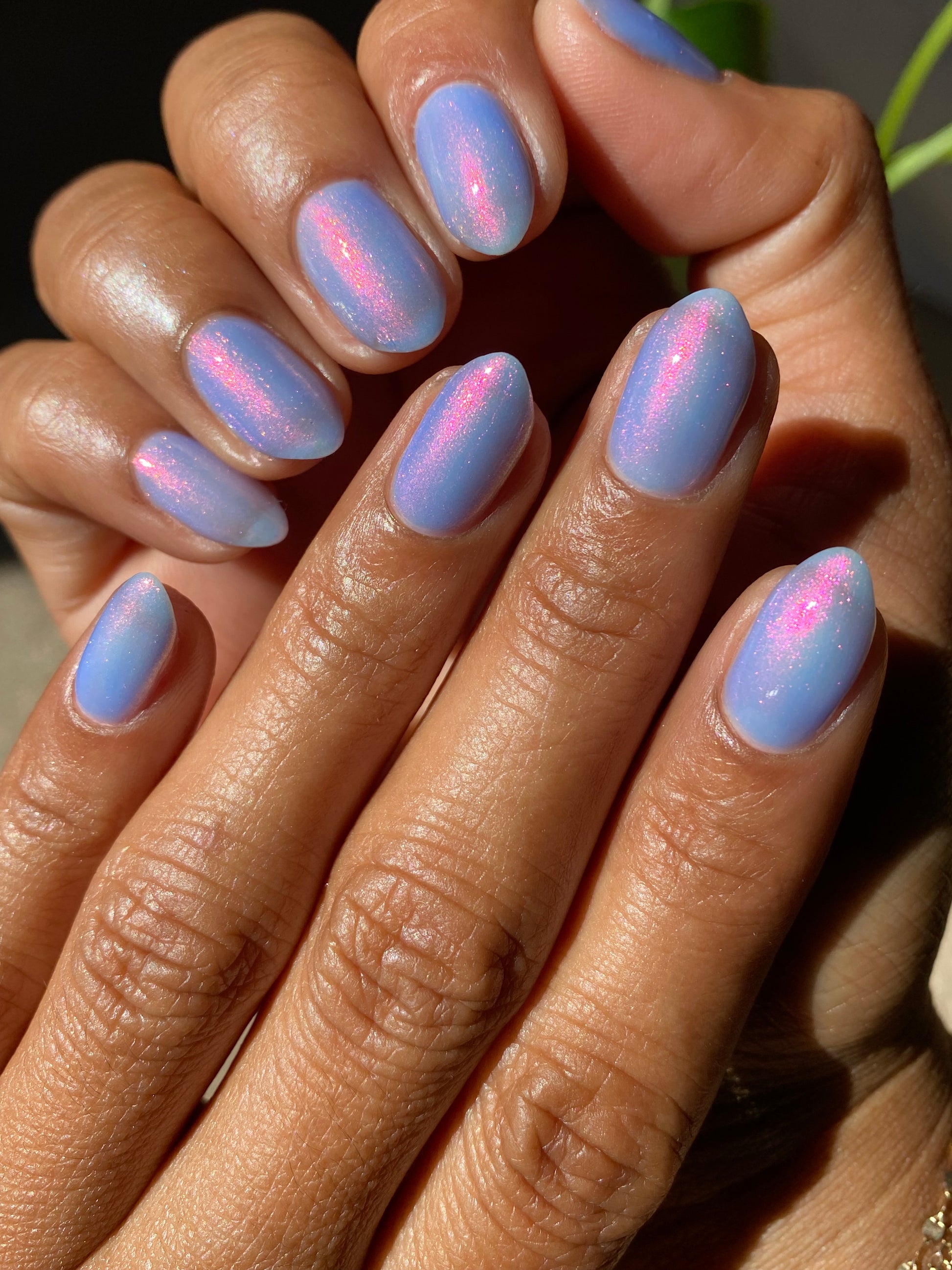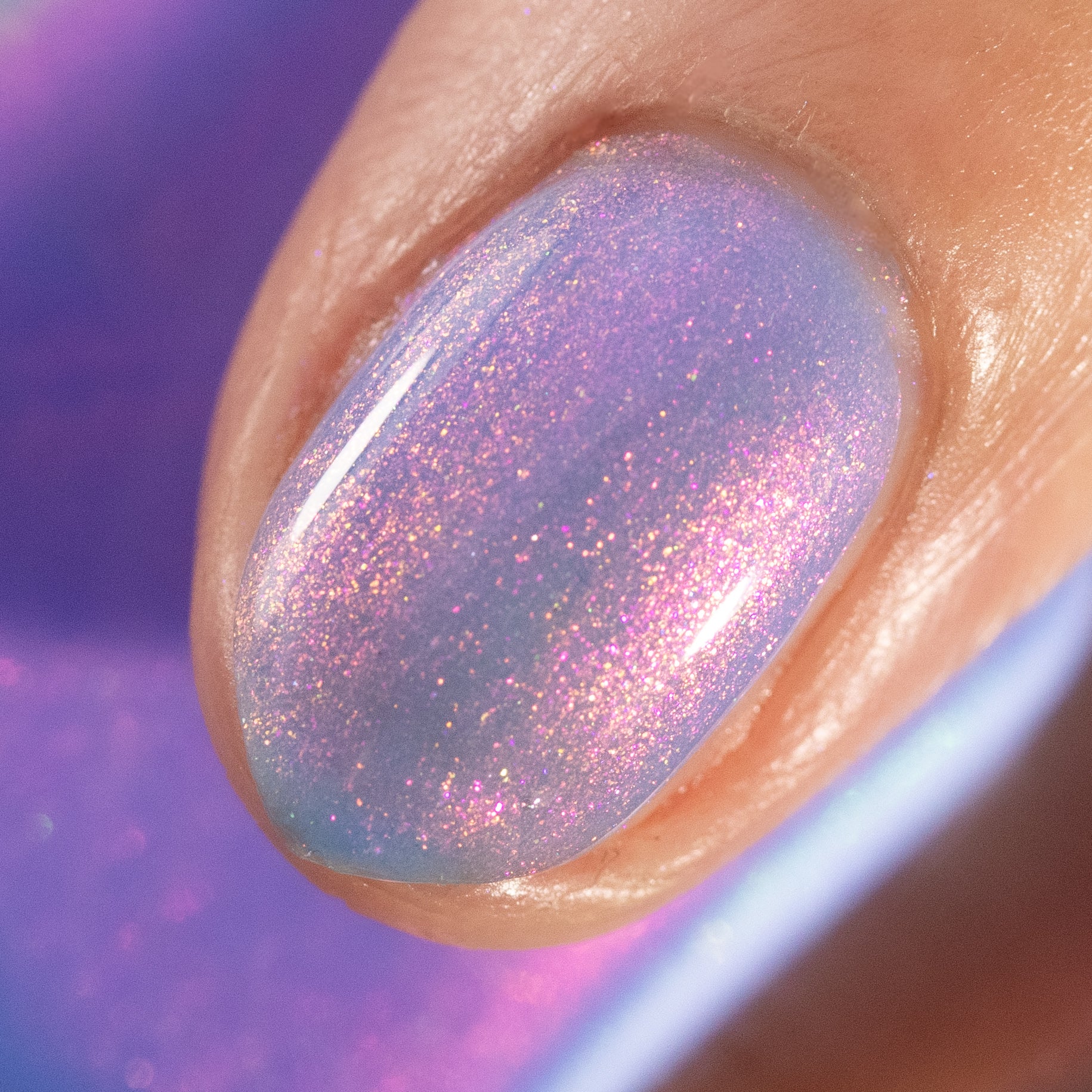 A periwinkle base with pink to orange to gold aurora shimmer that shifts to green at extremes