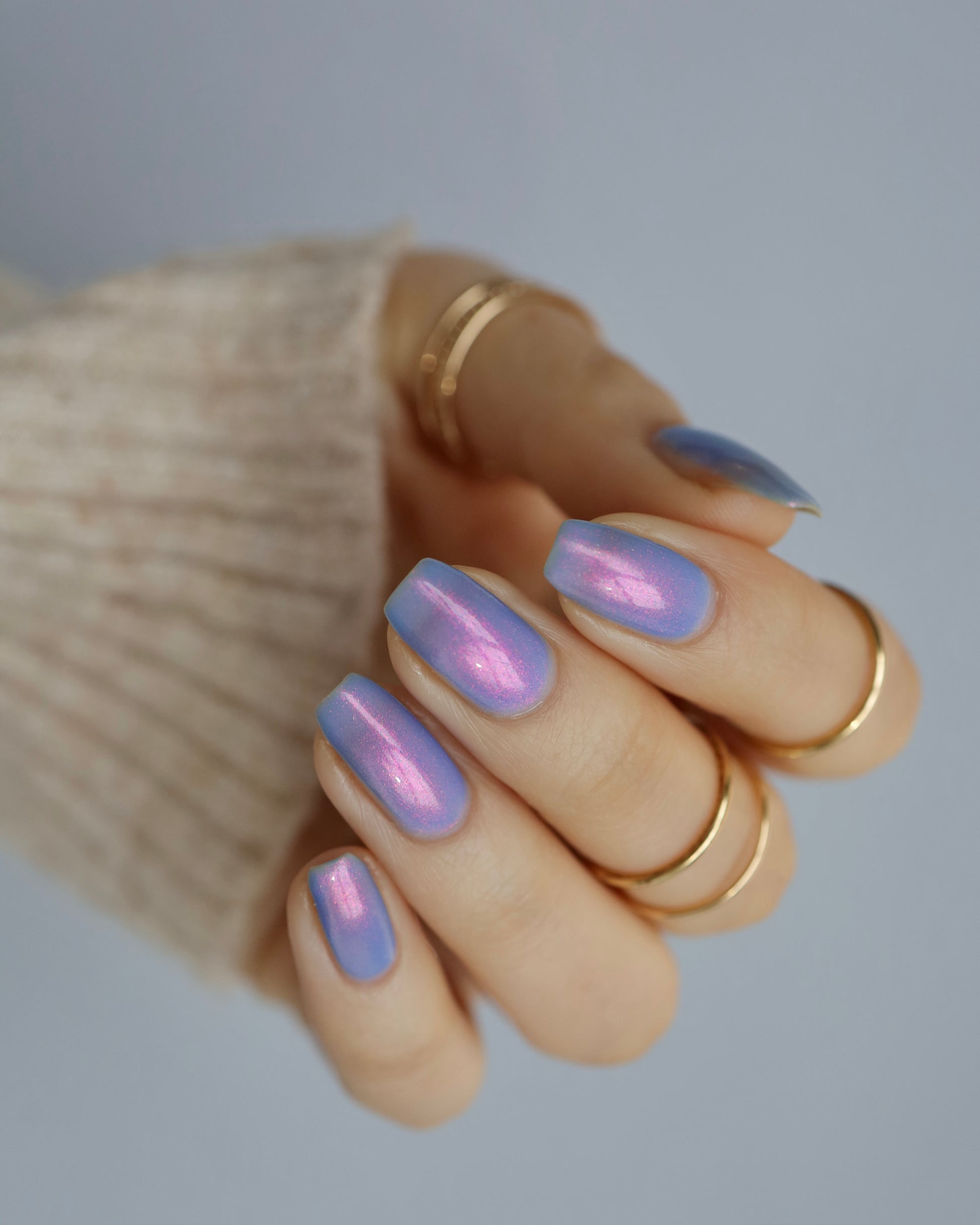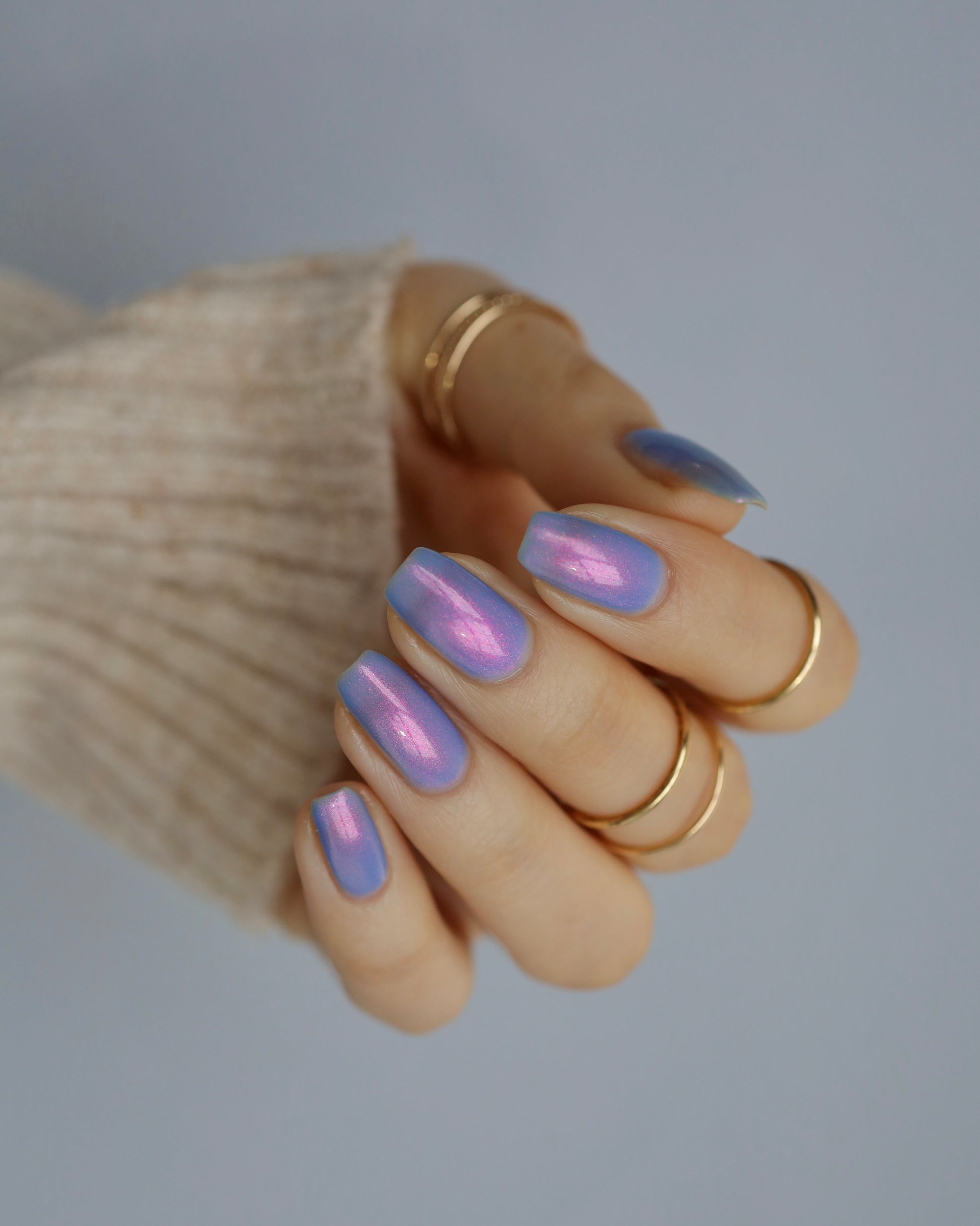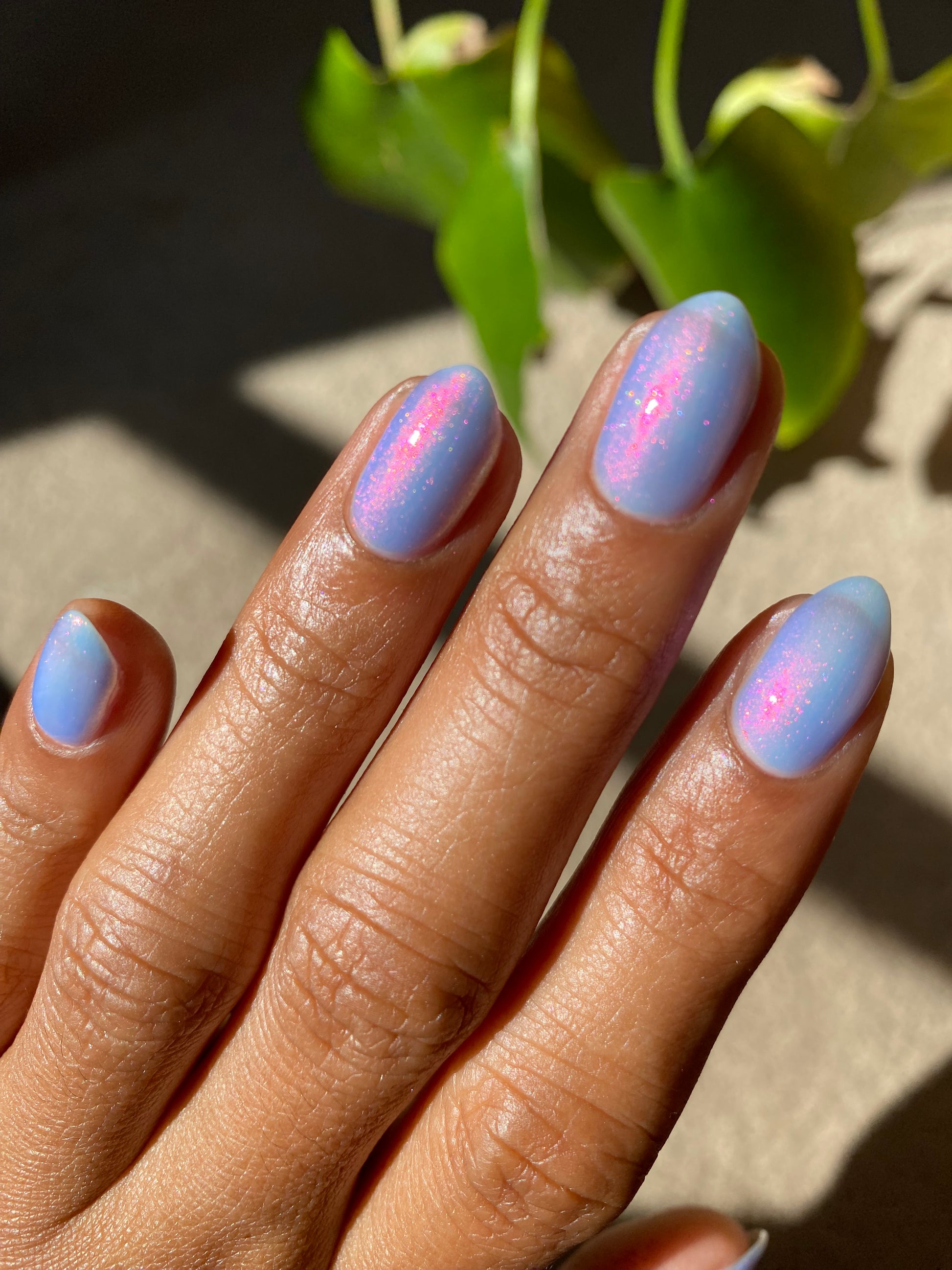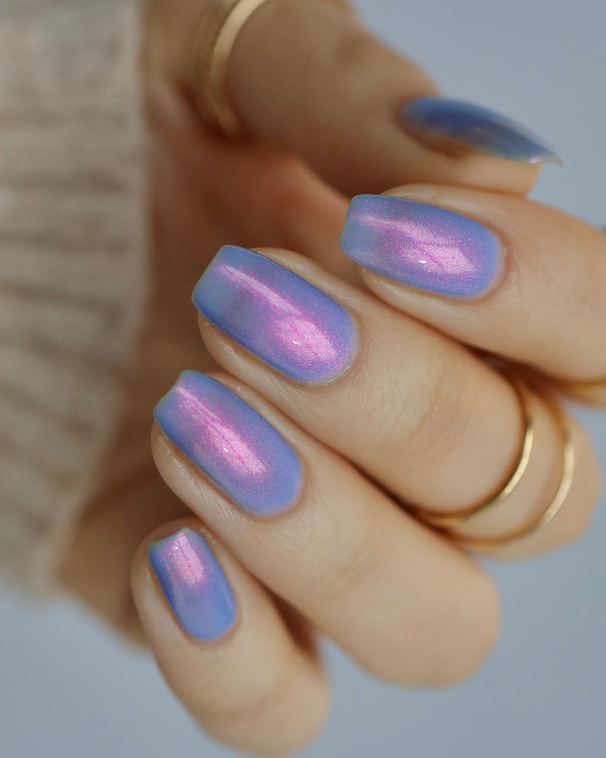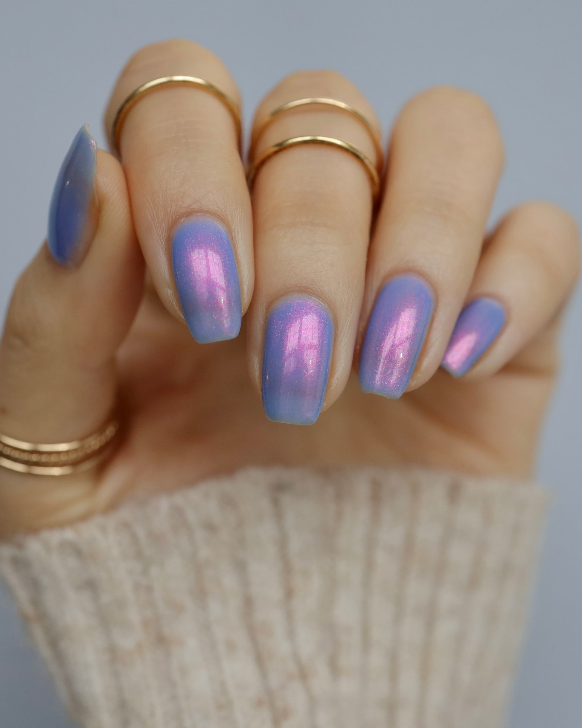A periwinkle base with pink to orange to gold aurora shimmer that shifts to green at extremes