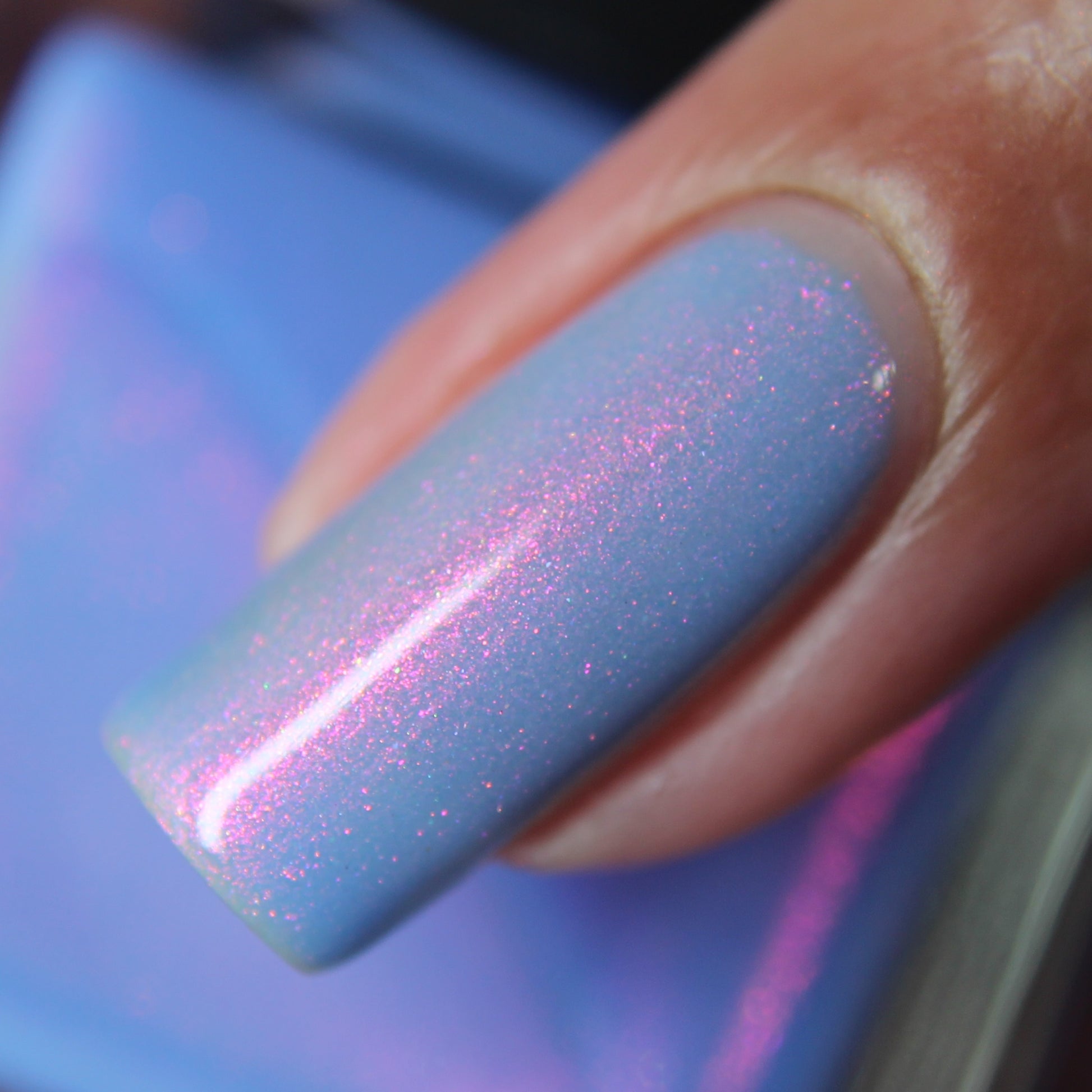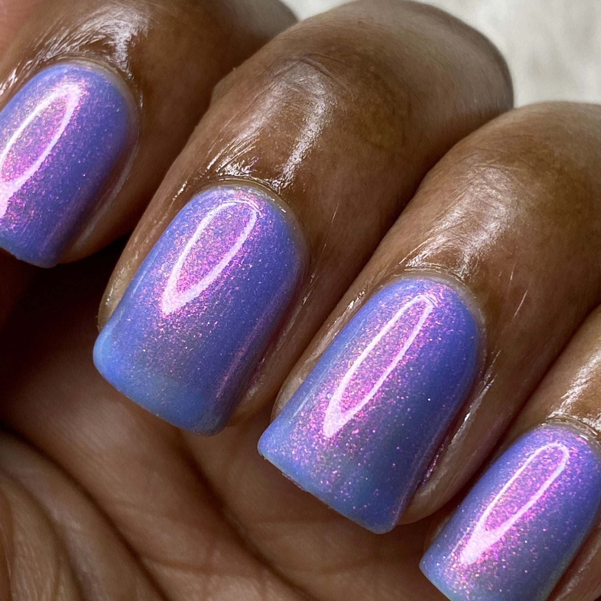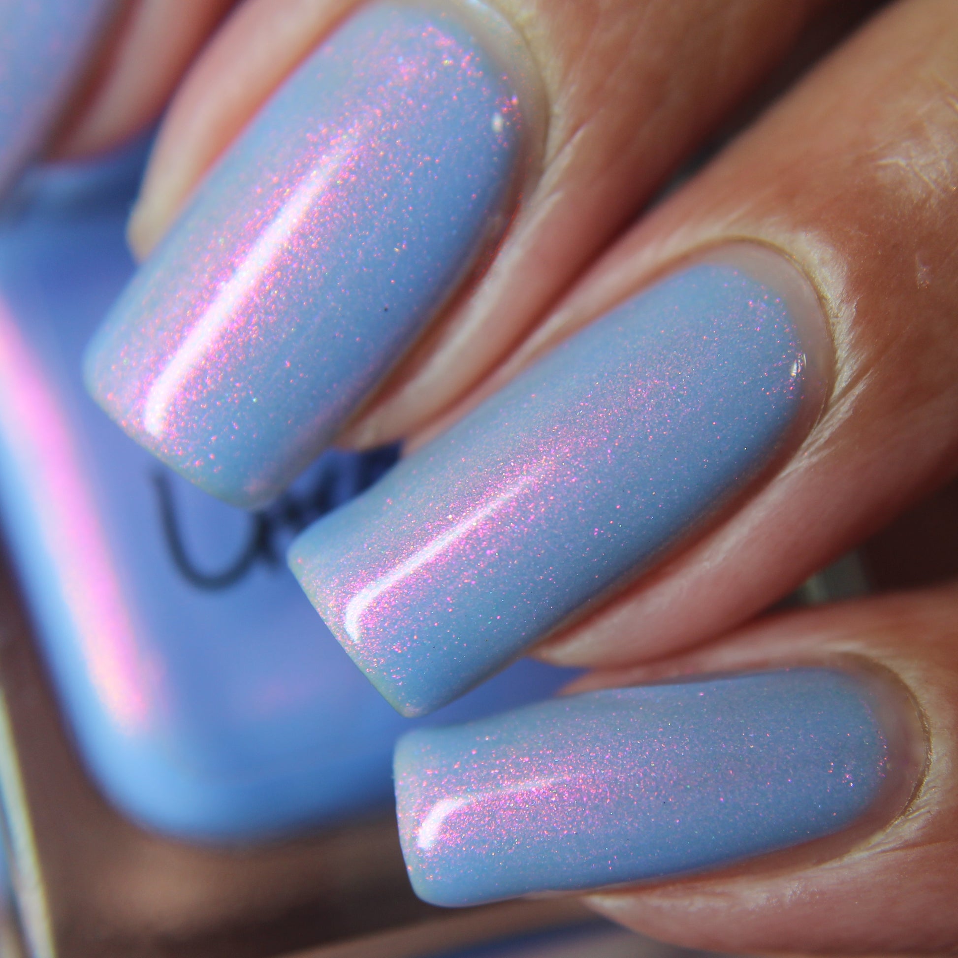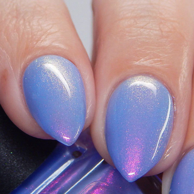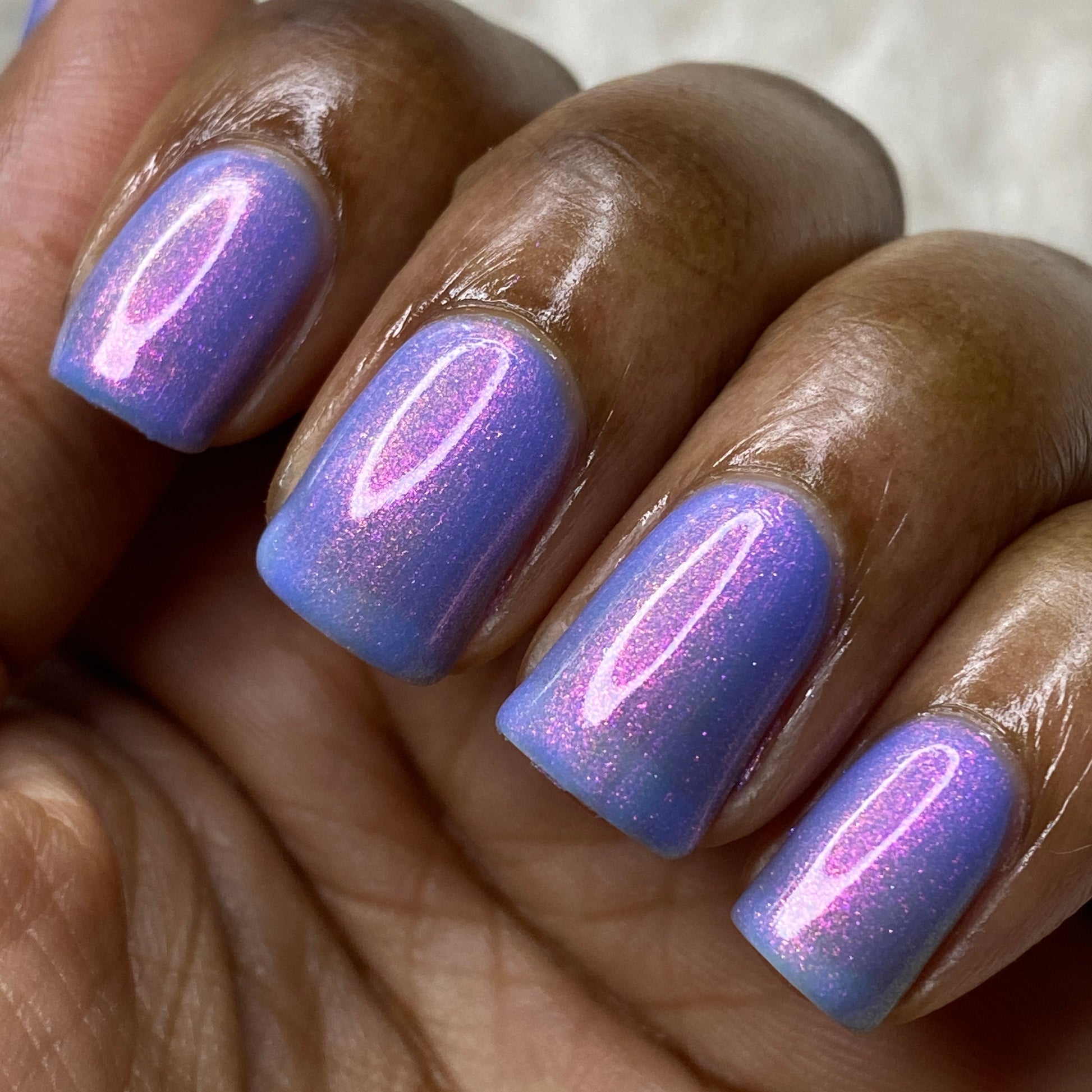 A periwinkle base with pink to orange to gold aurora shimmer that shifts to green at extremes