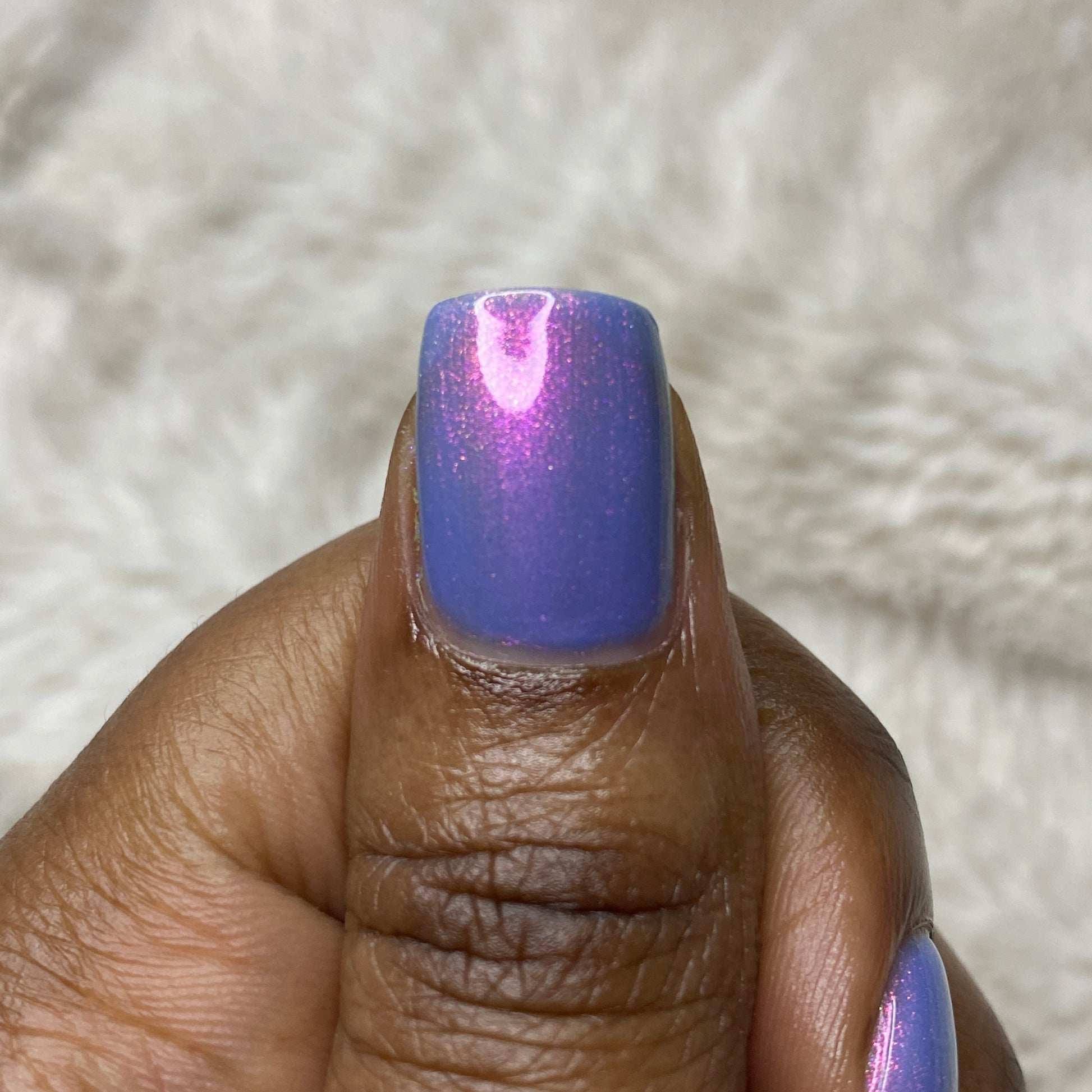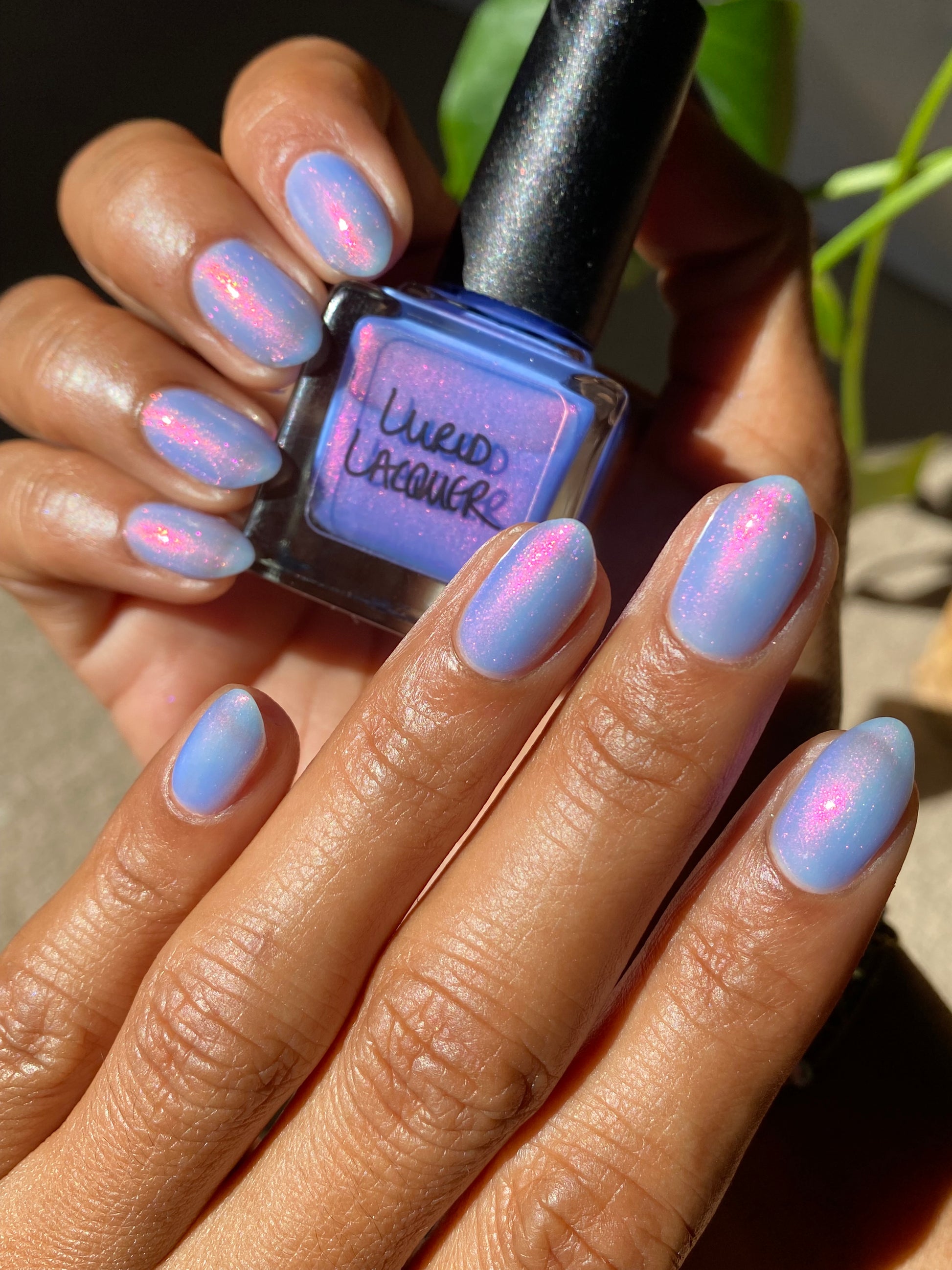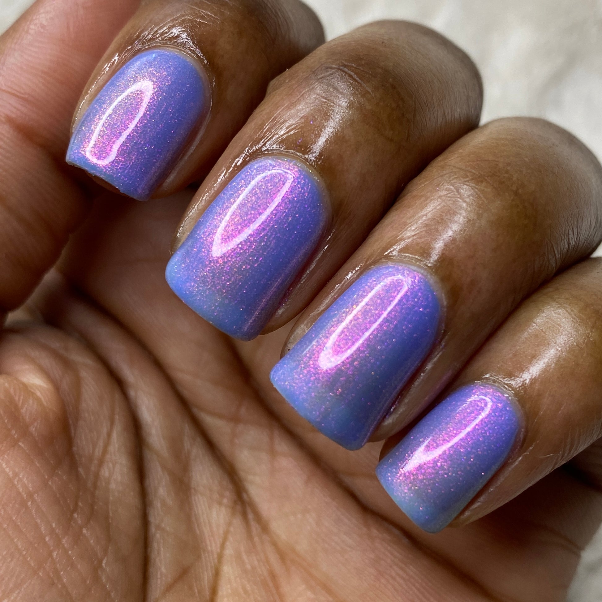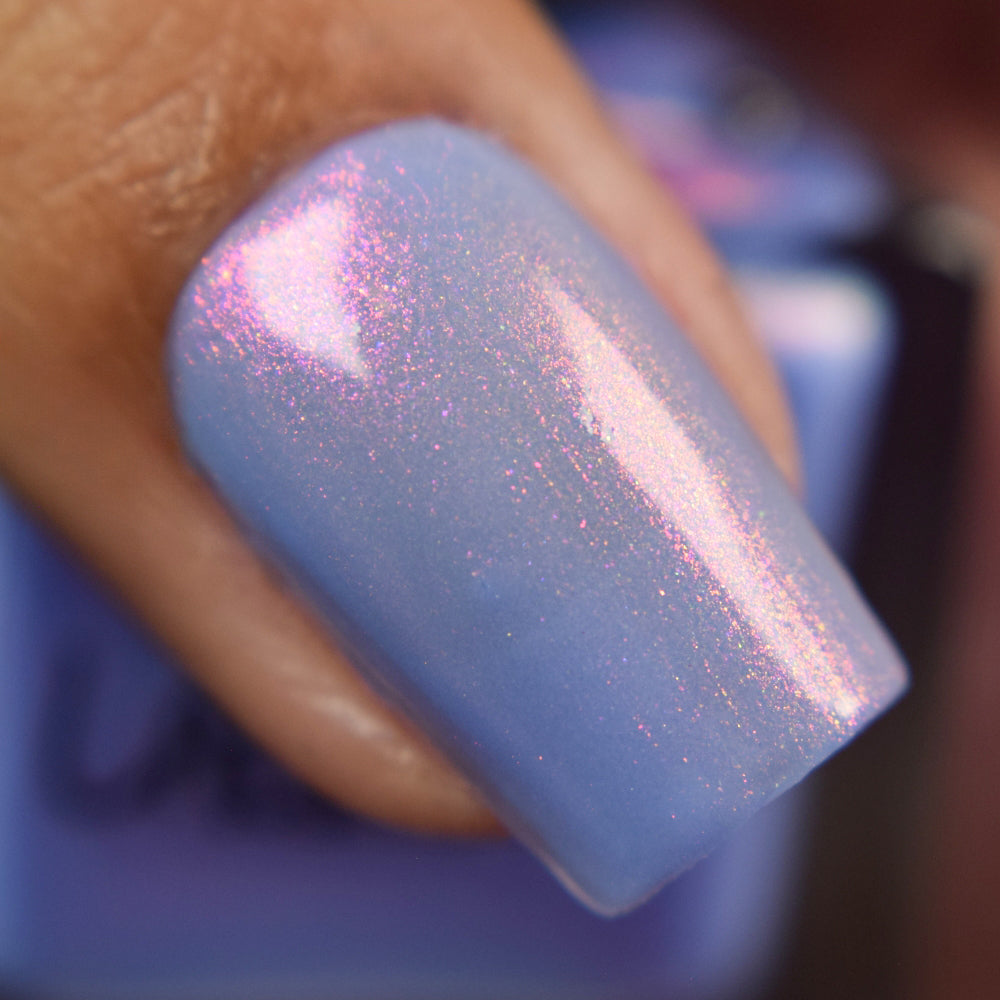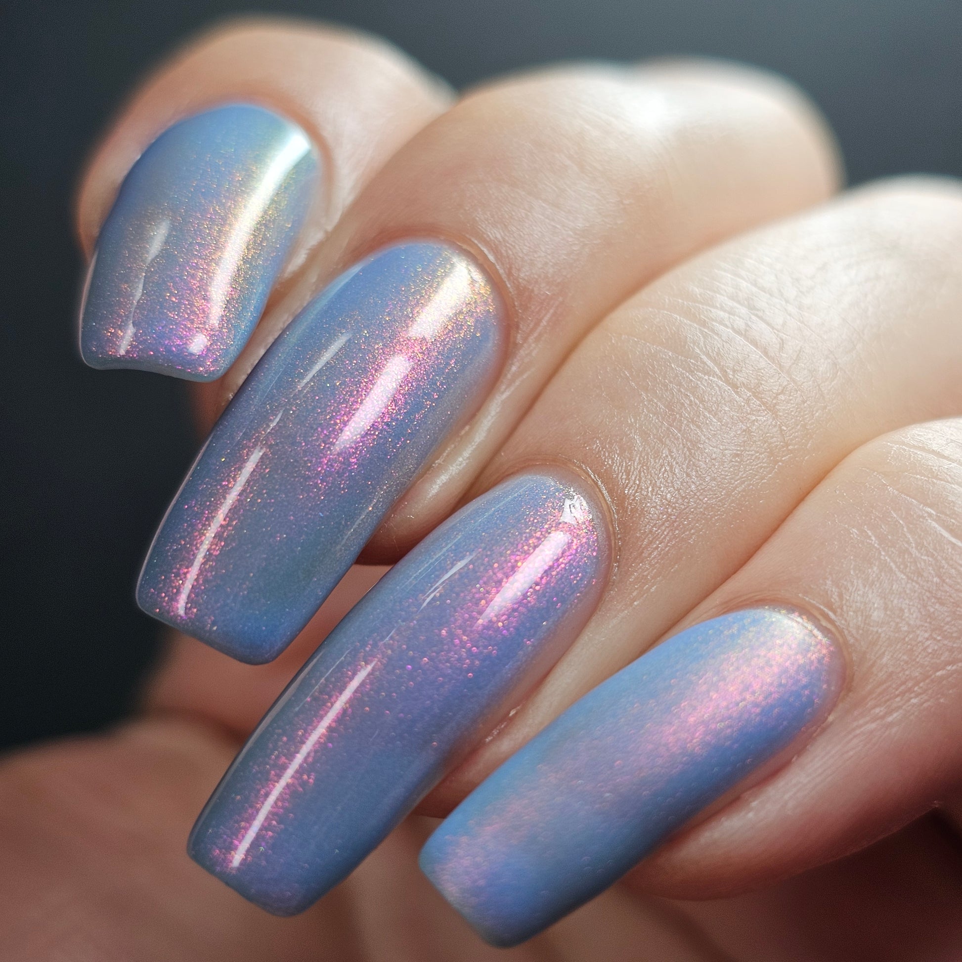 A periwinkle base with pink to orange to gold aurora shimmer that shifts to green at extremes
