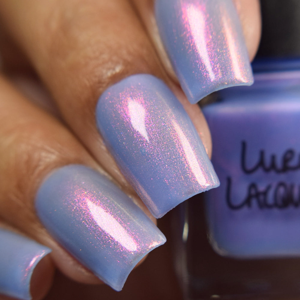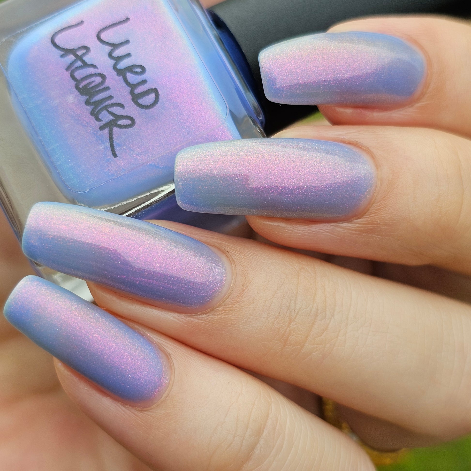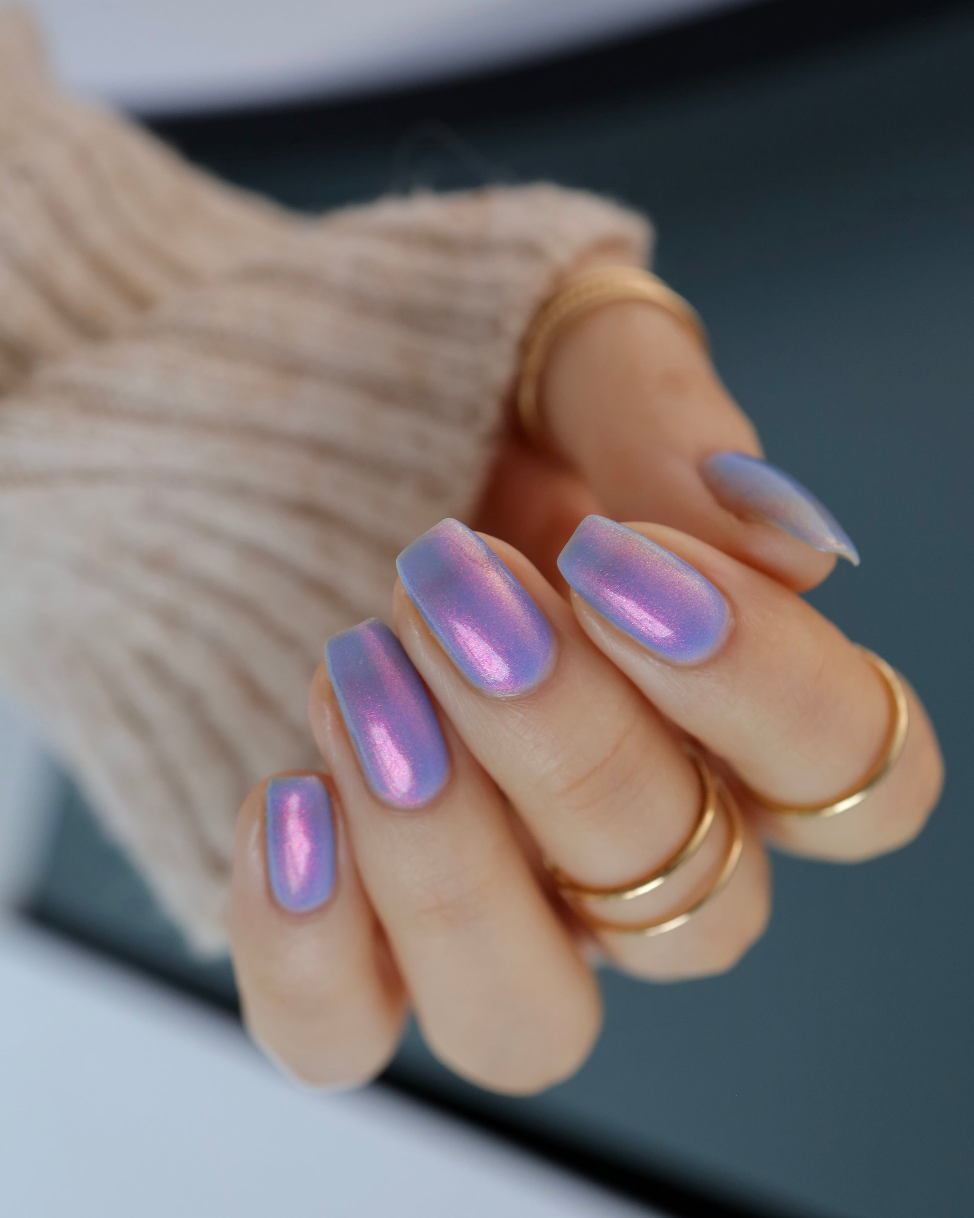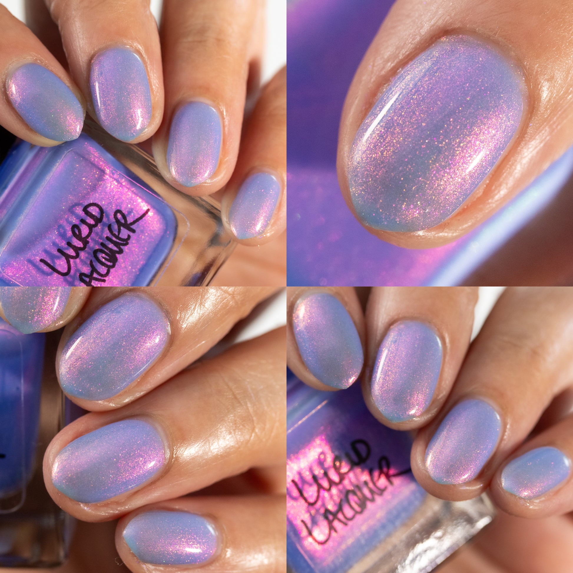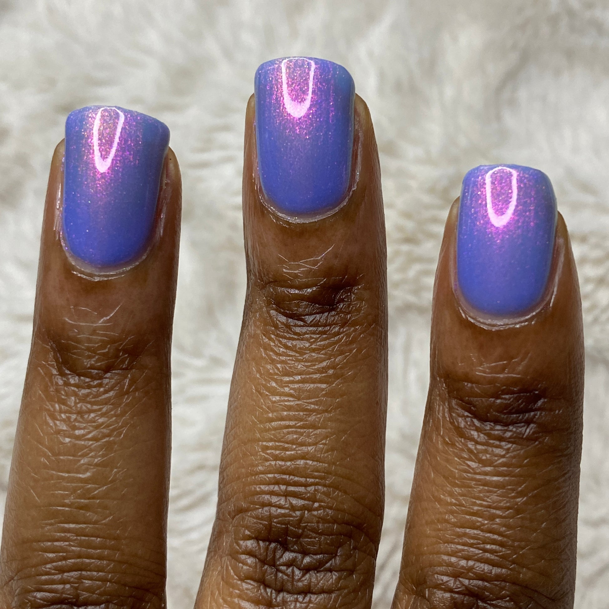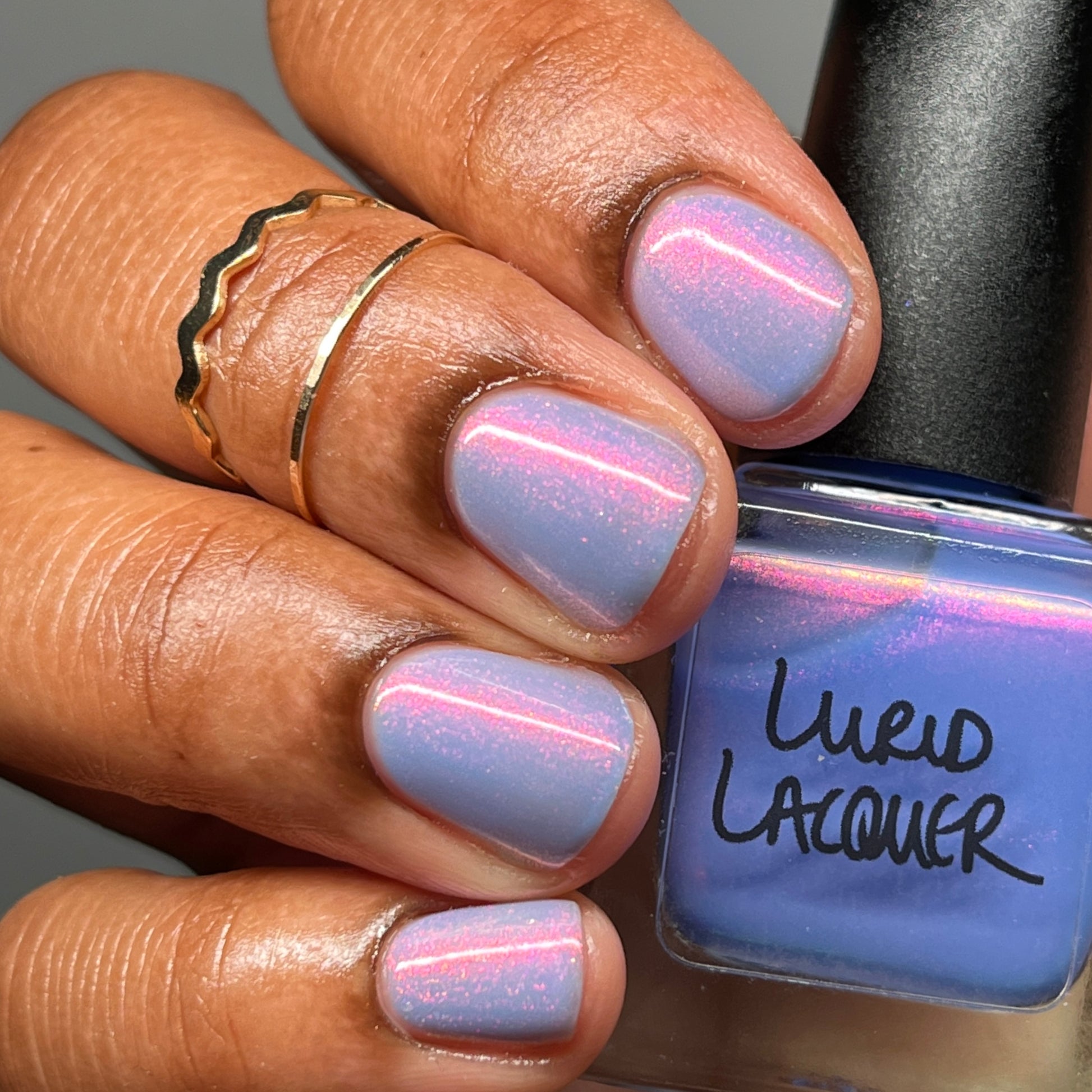 A periwinkle base with pink to orange to gold aurora shimmer that shifts to green at extremes