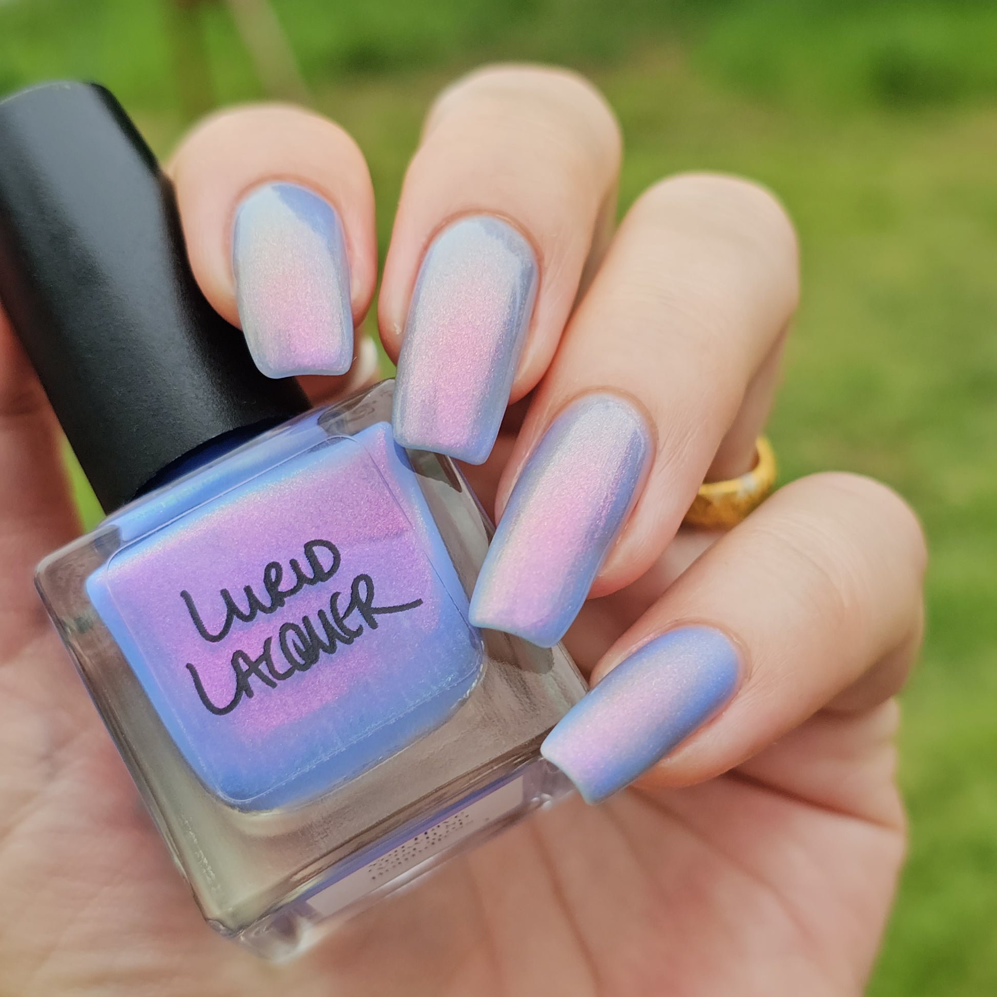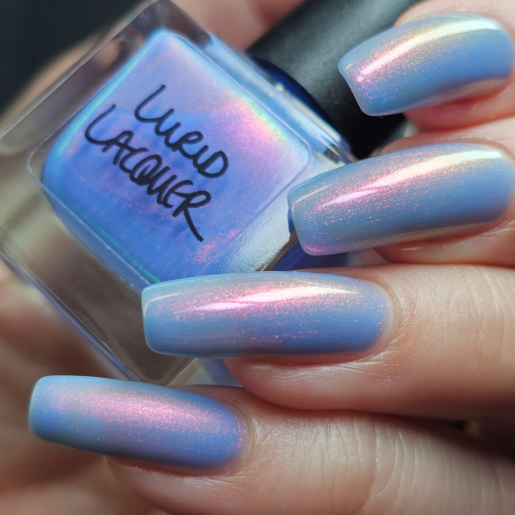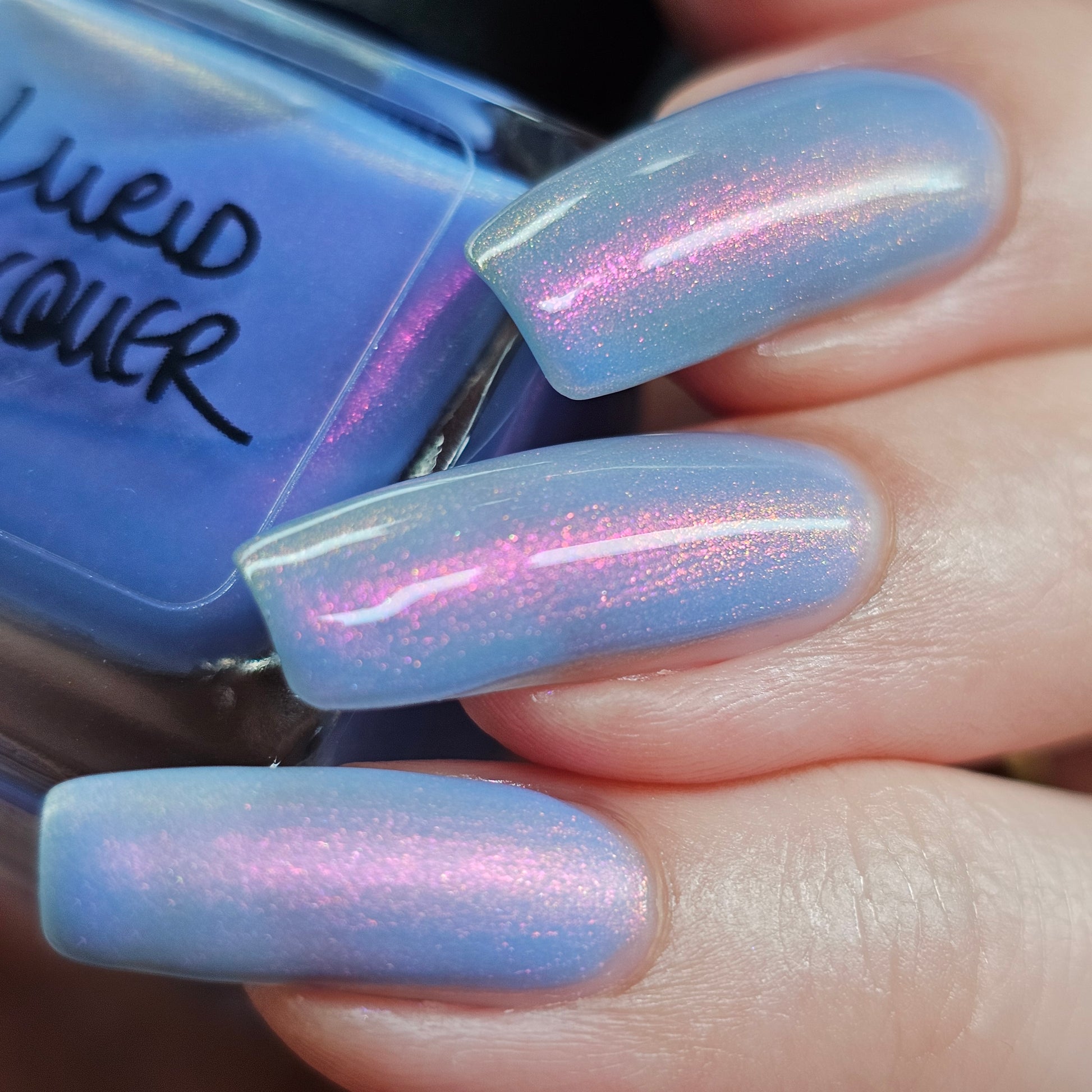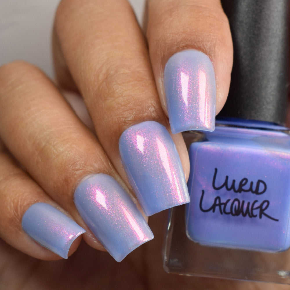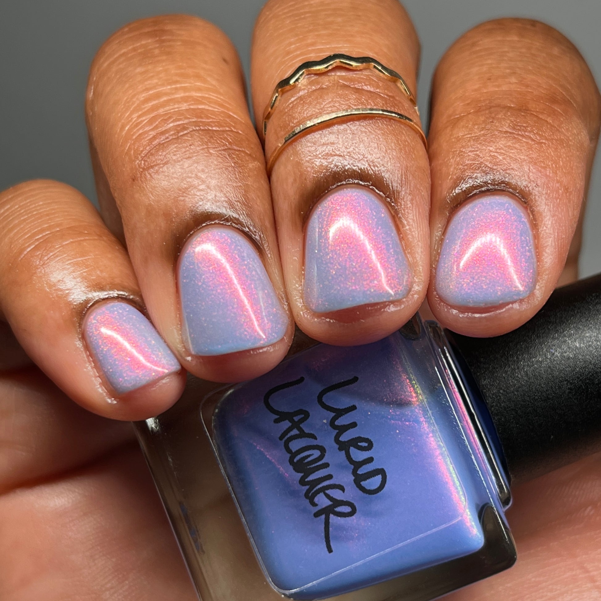 A periwinkle base with pink to orange to gold aurora shimmer that shifts to green at extremes