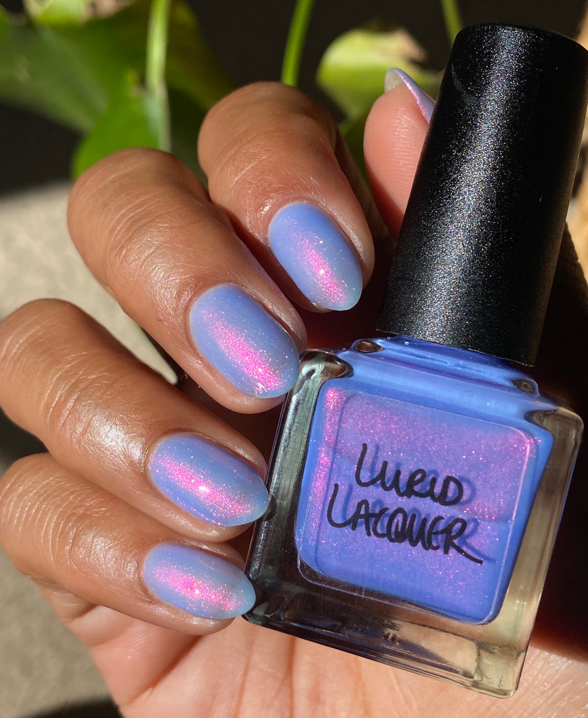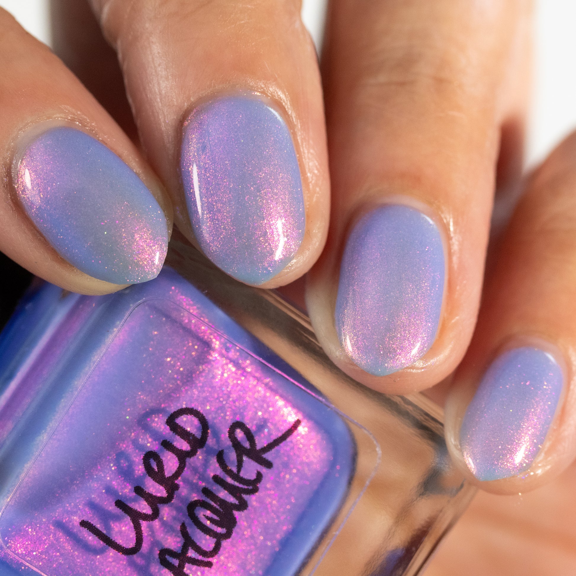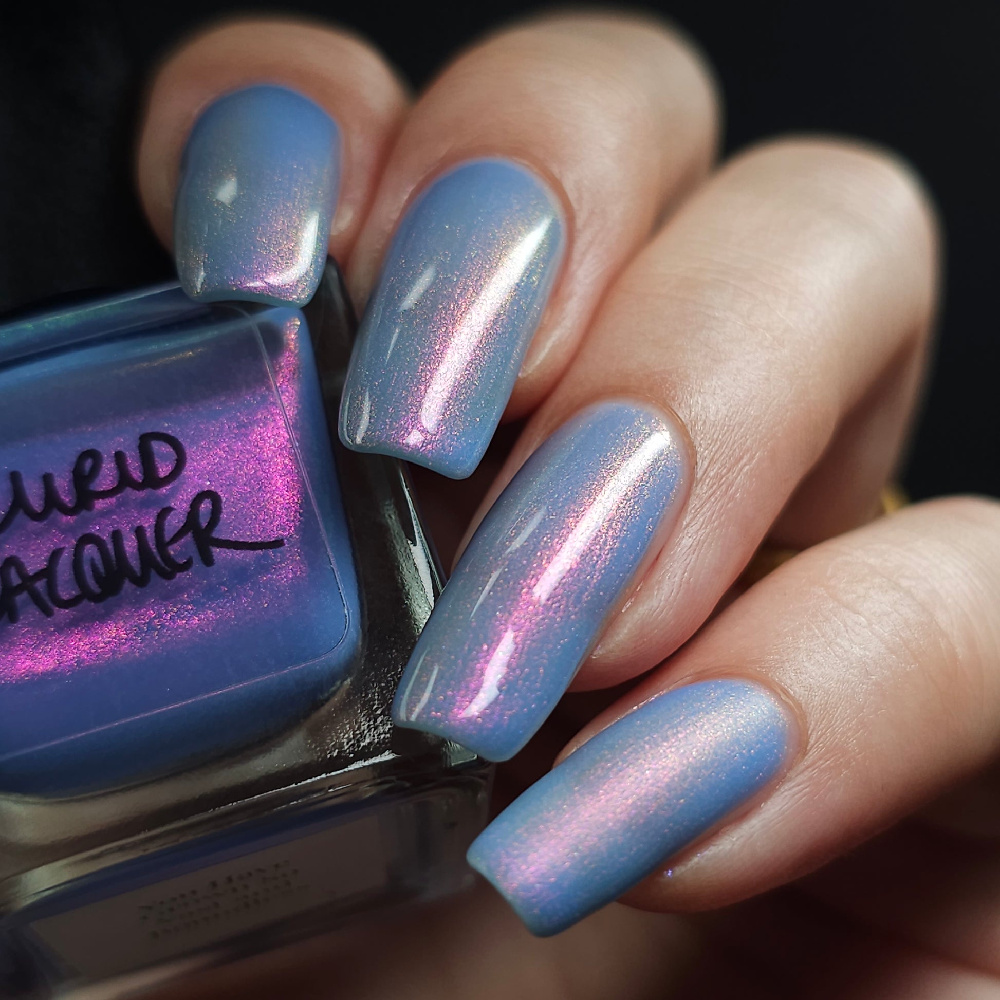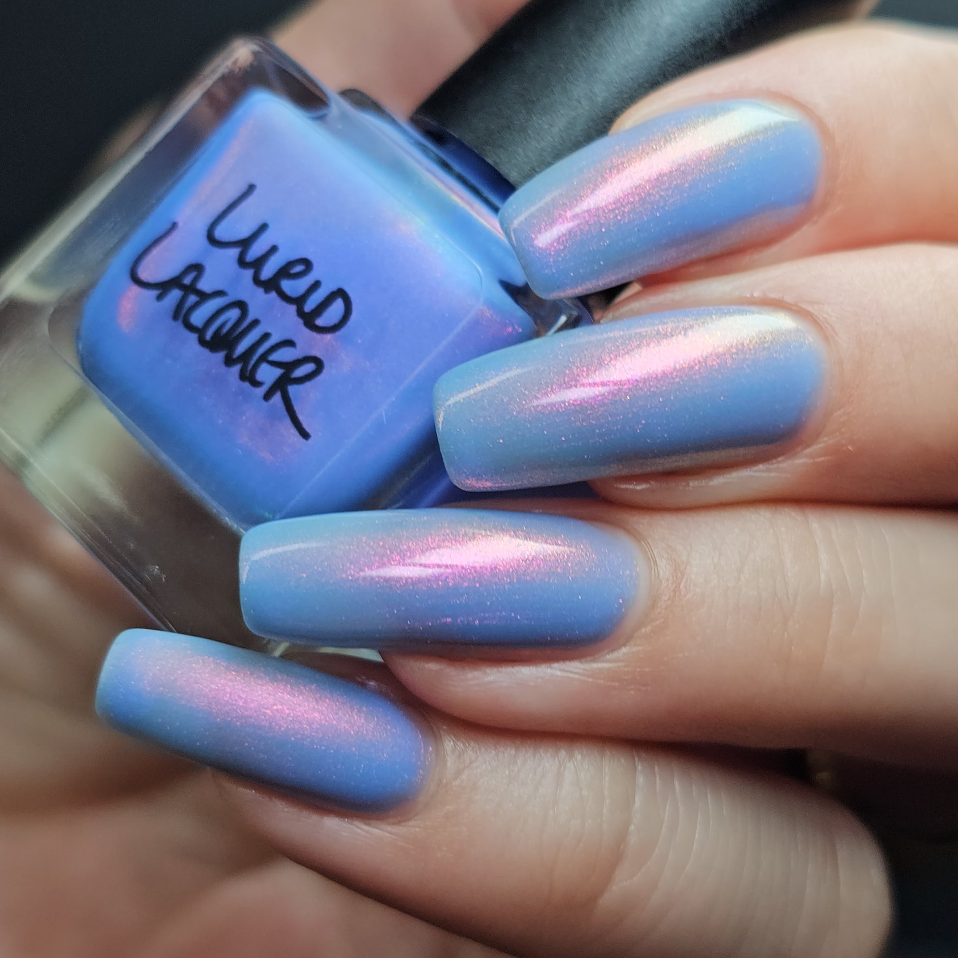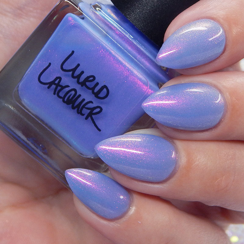 A periwinkle base with pink to orange to gold aurora shimmer that shifts to green at extremes