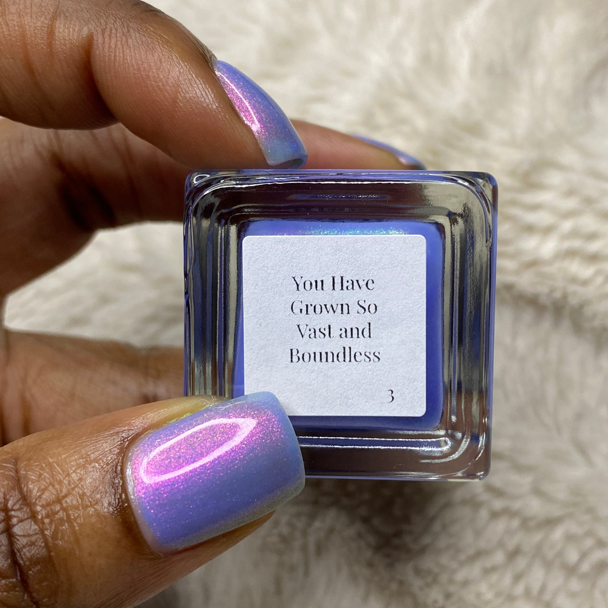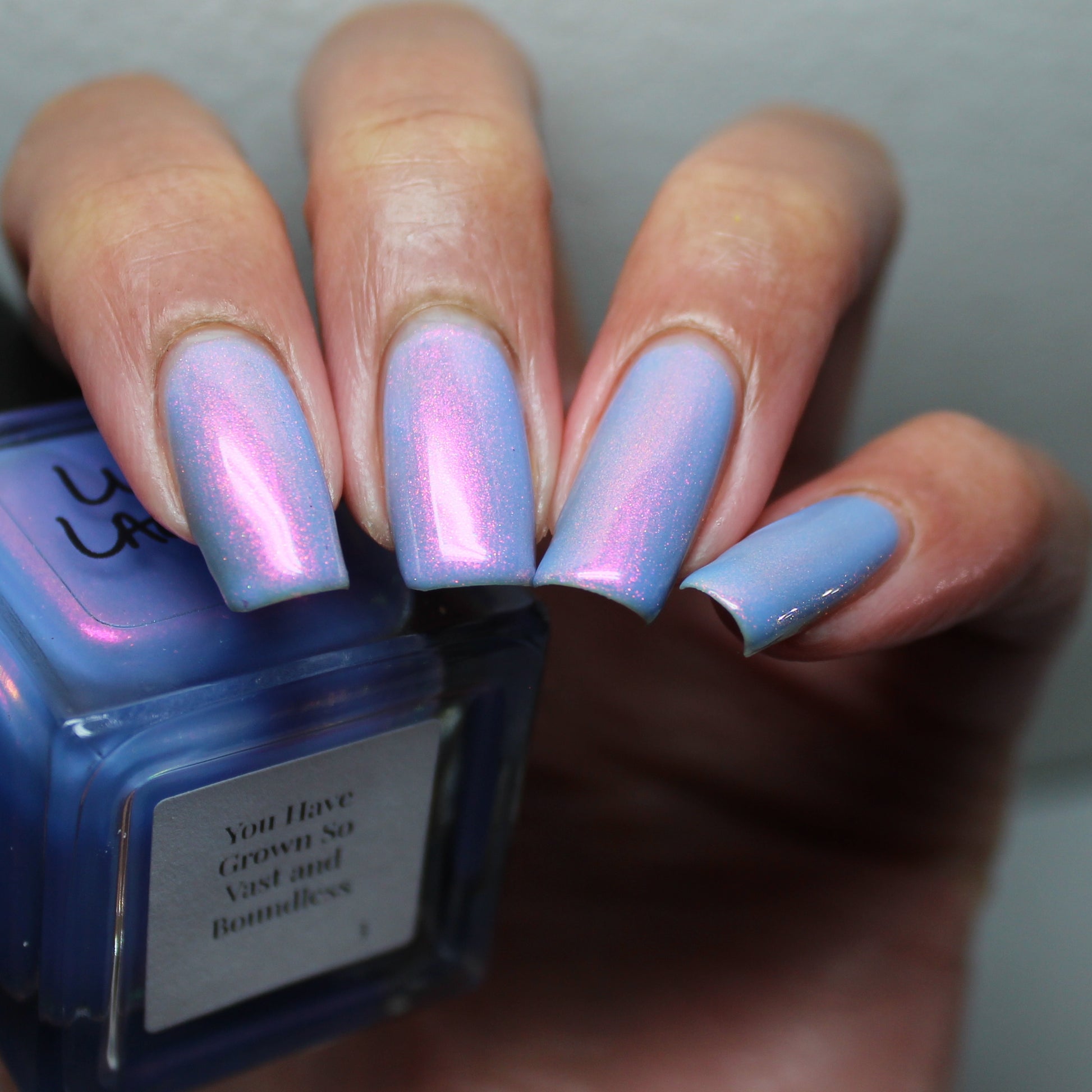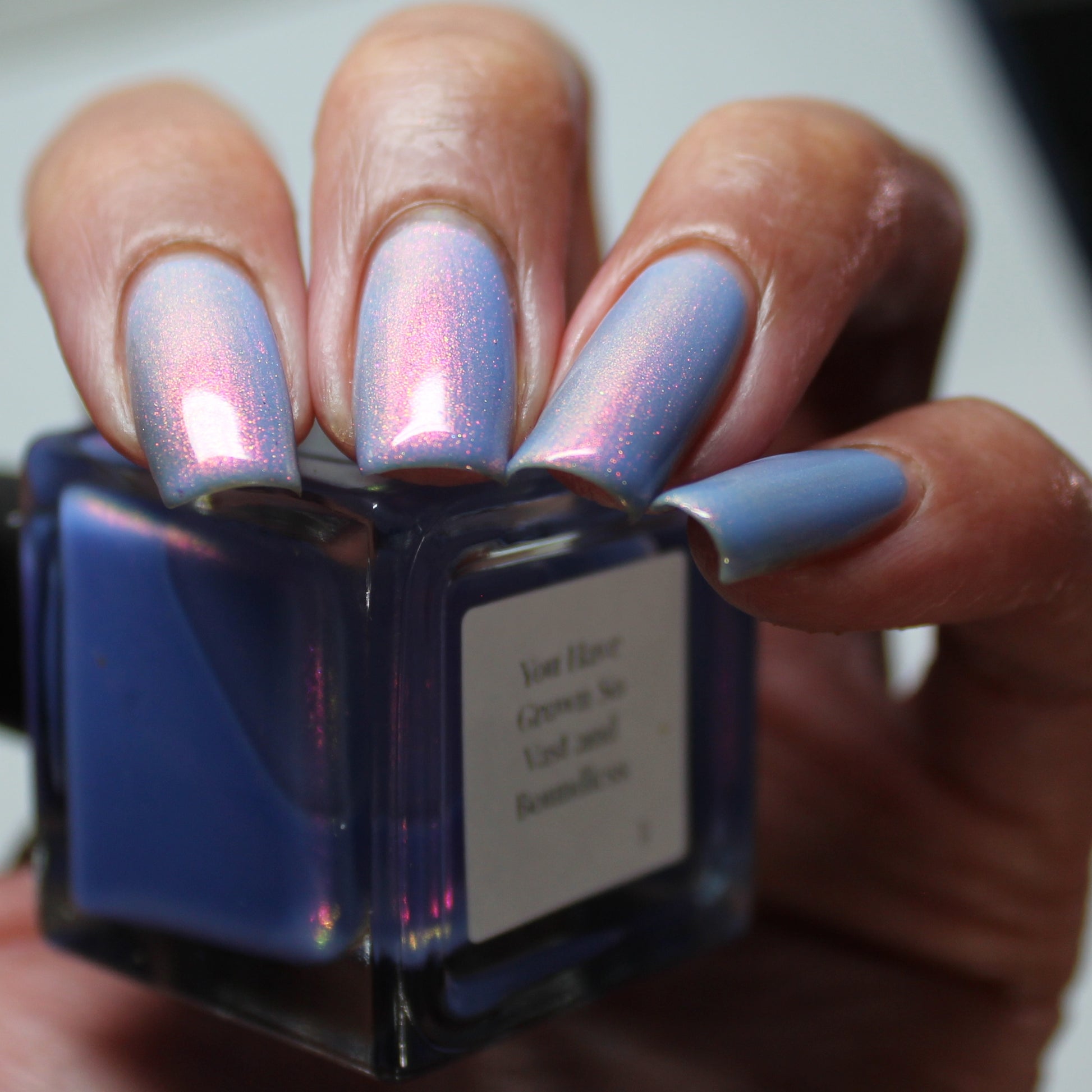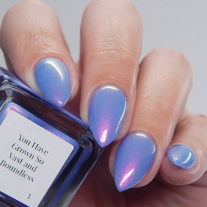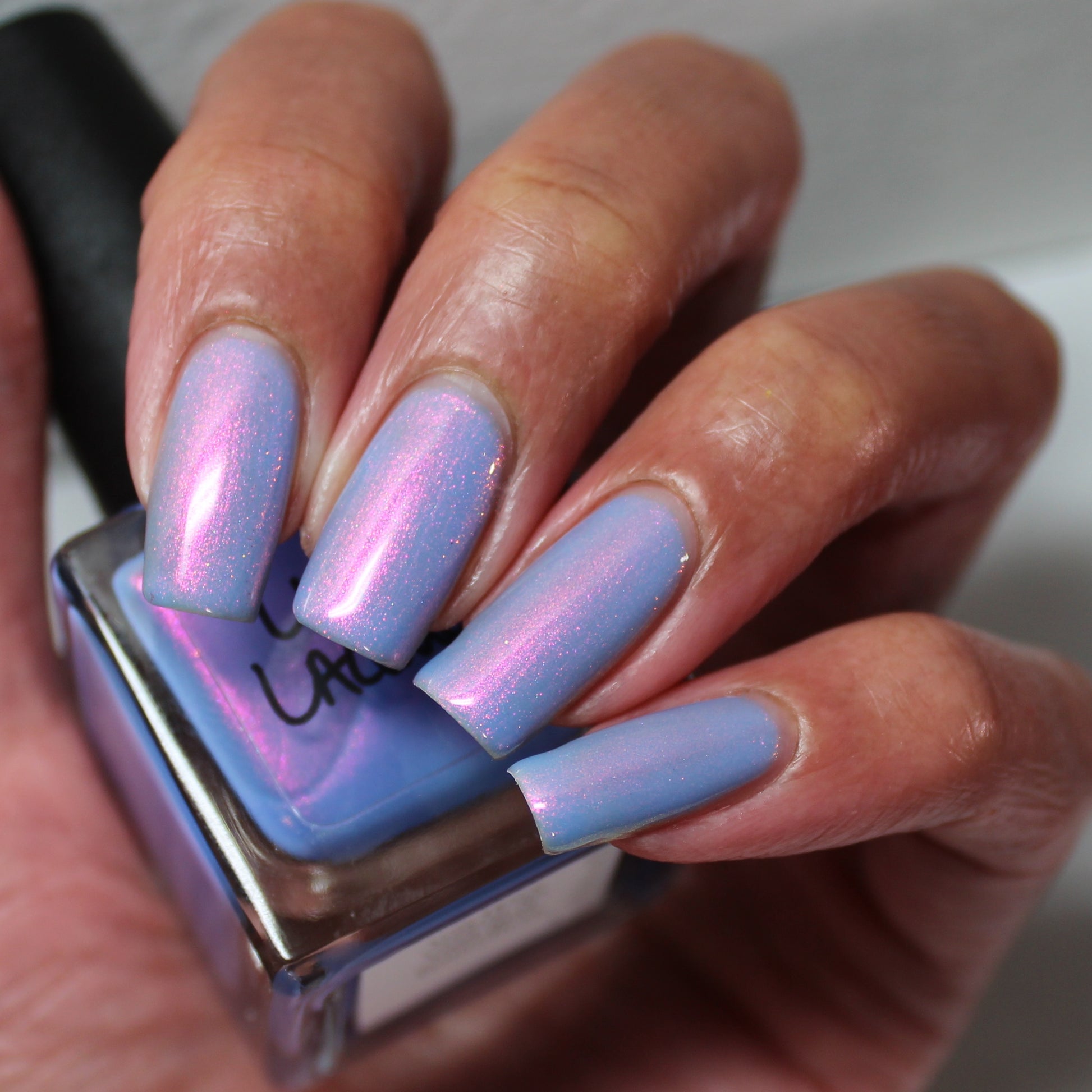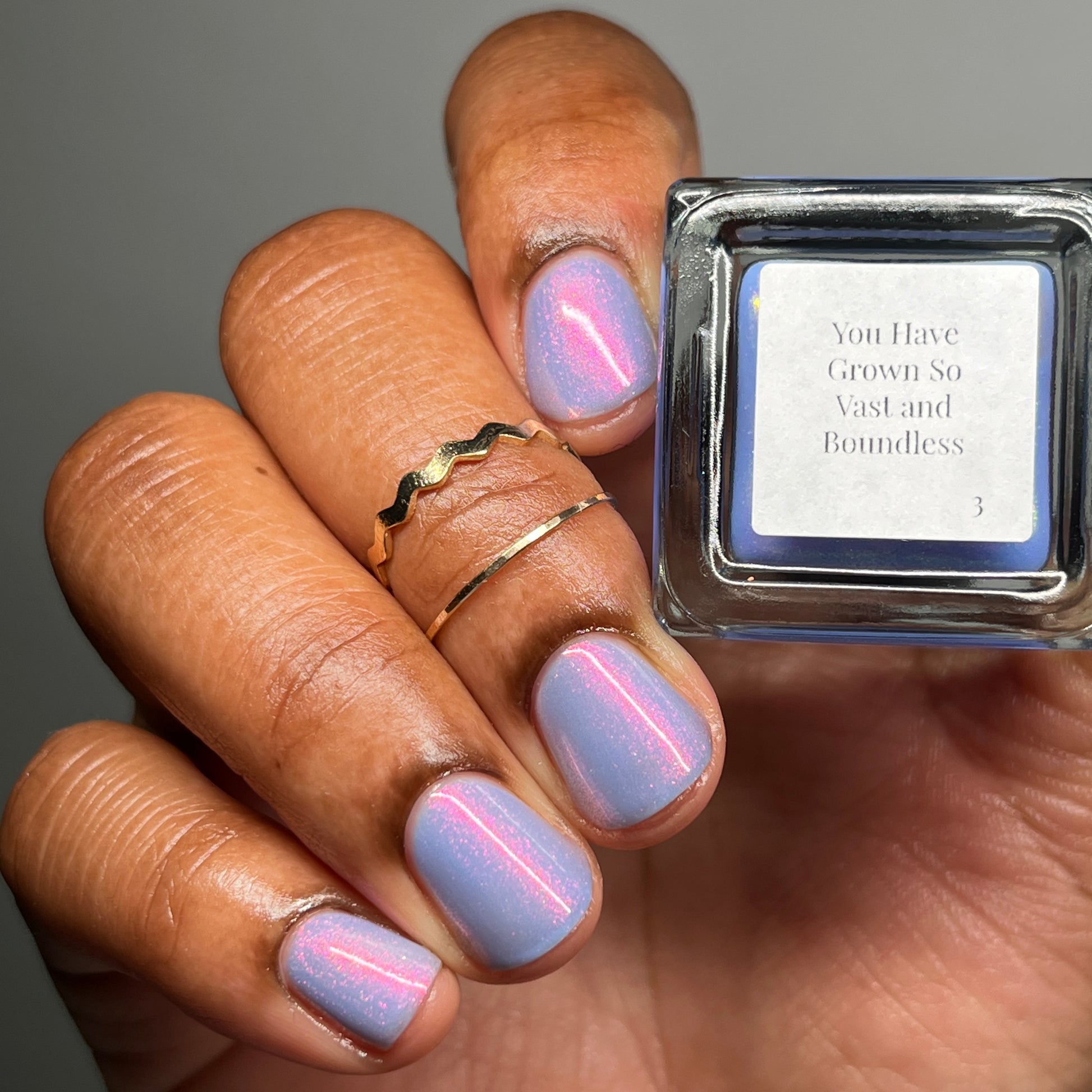 A periwinkle base with pink to orange to gold aurora shimmer that shifts to green at extremes